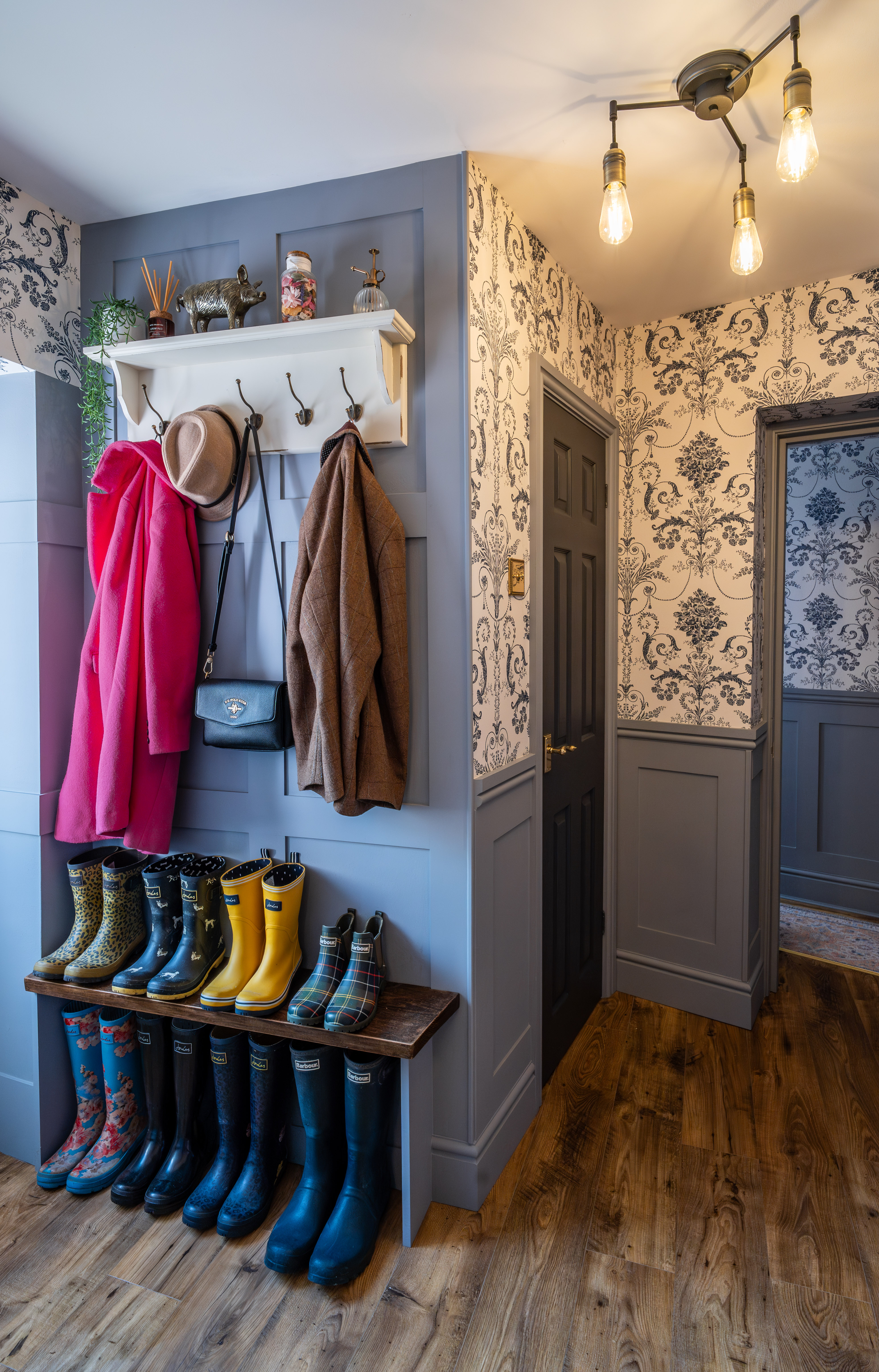 The boot room is a beautifully designed and highly practical space, perfectly suited to modern family living. Thoughtfully fitted with bespoke-style panelling, it offers a charming yet functional area for everyday organisation. A built-in coat rack with overhead shelving provides ample storage for outerwear and accessories, while a sturdy bench with integrated shoe storage below keeps footwear neatly arranged.