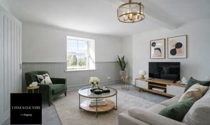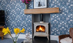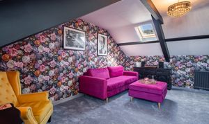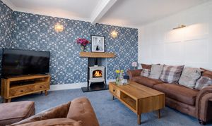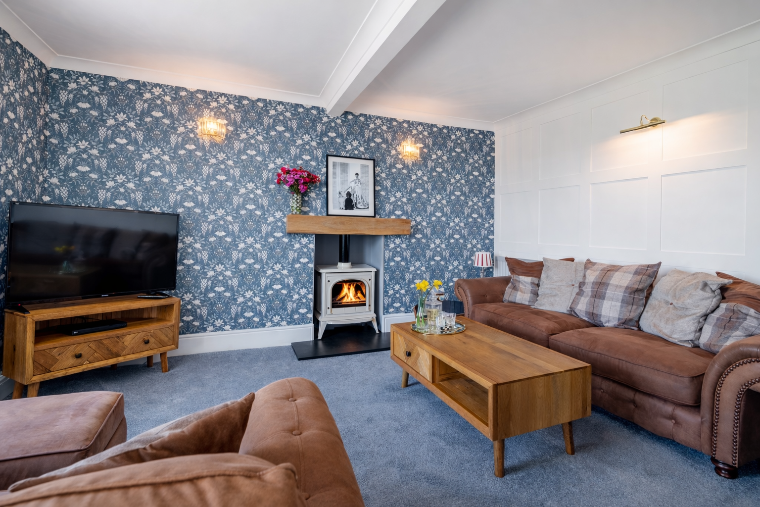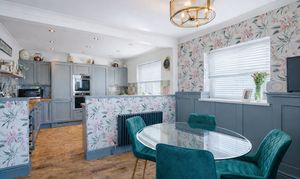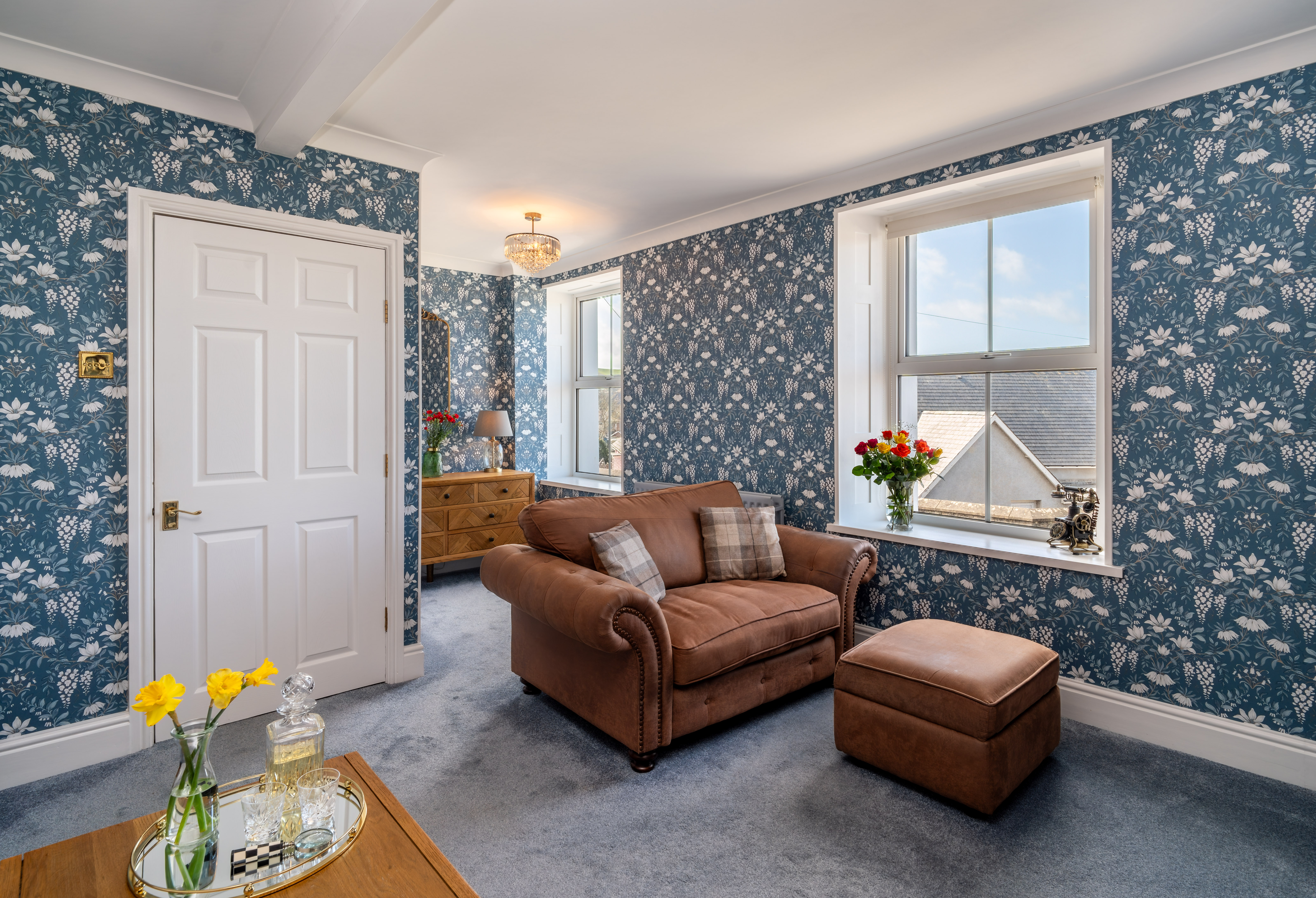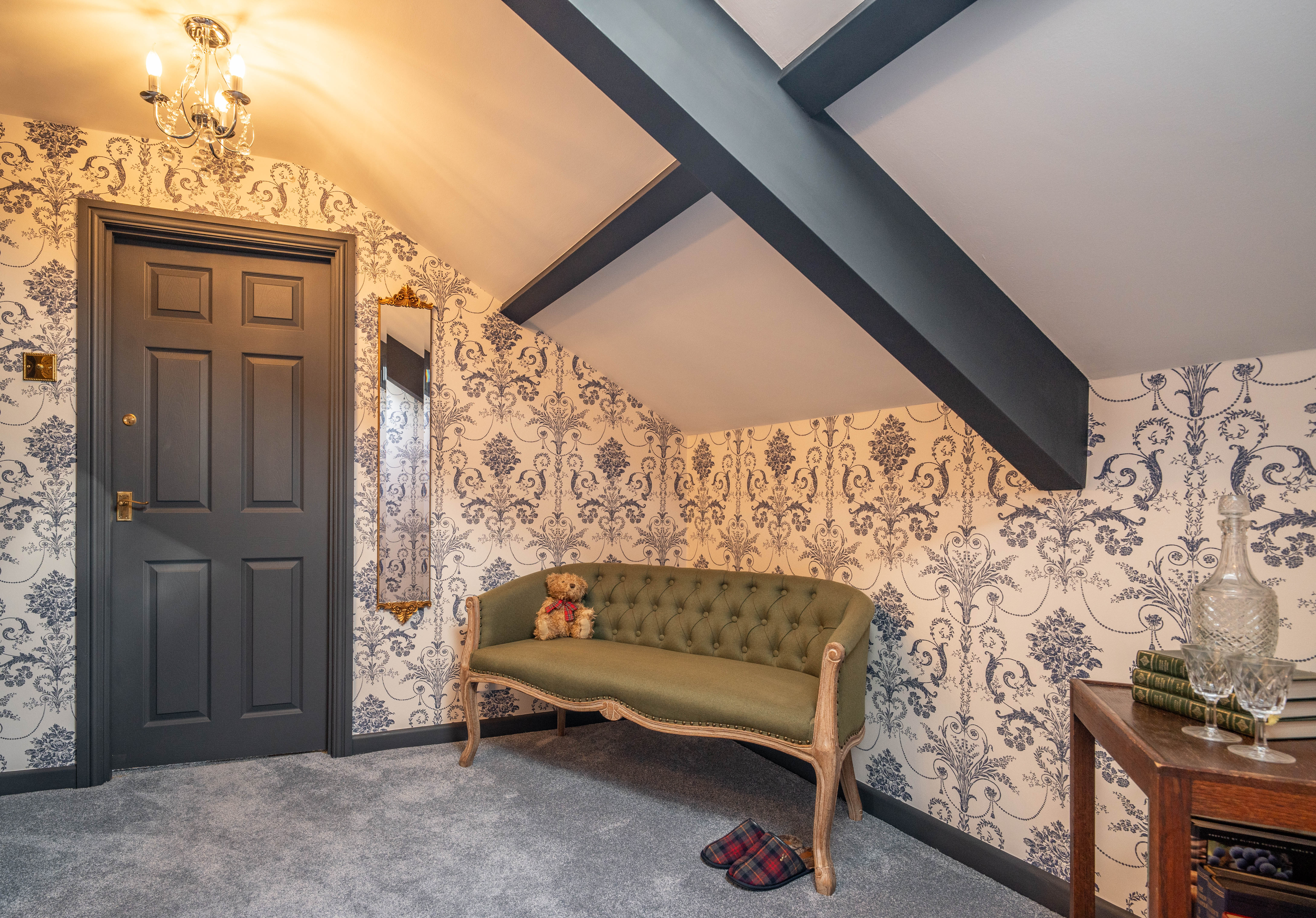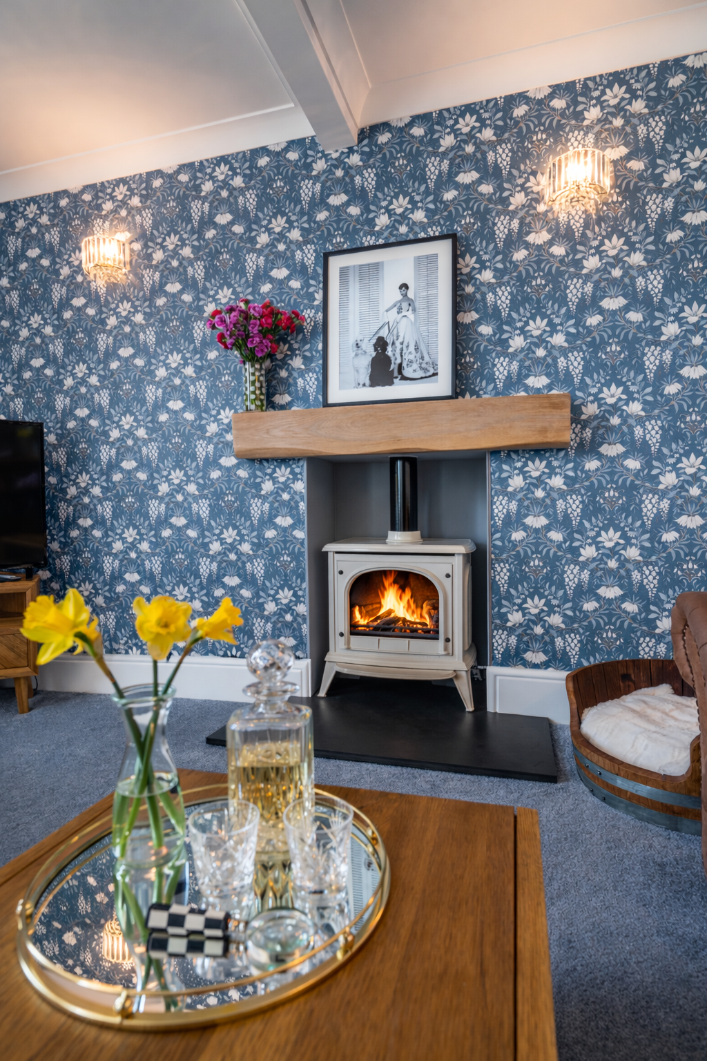 This beautifully presented sitting room offers a warm and inviting space, combining classic charm with elegant contemporary finishes. The room is centred around a stylish Gazco ivory LPG fire, set upon a slate hearth and topped with a striking French oak beam, creating a cosy focal point ideal for relaxing evenings. The walls are adorned with Laura Ashley’s Parterre Dark Seaspray wallpaper, adding depth and character with its timeless botanical design, while coordinating Laura Ashley crystal wall and ceiling lights provide a soft, ambient glow that enhances the room’s welcoming atmosphere.