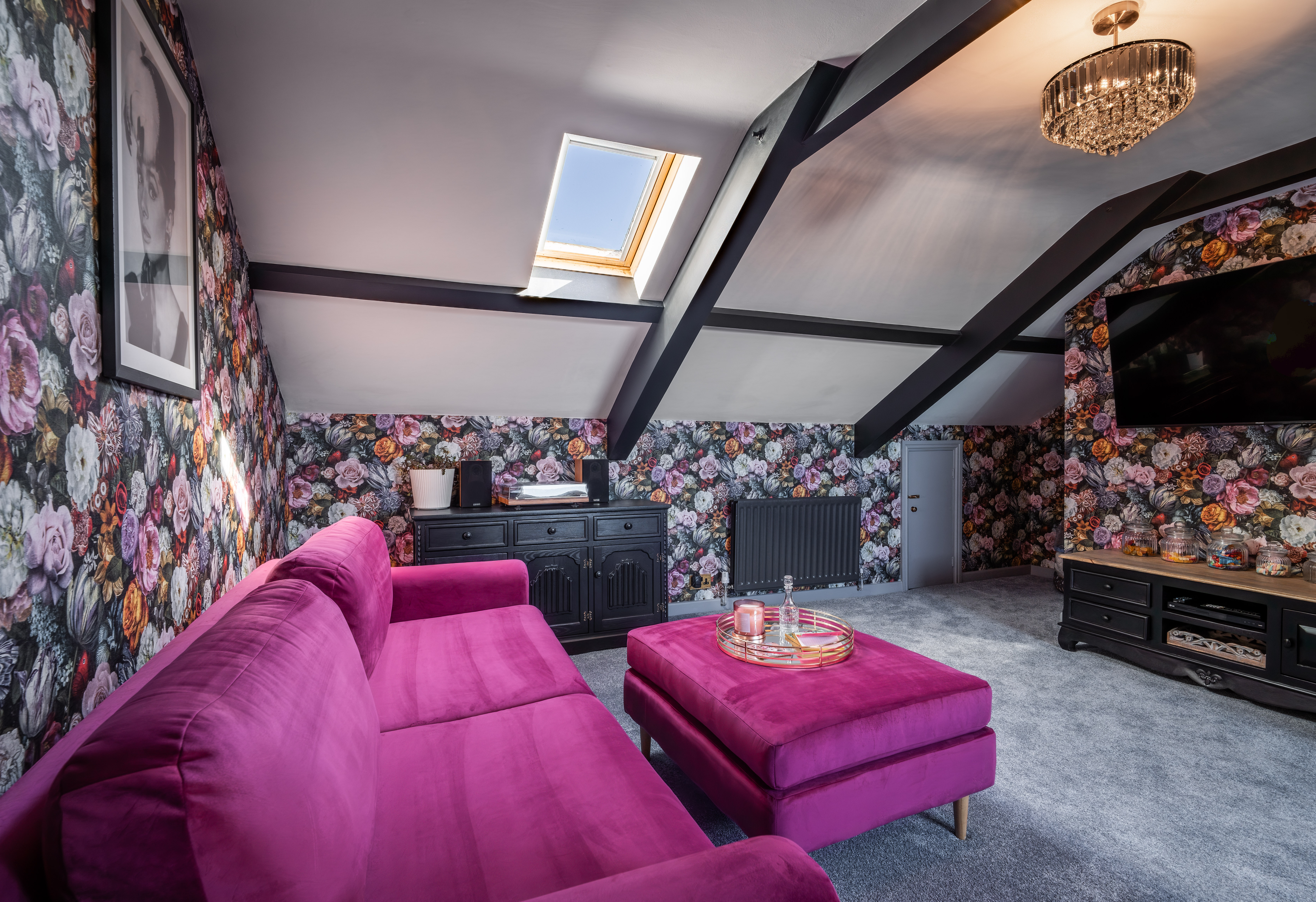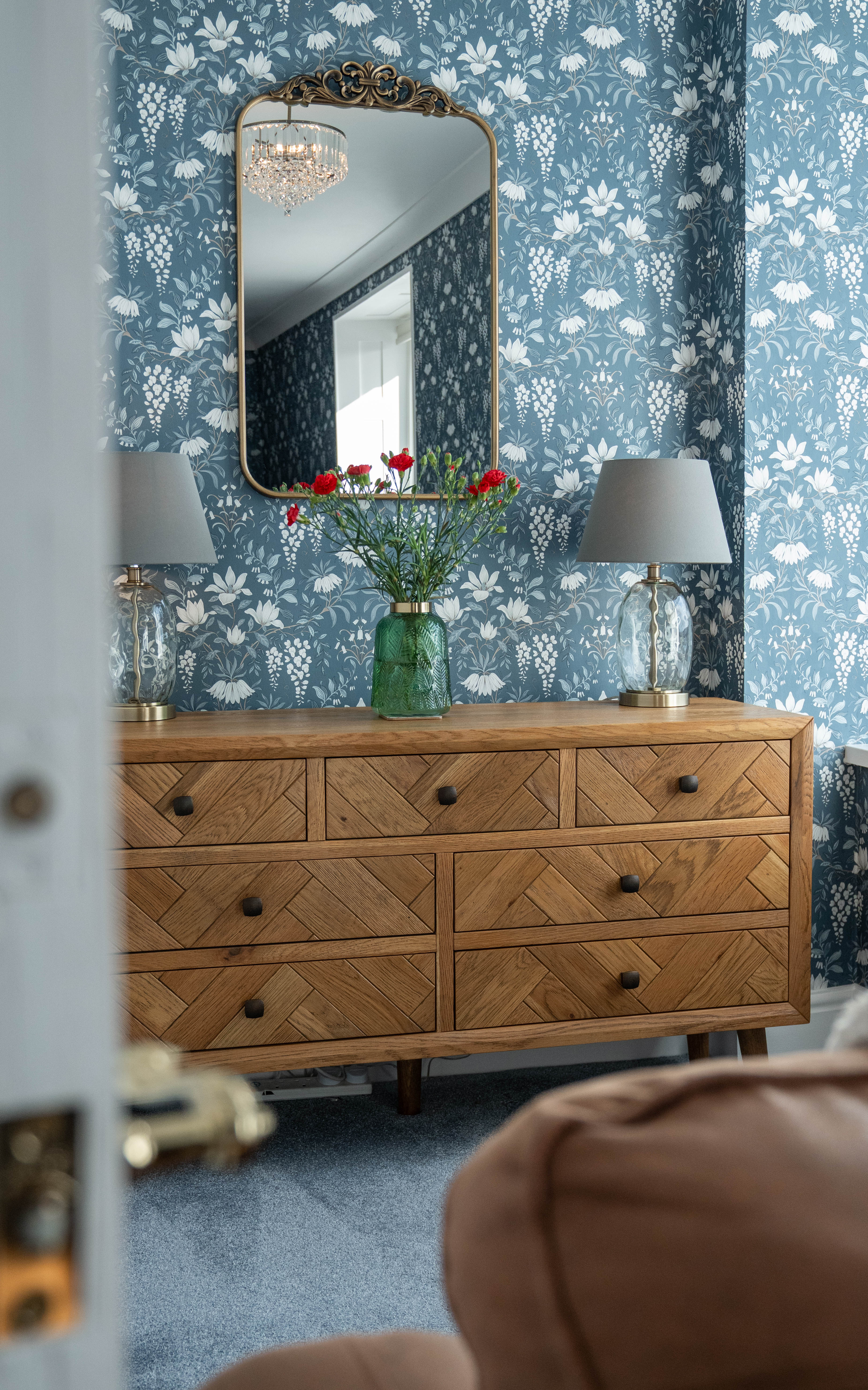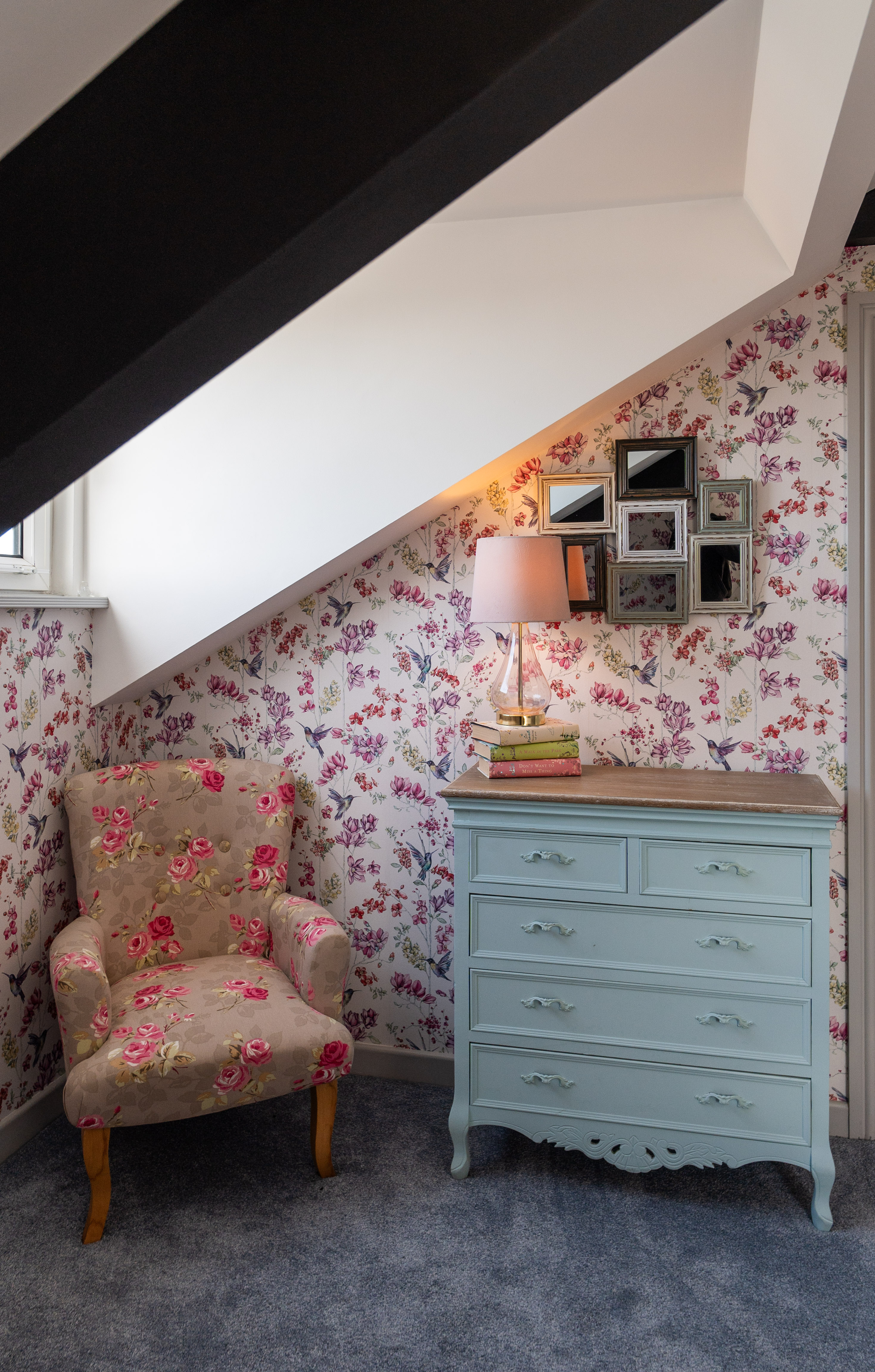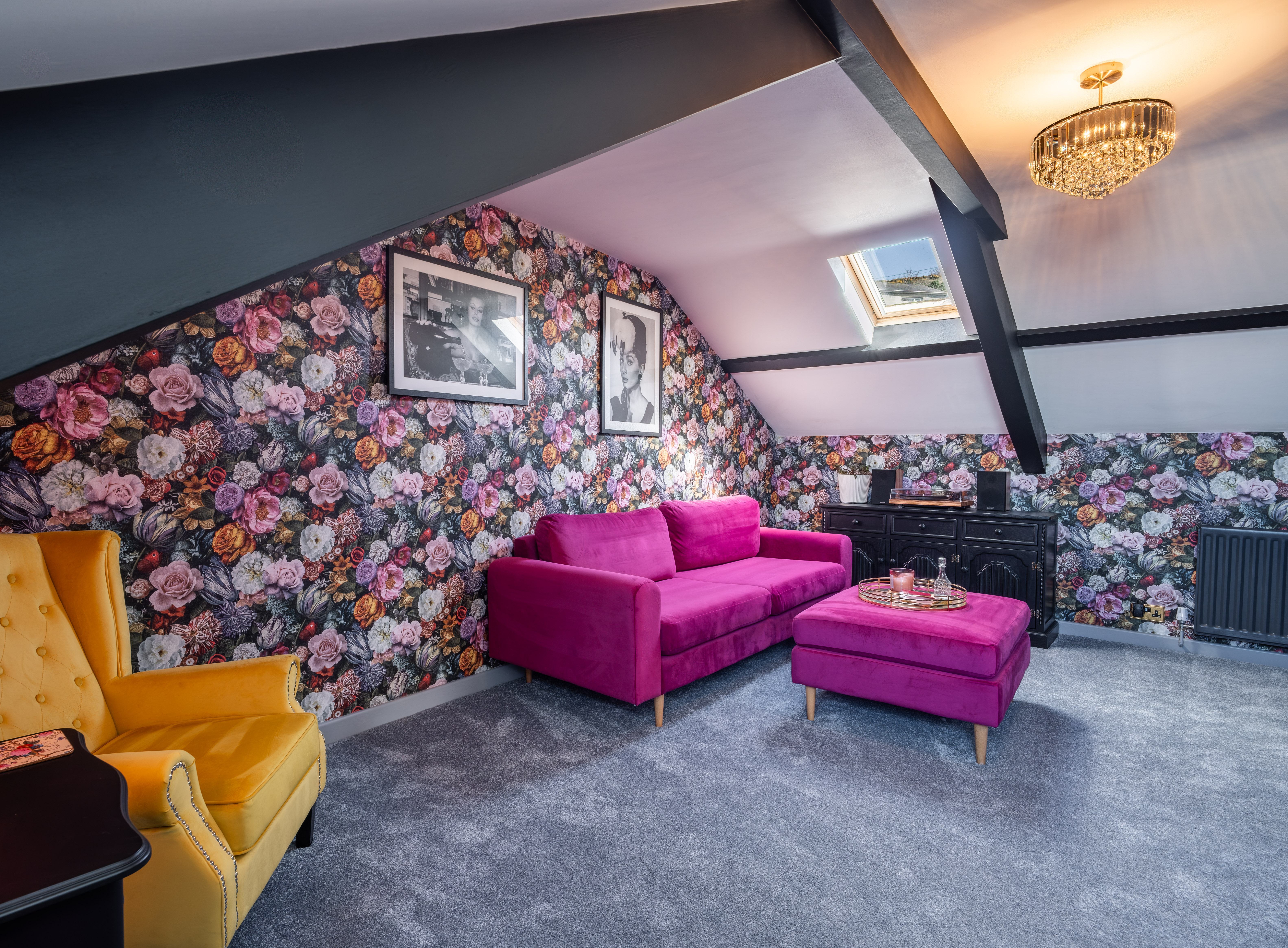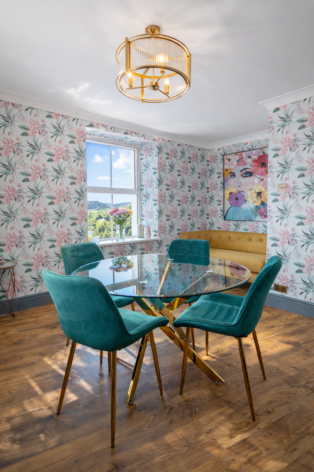 This beautifully presented sitting room offers a warm and inviting space, combining classic charm with elegant contemporary finishes. The room is centred around a stylish Gazco ivory LPG fire, set upon a slate hearth and topped with a striking French oak beam, creating a cosy focal point ideal for relaxing evenings. The walls are adorned with Laura Ashley’s Parterre Dark Seaspray wallpaper, adding depth and character with its timeless botanical design, while coordinating Laura Ashley crystal wall and ceiling lights provide a soft, ambient glow that enhances the room’s welcoming atmosphere.