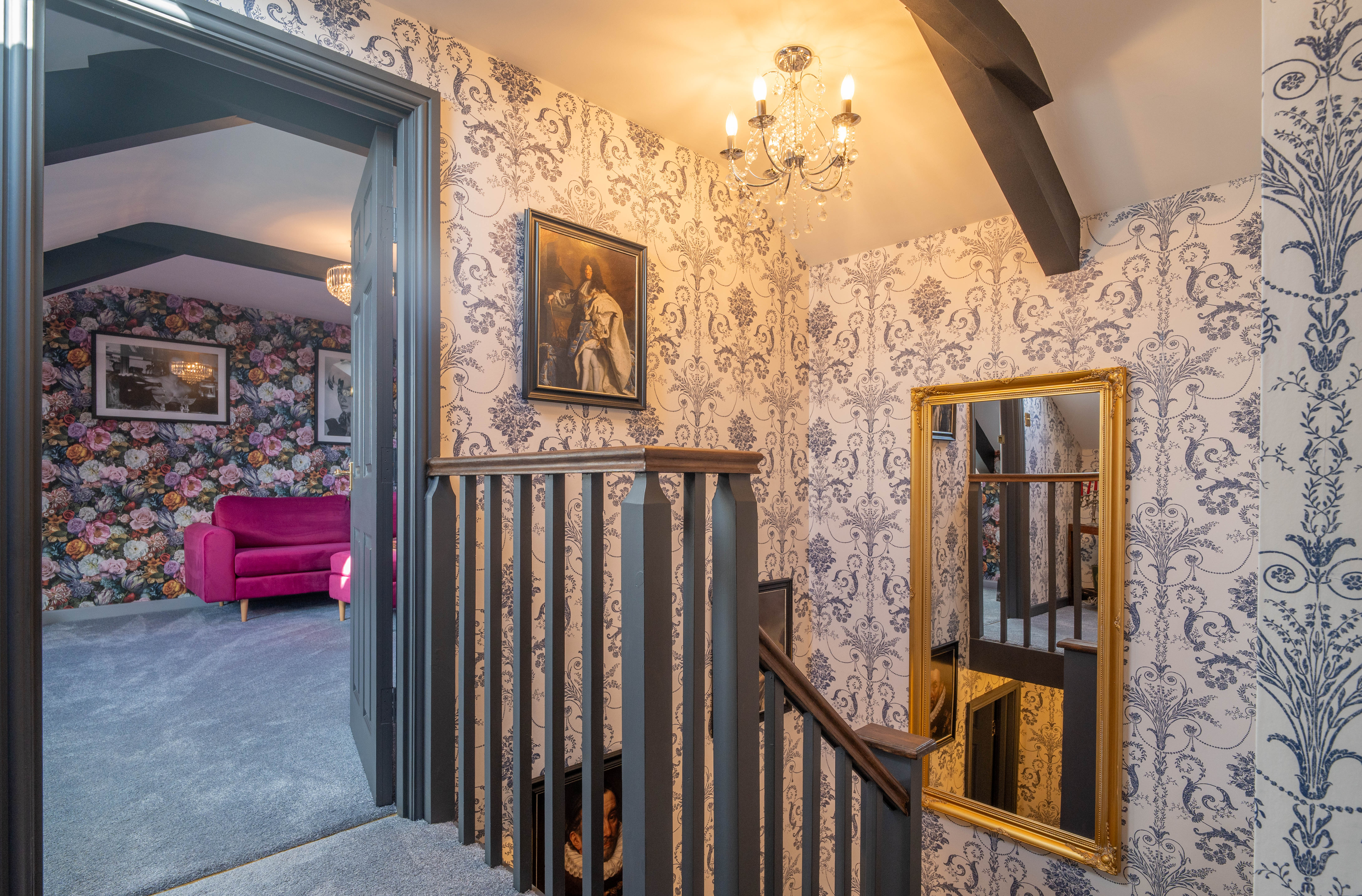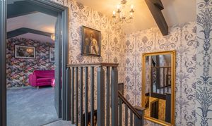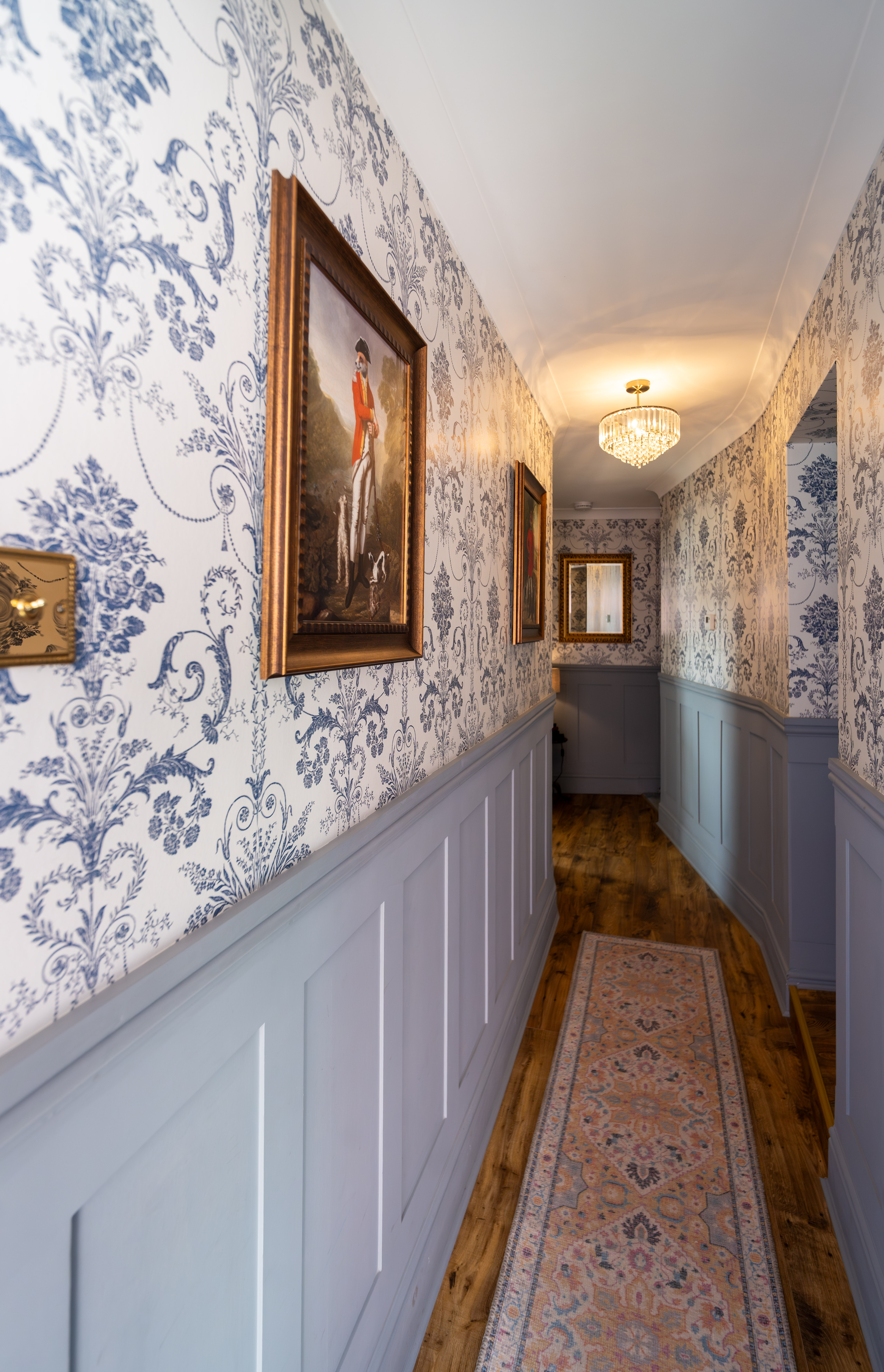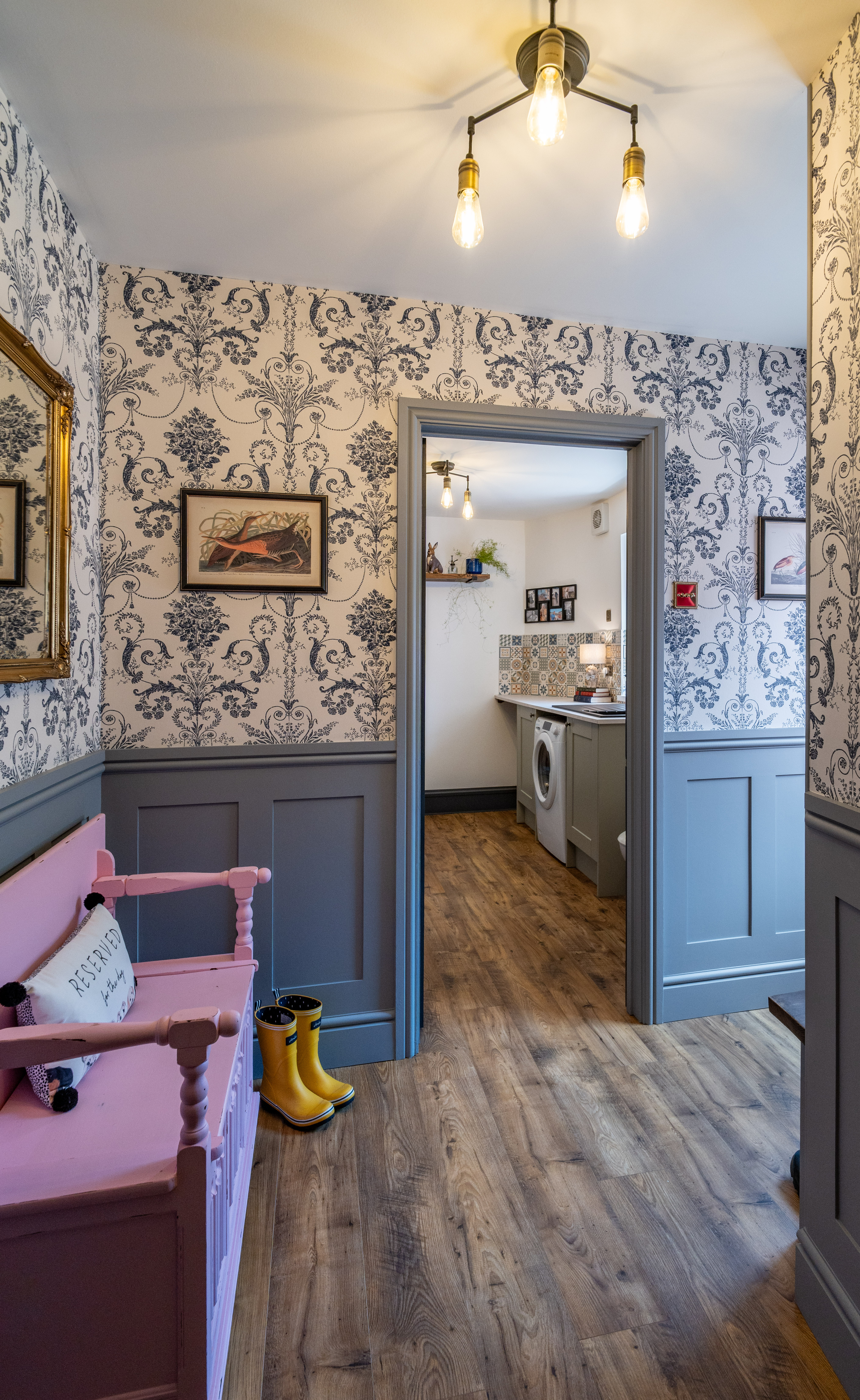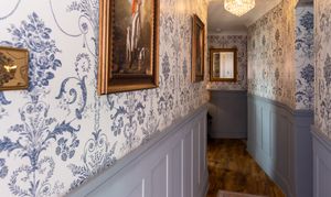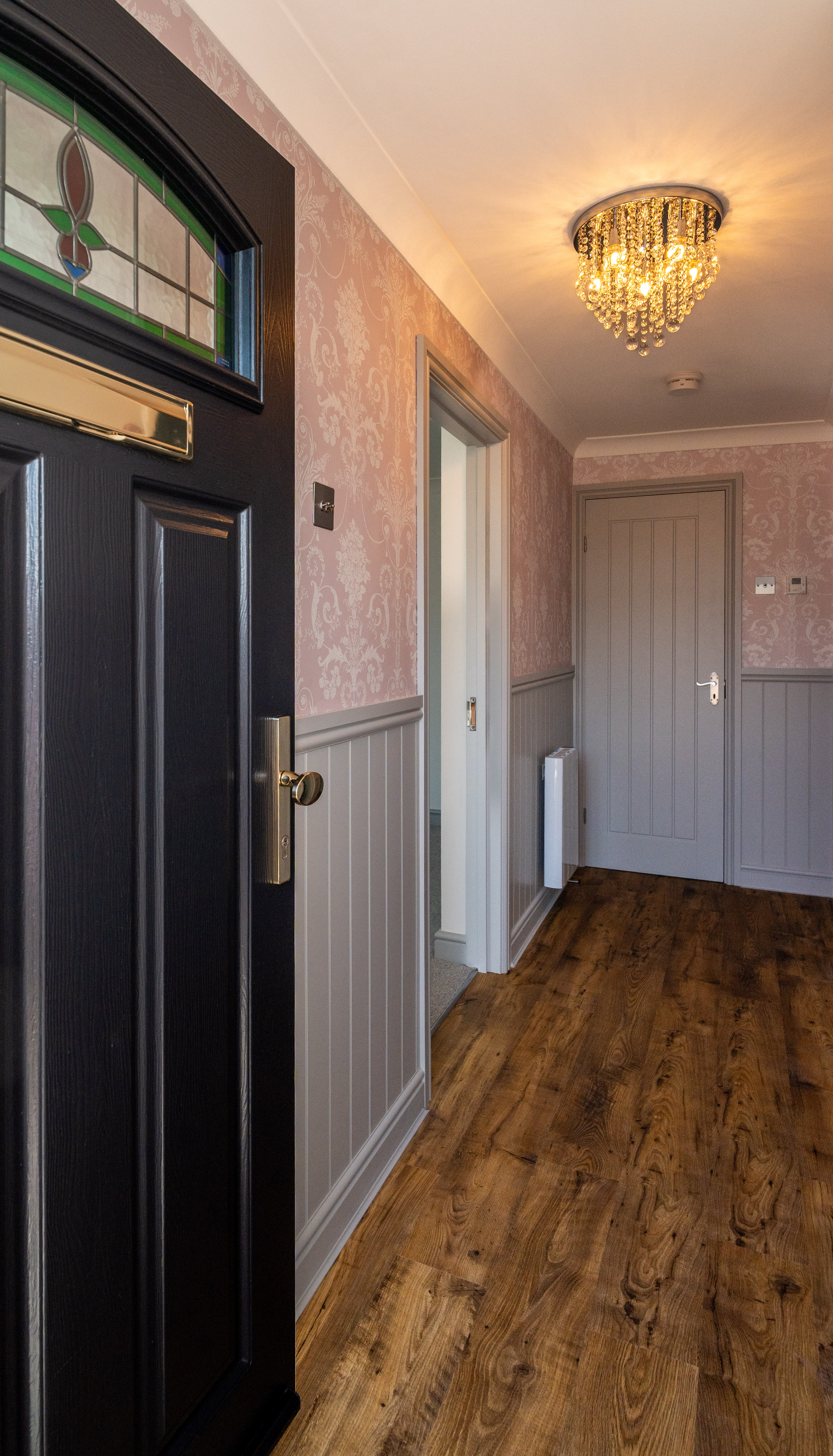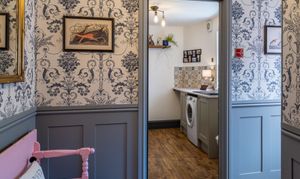 The entrance hall provides an elegant introduction to the home, showcasing a timeless blend of classic design and high-quality finishes. Extending across three floors, the space is beautifully dressed in Laura Ashley’s Josette Off White & Midnight wallpaper, creating a sophisticated and cohesive aesthetic throughout. A striking Laura Ashley crystal glass ceiling light adds a touch of luxury, casting a warm and inviting glow over the hallway. The lower walls are complemented by stylish panelling, enhancing the property’s character and period-inspired charm, while a traditional four-column radiator further reinforces the classic design. Practicality is equally well considered, with a useful understairs storage cupboard offering convenient space for everyday essentials. The hallway is finished with durable and attractive LVT flooring, providing both style and ease of maintenance, and setting the tone for the quality found throughout the home.
