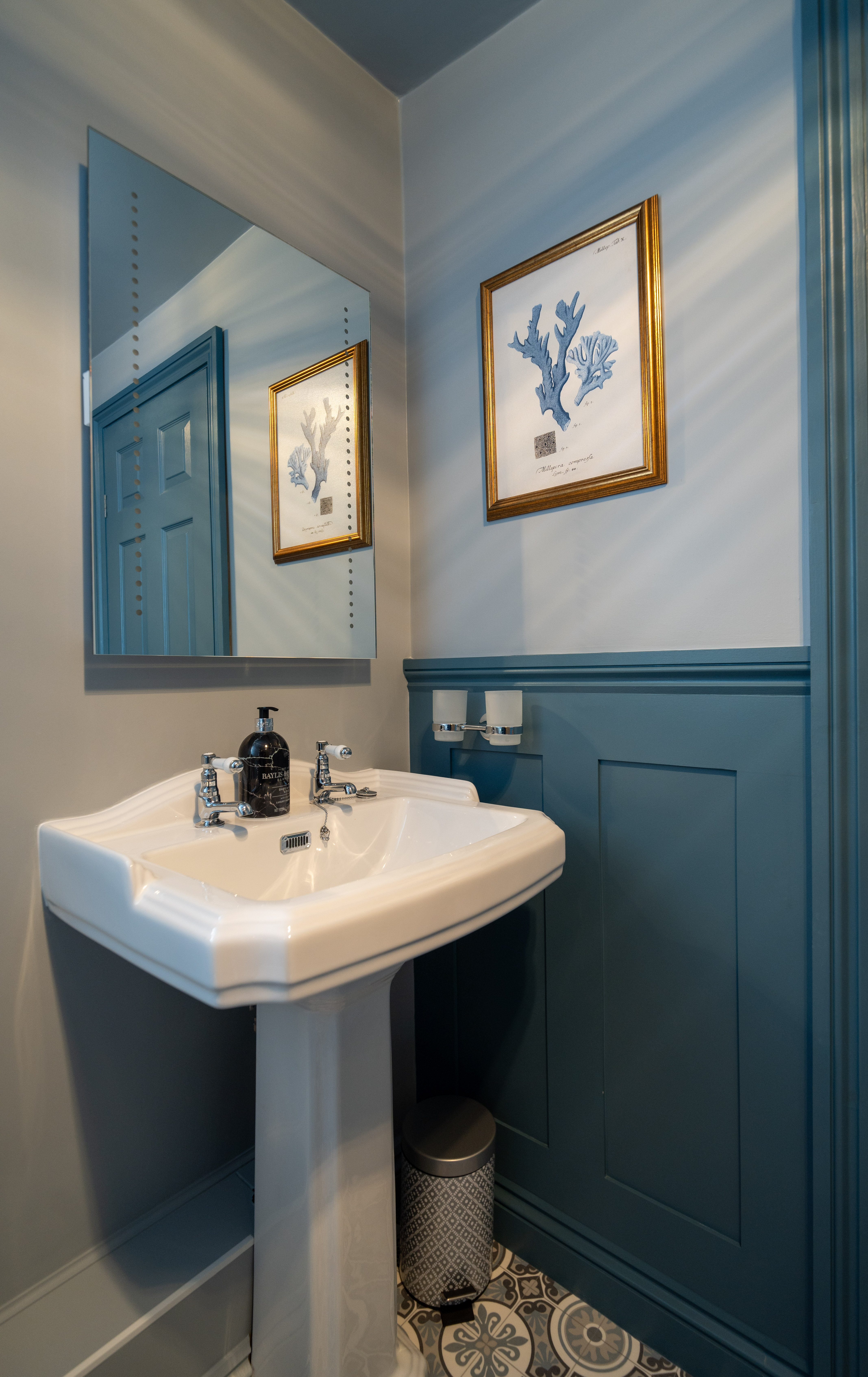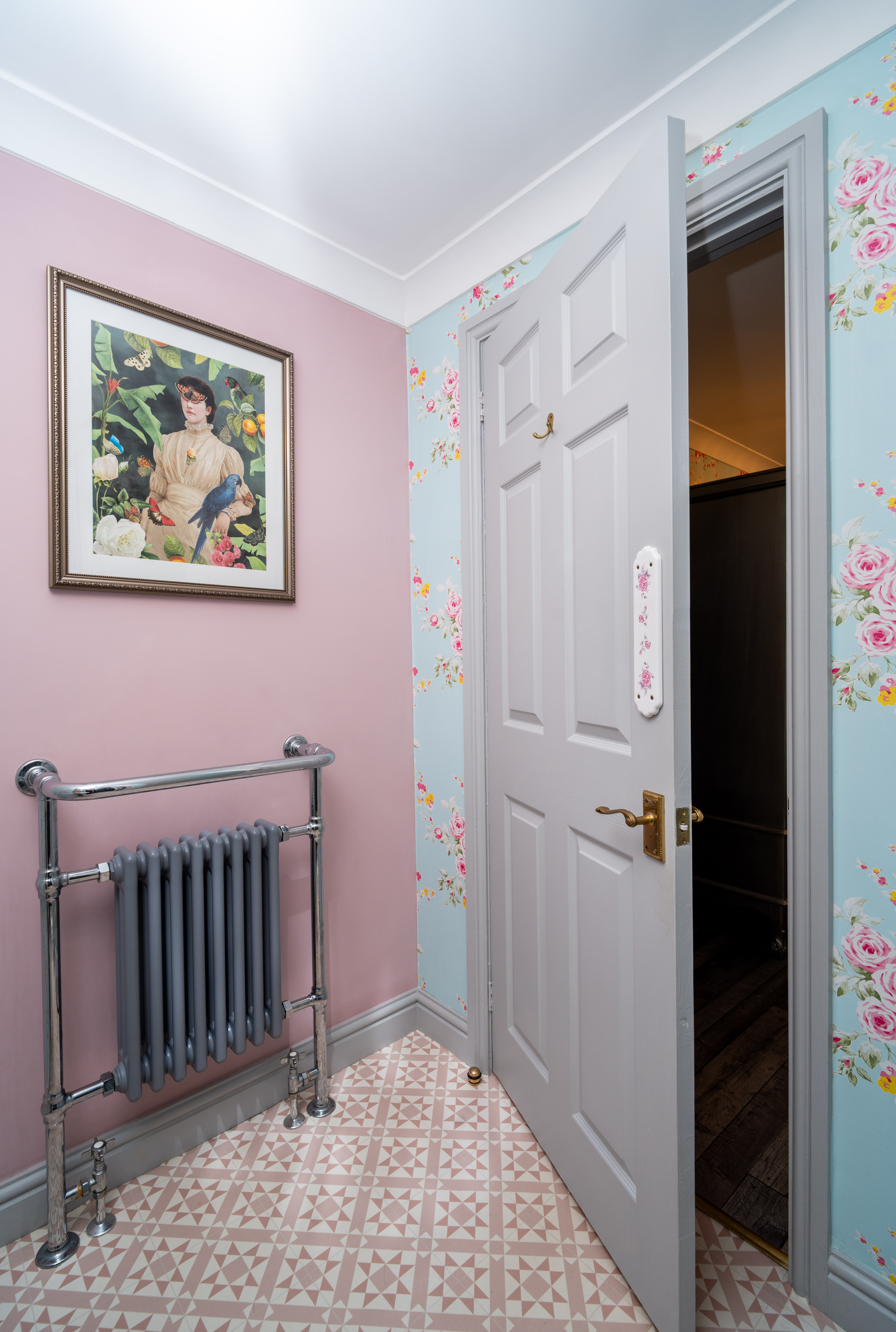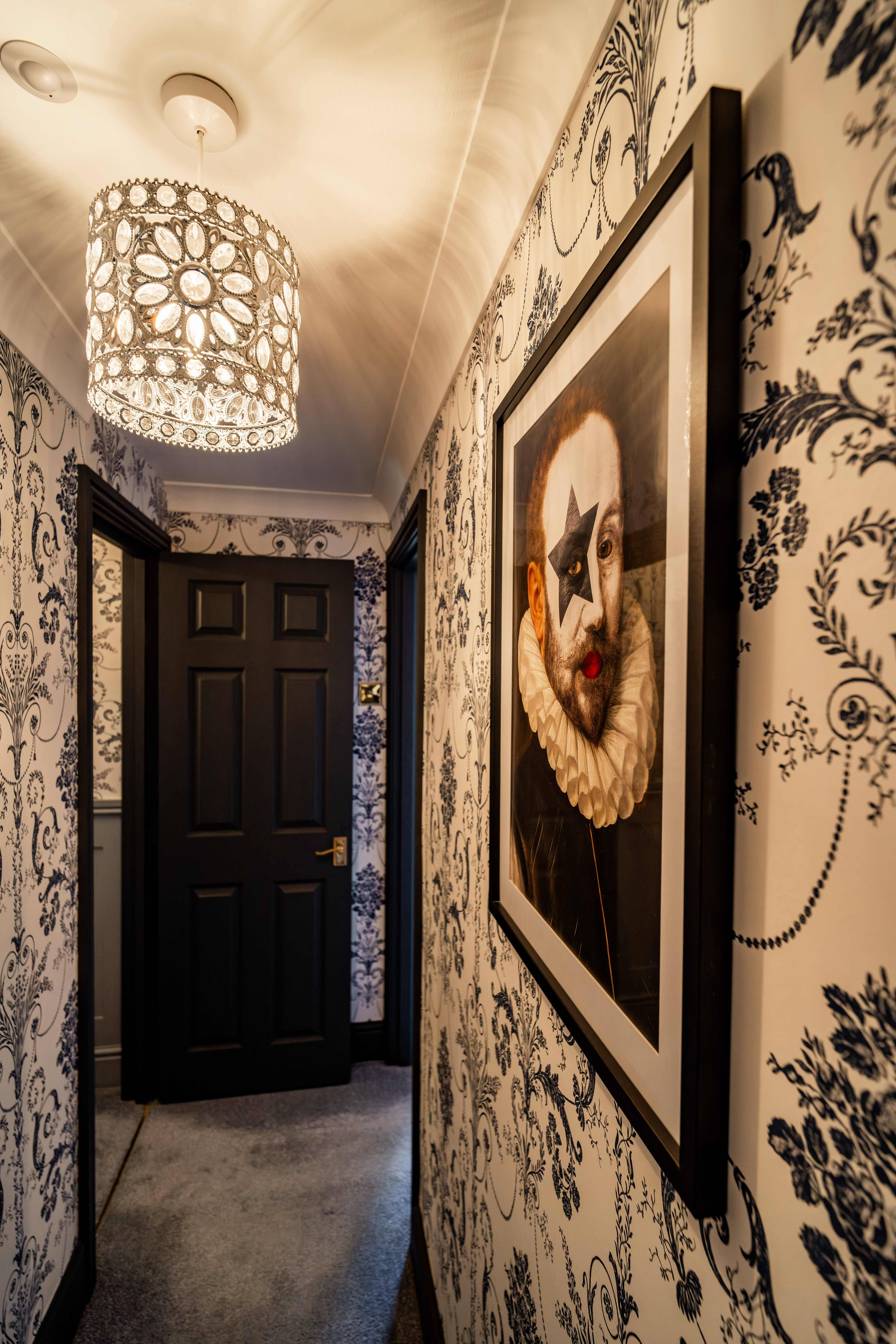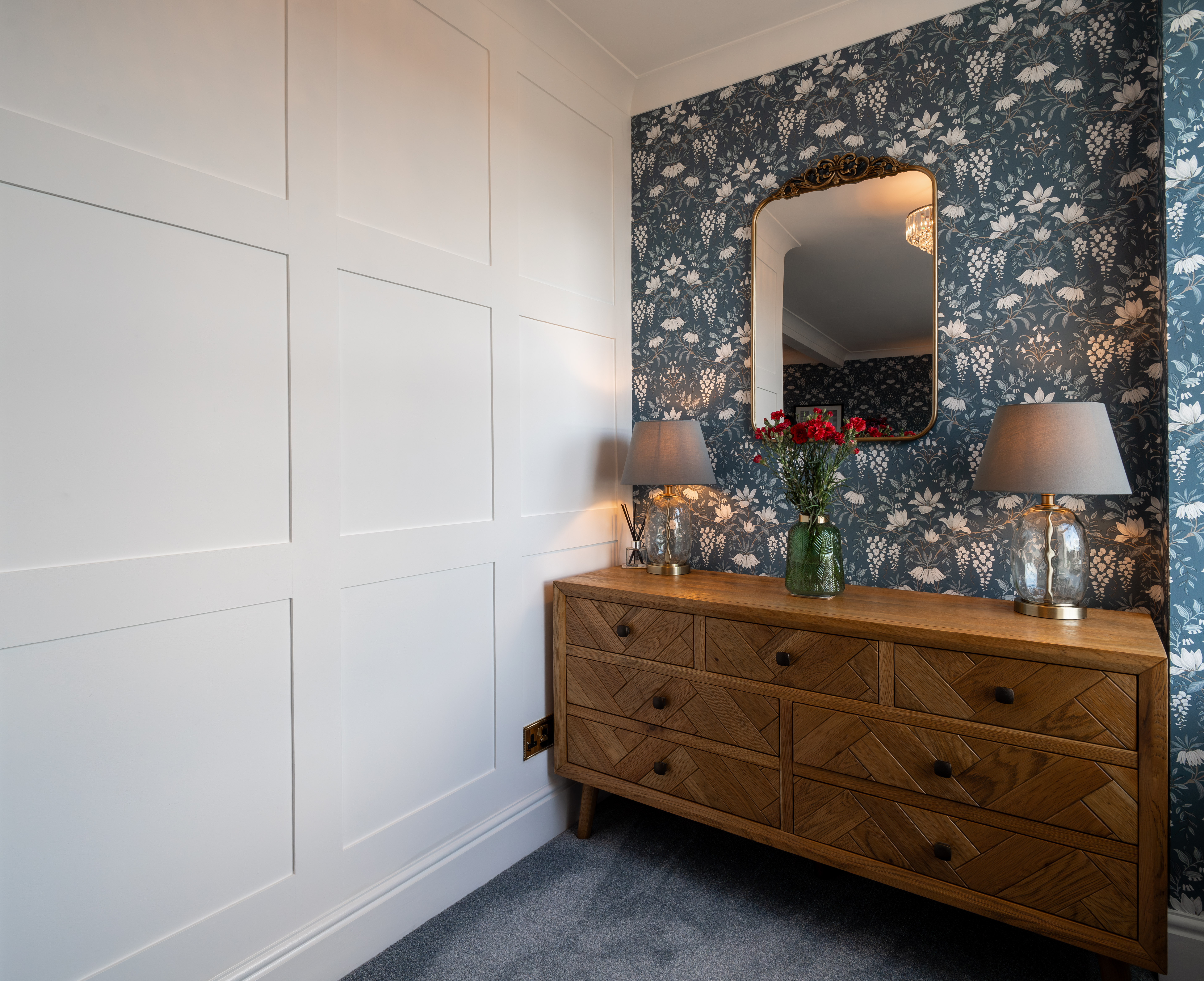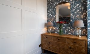 The entrance hall provides an elegant introduction to the home, showcasing a timeless blend of classic design and high-quality finishes. Extending across three floors, the space is beautifully dressed in Laura Ashley’s Josette Off White & Midnight wallpaper, creating a sophisticated and cohesive aesthetic throughout. A striking Laura Ashley crystal glass ceiling light adds a touch of luxury, casting a warm and inviting glow over the hallway. The lower walls are complemented by stylish panelling, enhancing the property’s character and period-inspired charm, while a traditional four-column radiator further reinforces the classic design. Practicality is equally well considered, with a useful understairs storage cupboard offering convenient space for everyday essentials. The hallway is finished with durable and attractive LVT flooring, providing both style and ease of maintenance, and setting the tone for the quality found throughout the home.