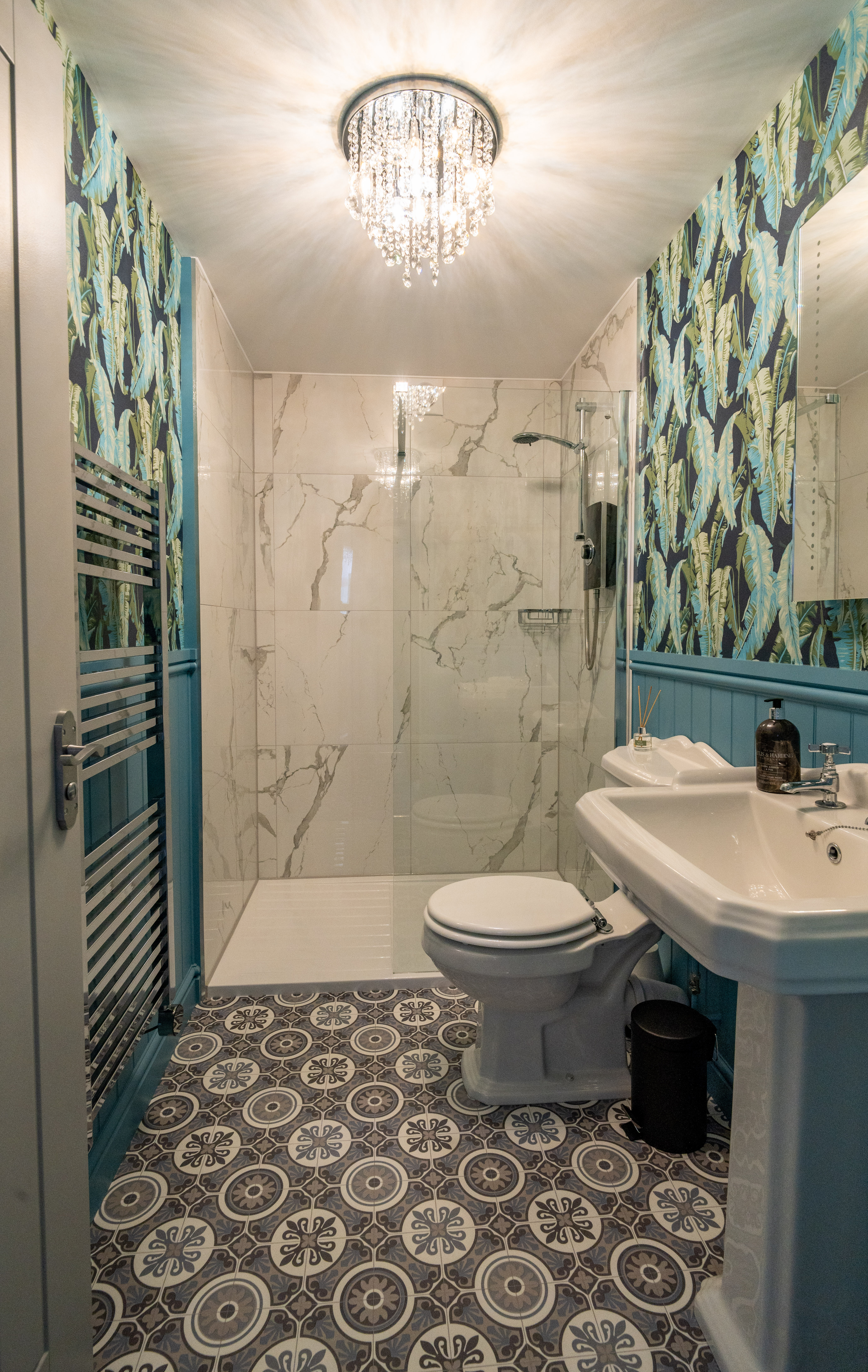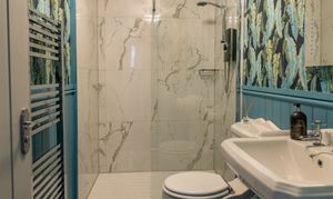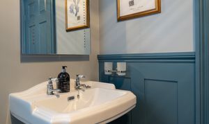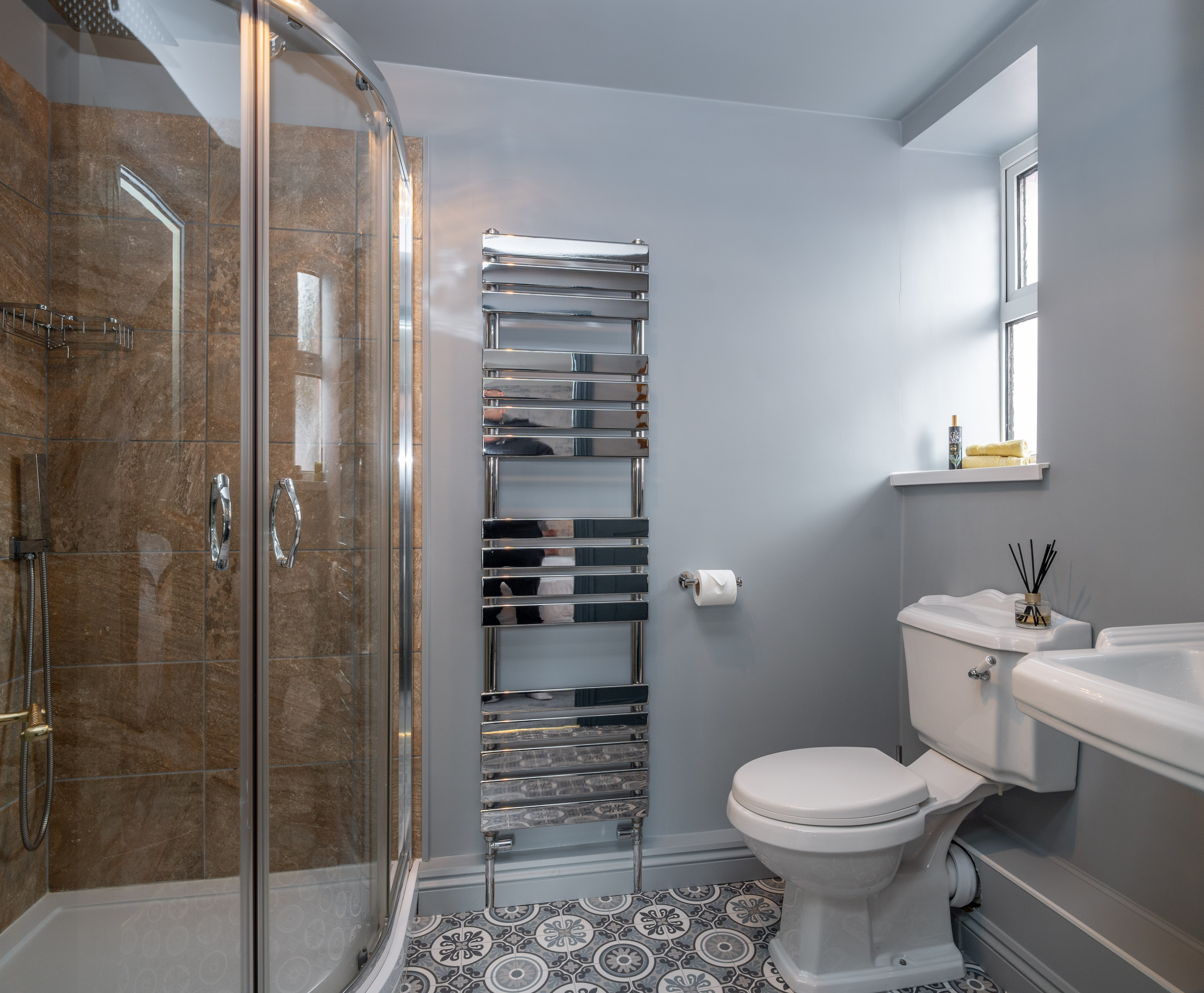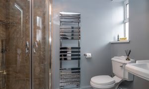 Bedroom three ensuite is beautifully presented in a classic style, featuring a traditional heated towel rail radiator, heritage Victorian toilet and sink, and a thermostatic rain shower. Finished with tasteful décor and a silent extractor fan, the space combines period charm with modern convenience.