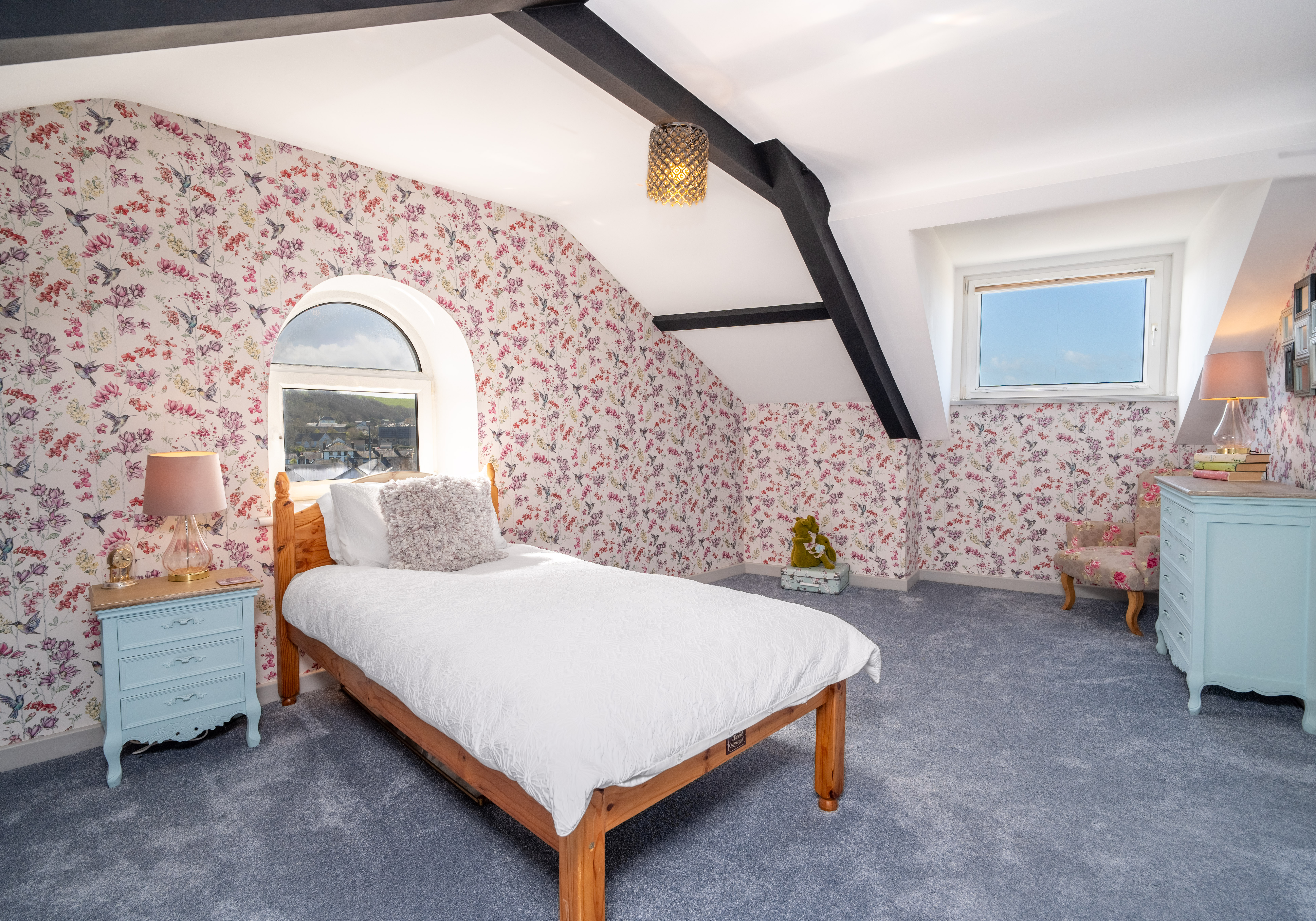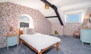 Bedroom five is a charming and well-proportioned dual aspect room, featuring characterful sloping ceilings and exposed beams, complemented by a Velux roof window and attractive arched window that flood the space with natural light while also enjoying stunning sea views across the Cardigan Bay coastline. Beautifully presented with stylish décor, the room offers a cosy yet spacious feel, ideal as a guest bedroom, nursery, or additional home office.