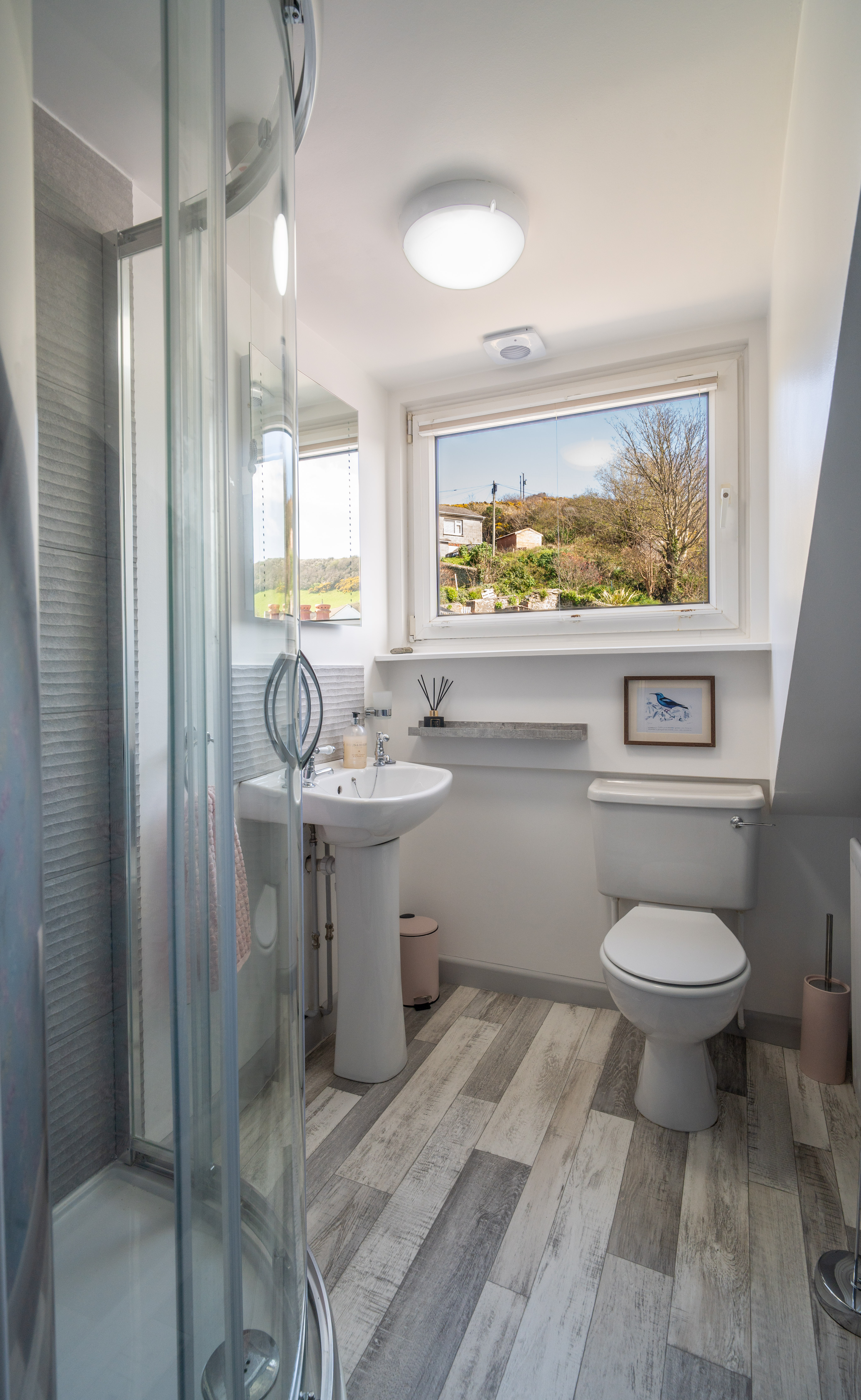 This ensuite is a bright, contemporary space, complete with a corner walk-in Triton electric shower, a pedestal wash hand basin, and a WC. A rear aspect window provides pleasant outlooks and natural light, complemented by a motion sensor LED mirror and extractor fan, with contemporary finishes throughout.