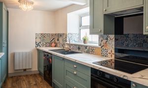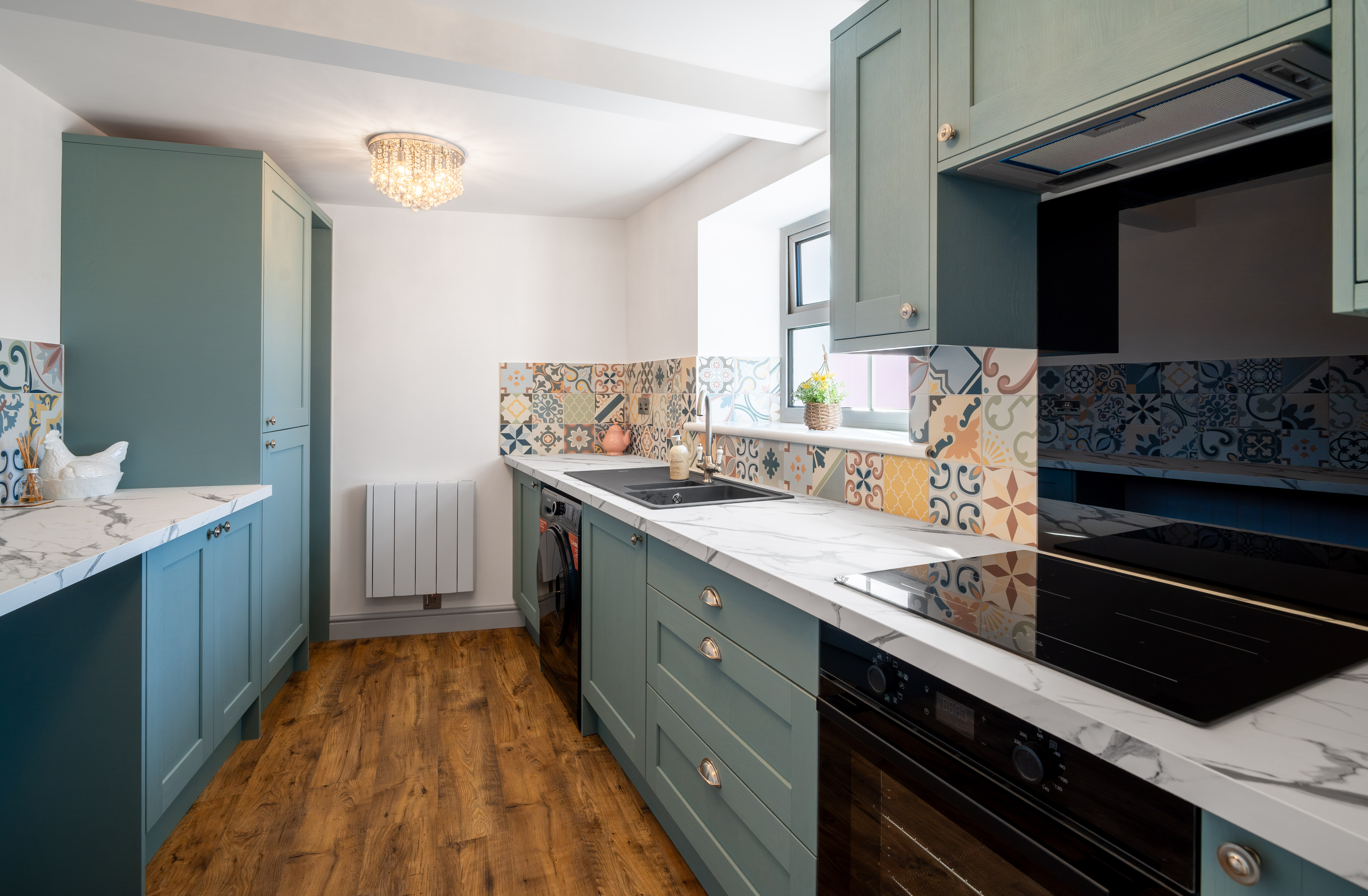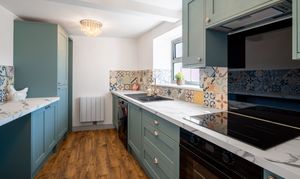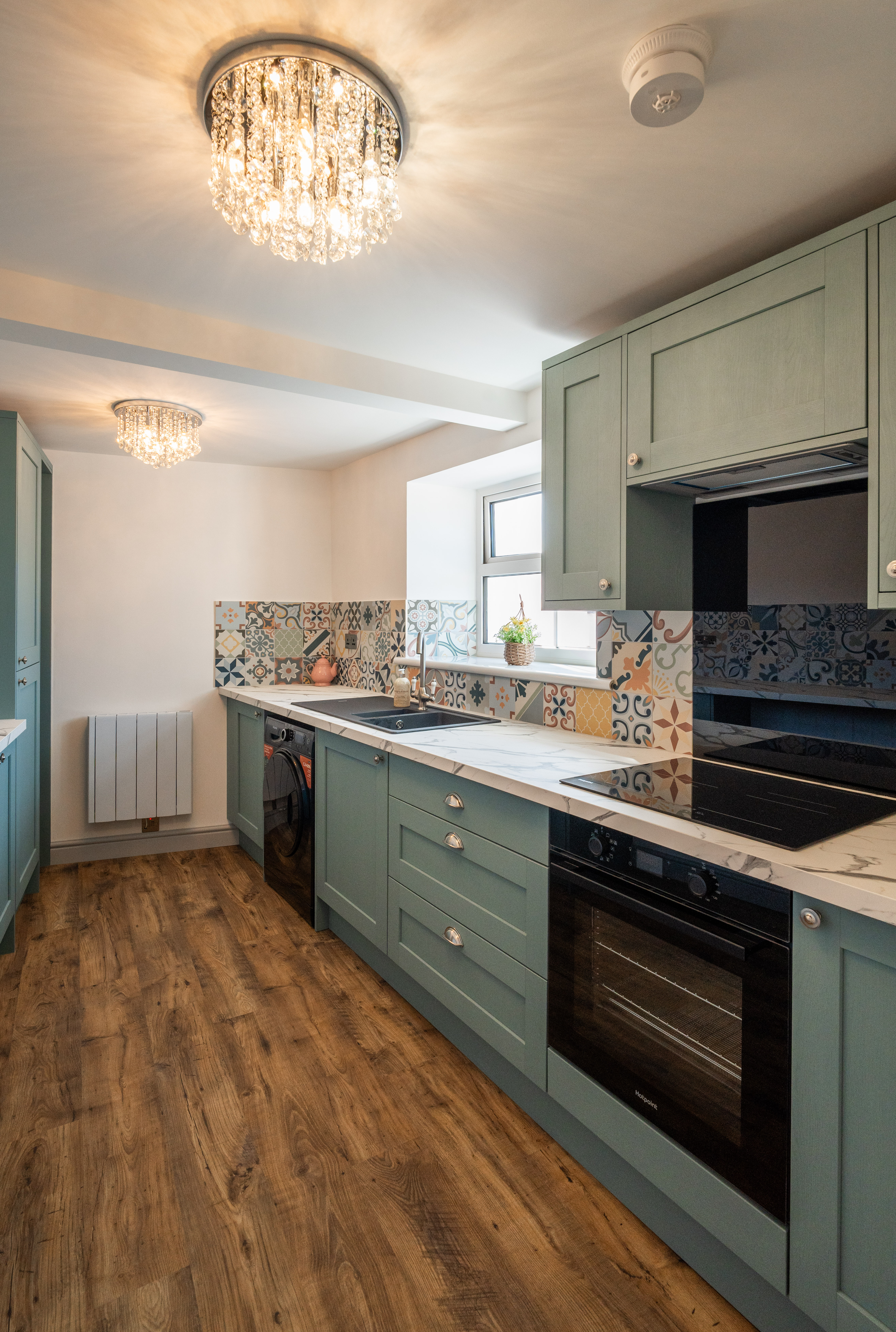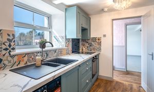 A stylish and well-appointed kitchen fitted with a range of contemporary units and complementary worktops, incorporating an integrated fridge/freezer, integrated cooker hood, induction hob, and a built-in oven with air fryer technology. The kitchen also features a Franke sink, ceramic WiFi-controlled electric radiator, and LVT flooring, with a heat alarm installed for added safety. Finished with attractive tiled splashbacks and modern fittings, this space offers both practicality and a high-quality finish throughout.
