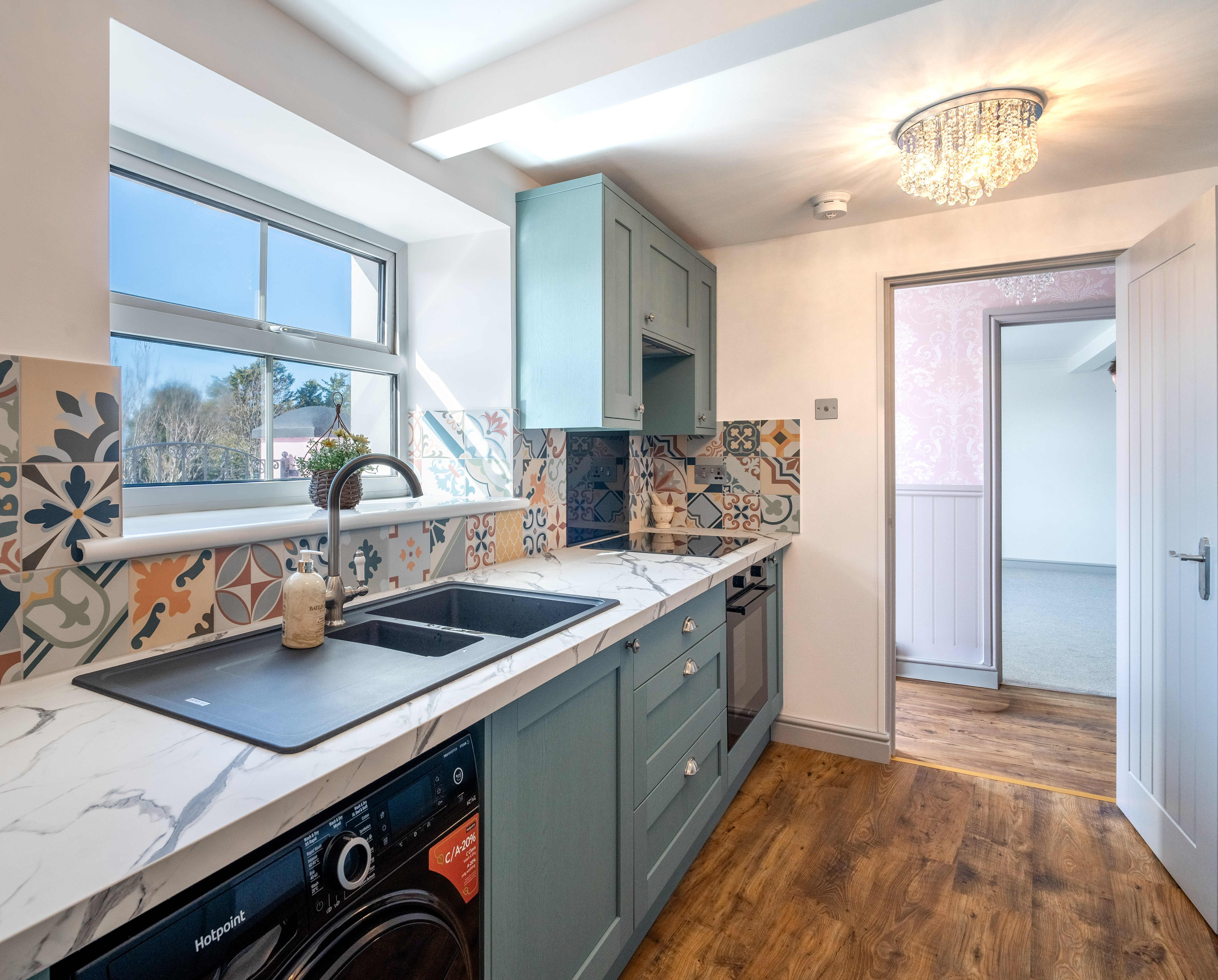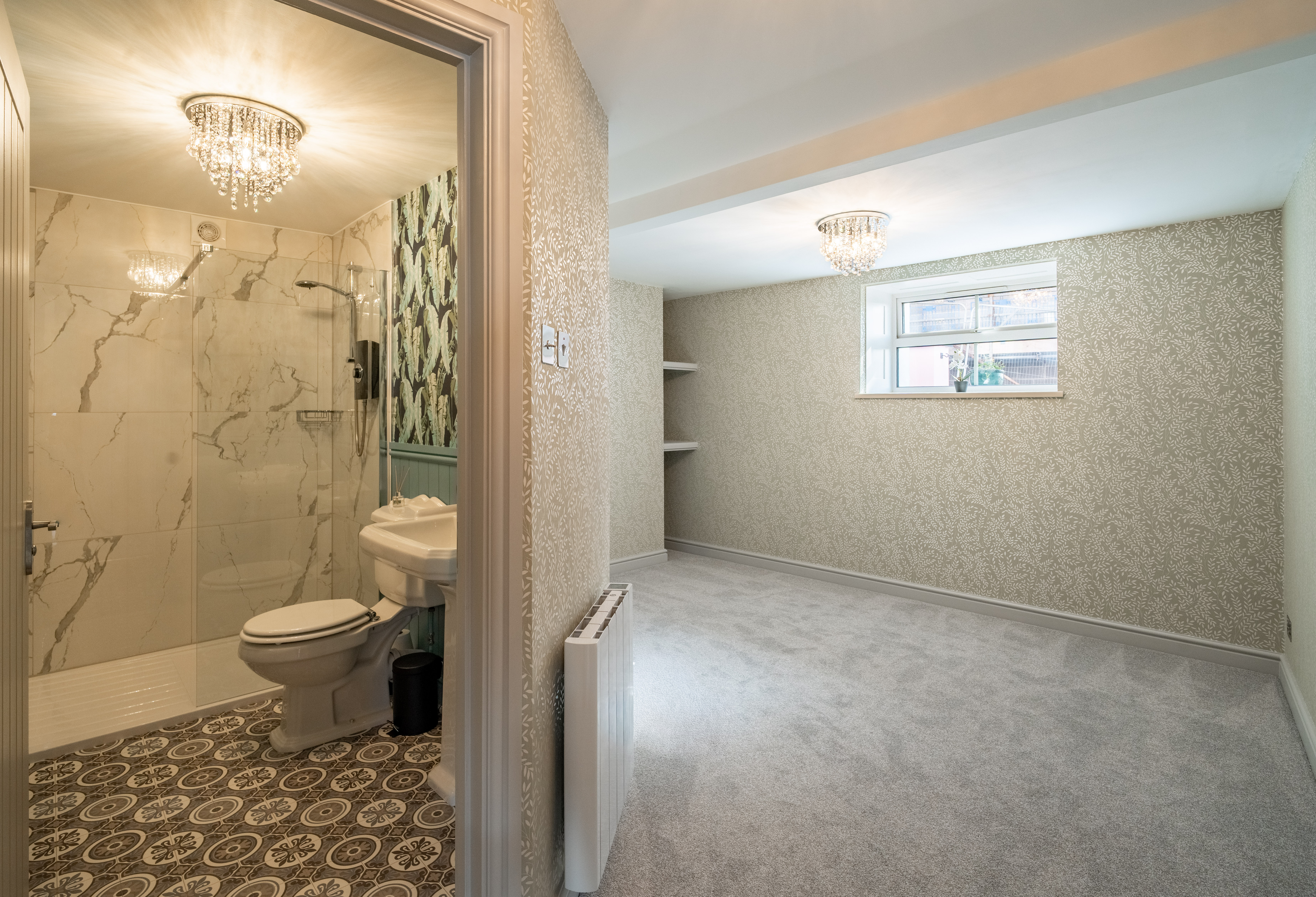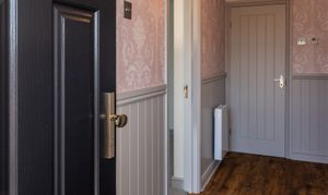 The self-contained apartment is accessed via a welcoming and well-presented hallway, finished with stylish Laura Ashley wallpaper and feature wall panelling that adds character and charm. The space is complemented by durable and attractive LVT flooring, while a ceramic WiFi-controlled electric radiator provides efficient and modern heating. Thoughtfully designed, this hallway sets the tone for the apartment with a blend of elegance and practicality.