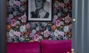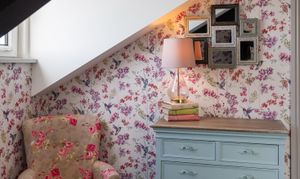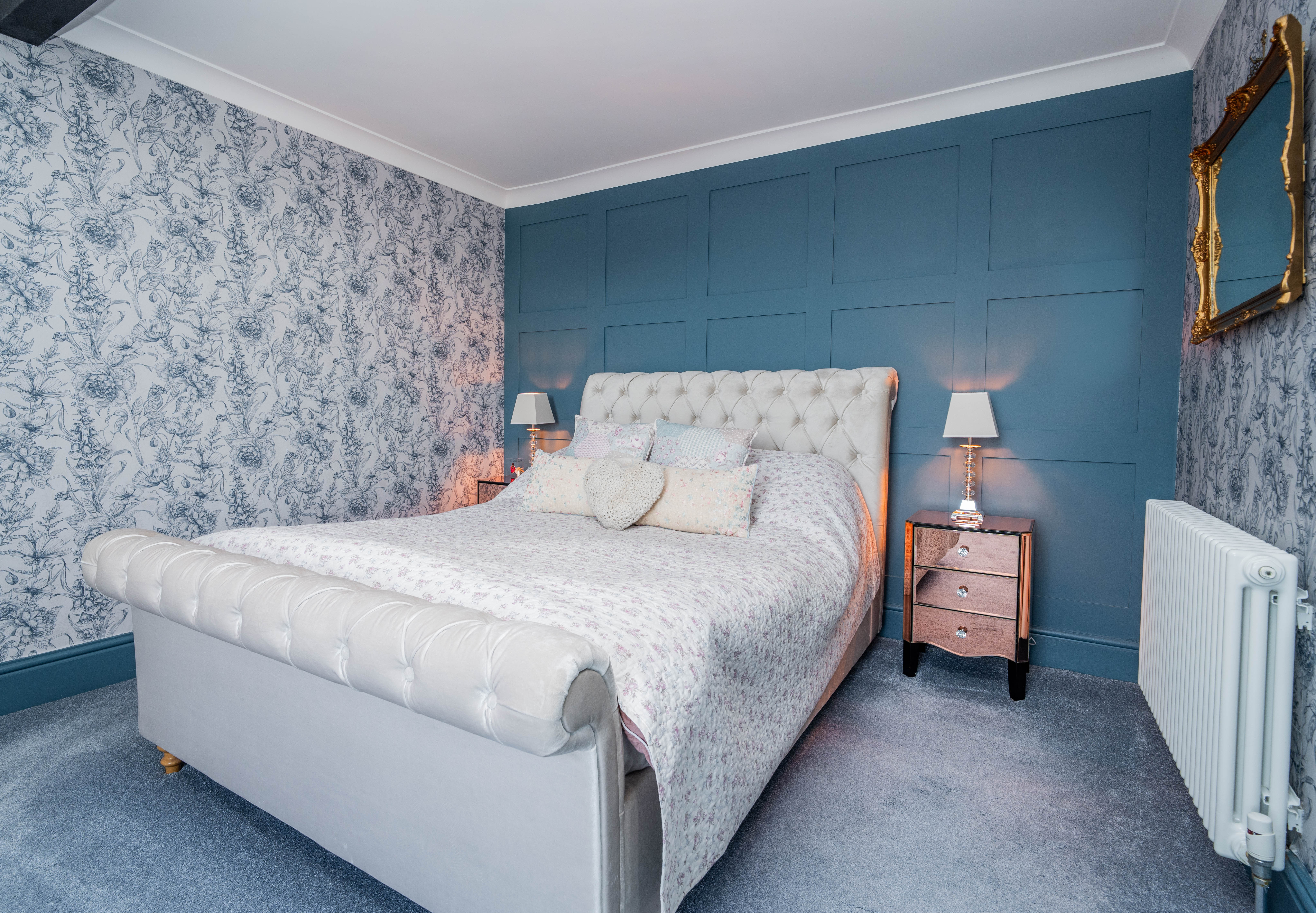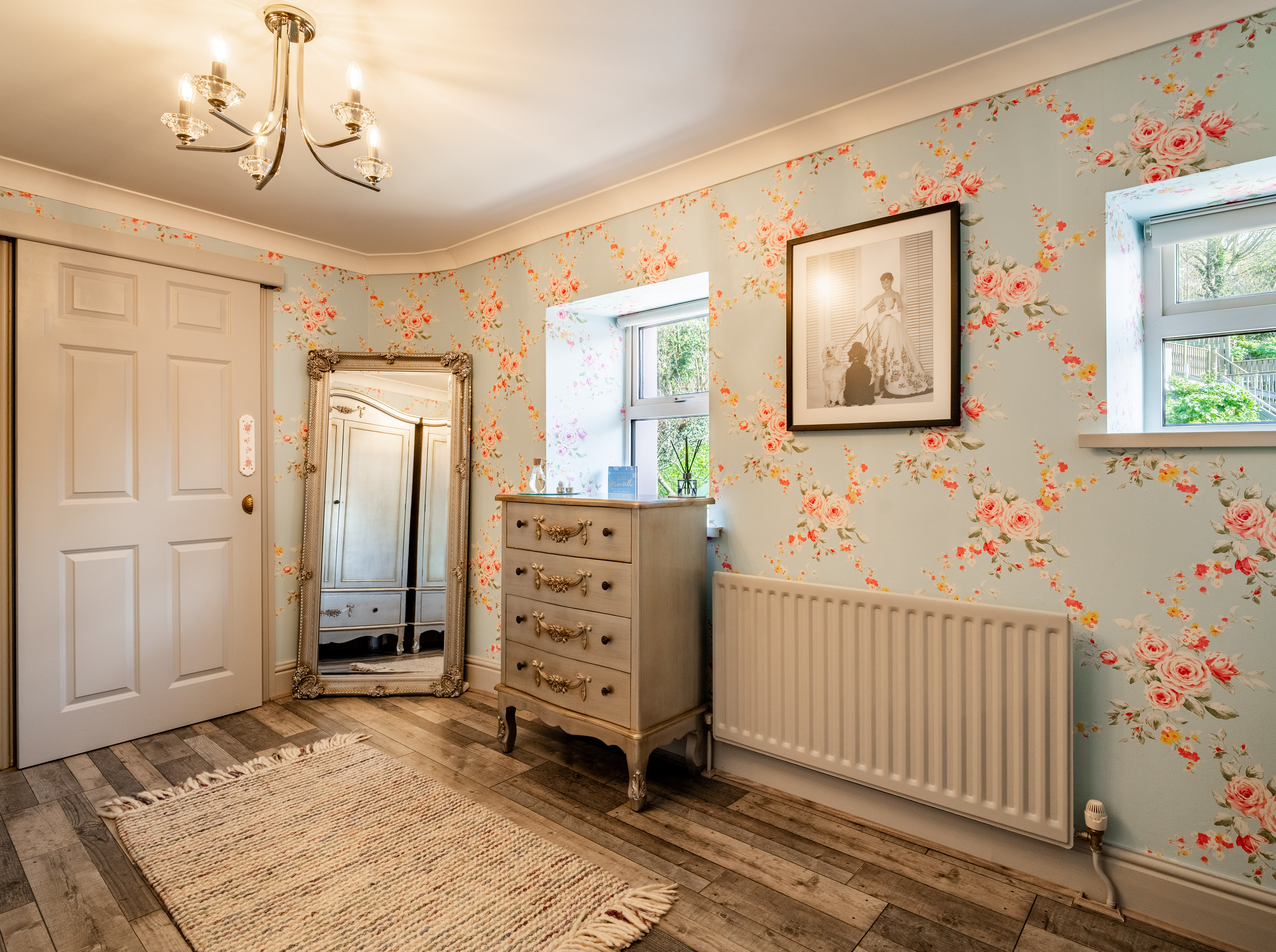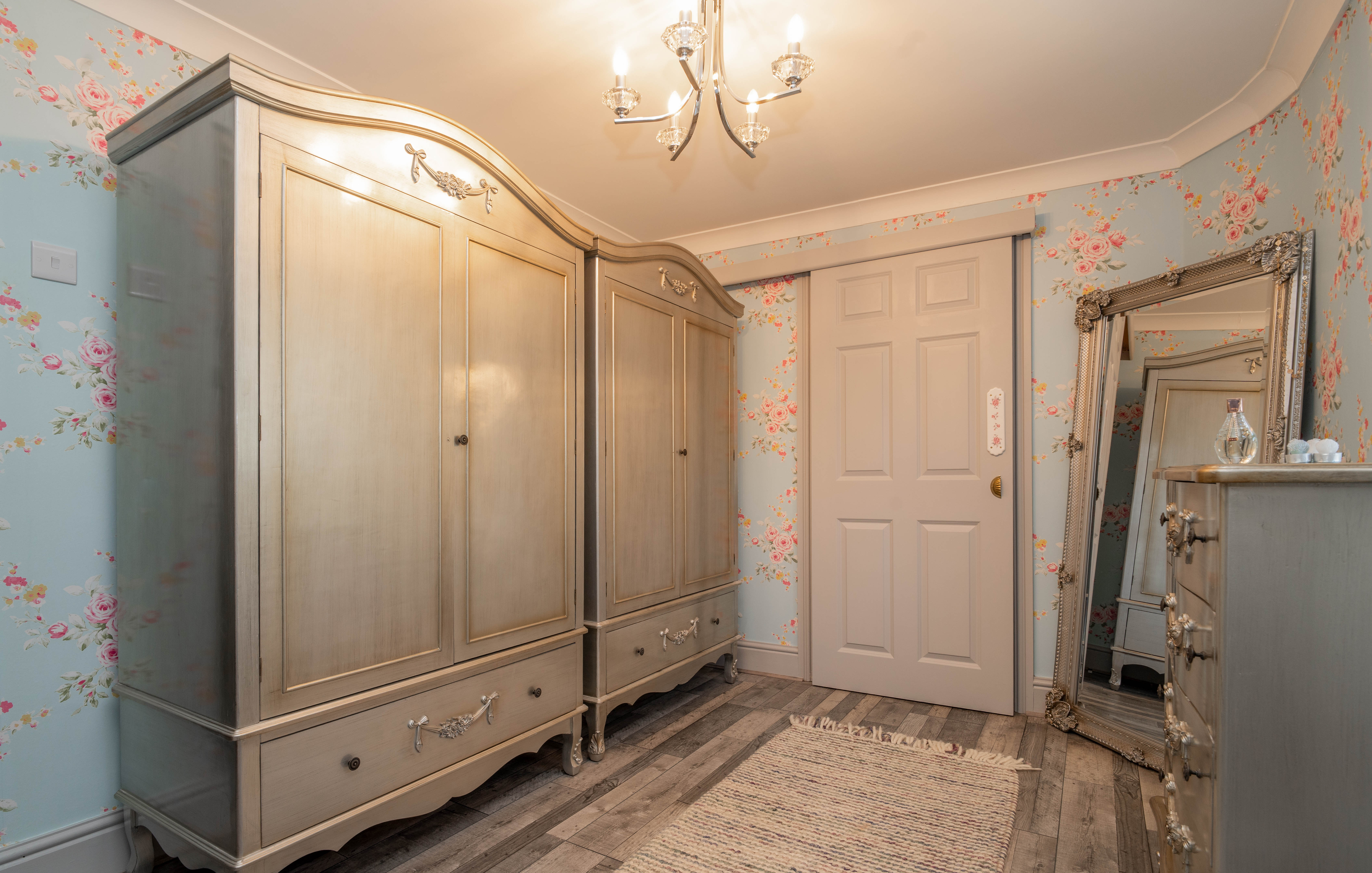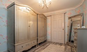 Bedroom three is a charming and well-presented room, featuring elegant décor with floral wallpaper that adds a soft and inviting feel. Positioned to the rear of the property, the room overlooks the courtyard garden, providing a pleasant outlook. The space is well-proportioned and benefits from a built-in sliding wardrobe, offering excellent storage. Enjoying good natural light, this versatile room is ideal for use as a guest bedroom, dressing room or additional family accommodation, combining comfort with tasteful styling.
