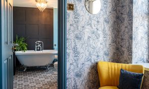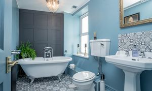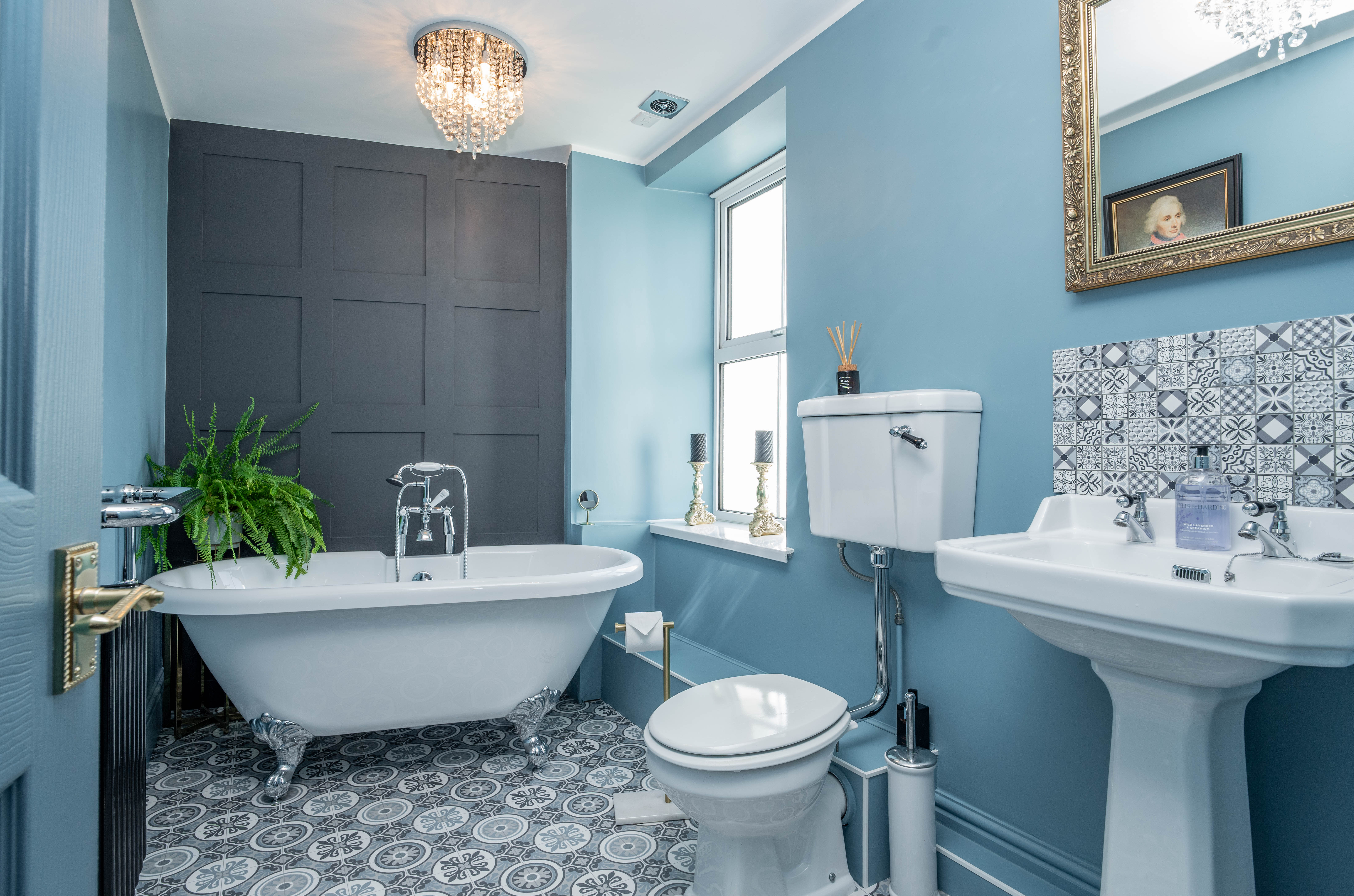 Bedroom two is served by a stylish and well-appointed en-suite, finished to a high standard with a blend of traditional design elements. The suite features a freestanding roll top bath with a traditional bath/shower mixer tap, creating an elegant focal point. A pedestal wash hand basin and WC are complemented by feature wall panelling, adding character and charm, while a traditional heated towel rail radiator enhances the room’s classic appeal. The space is further elevated by two ceiling lights with cascading clear glass crystal droplets and an extractor fan, completing this beautifully presented bathroom.