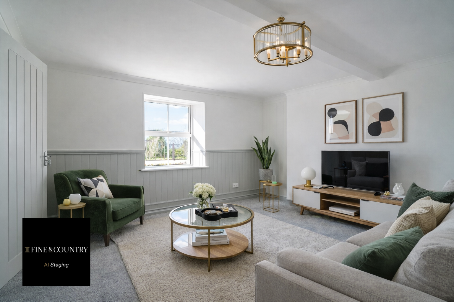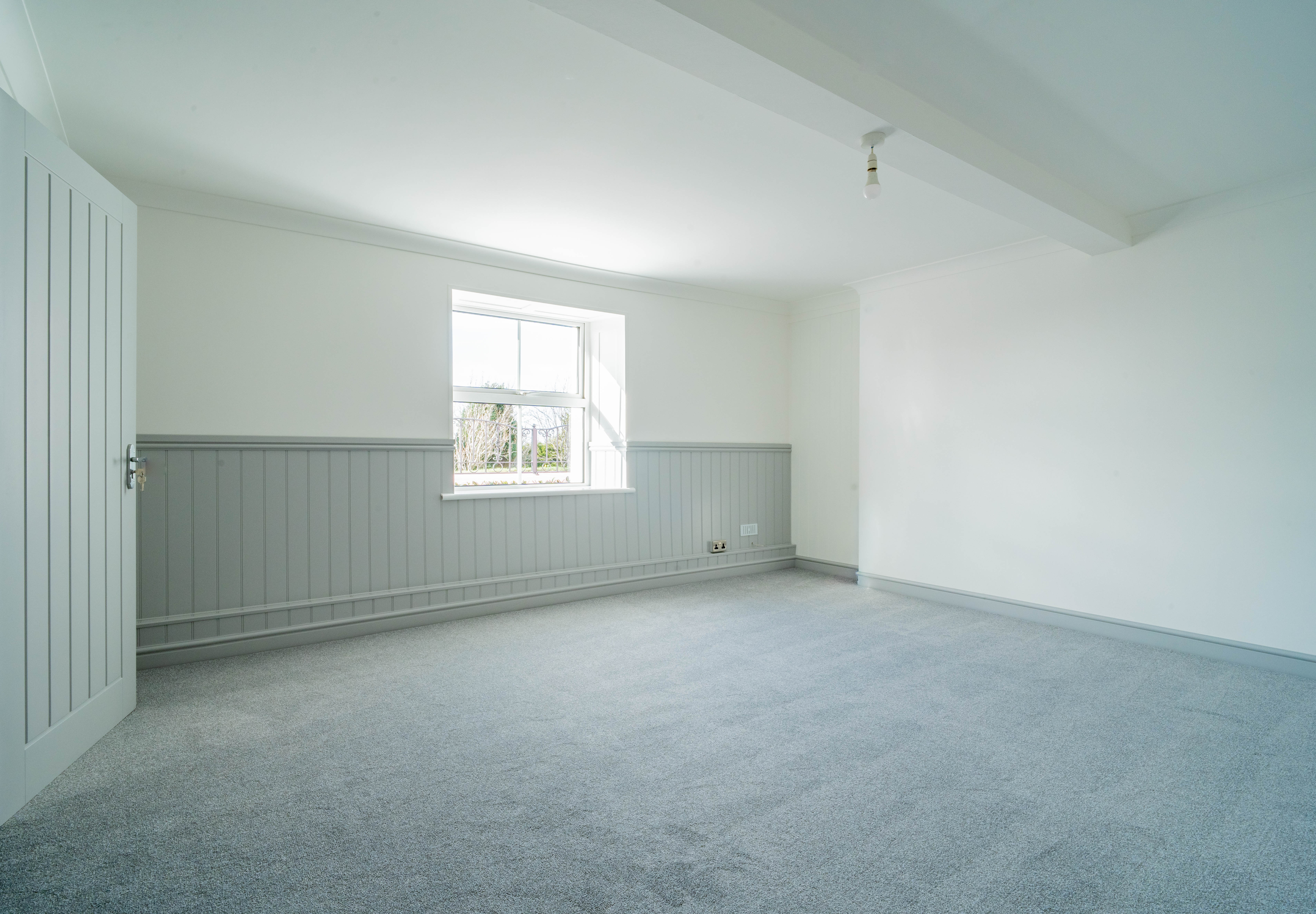 A spacious and bright sitting room offering a versatile living space, enhanced by a large window allowing for plenty of natural light. The room is tastefully finished with neutral décor, wall panelling detail, and fitted carpeting, creating a comfortable and inviting atmosphere. Well-proportioned and adaptable, this room provides an ideal setting for both relaxation and entertaining.