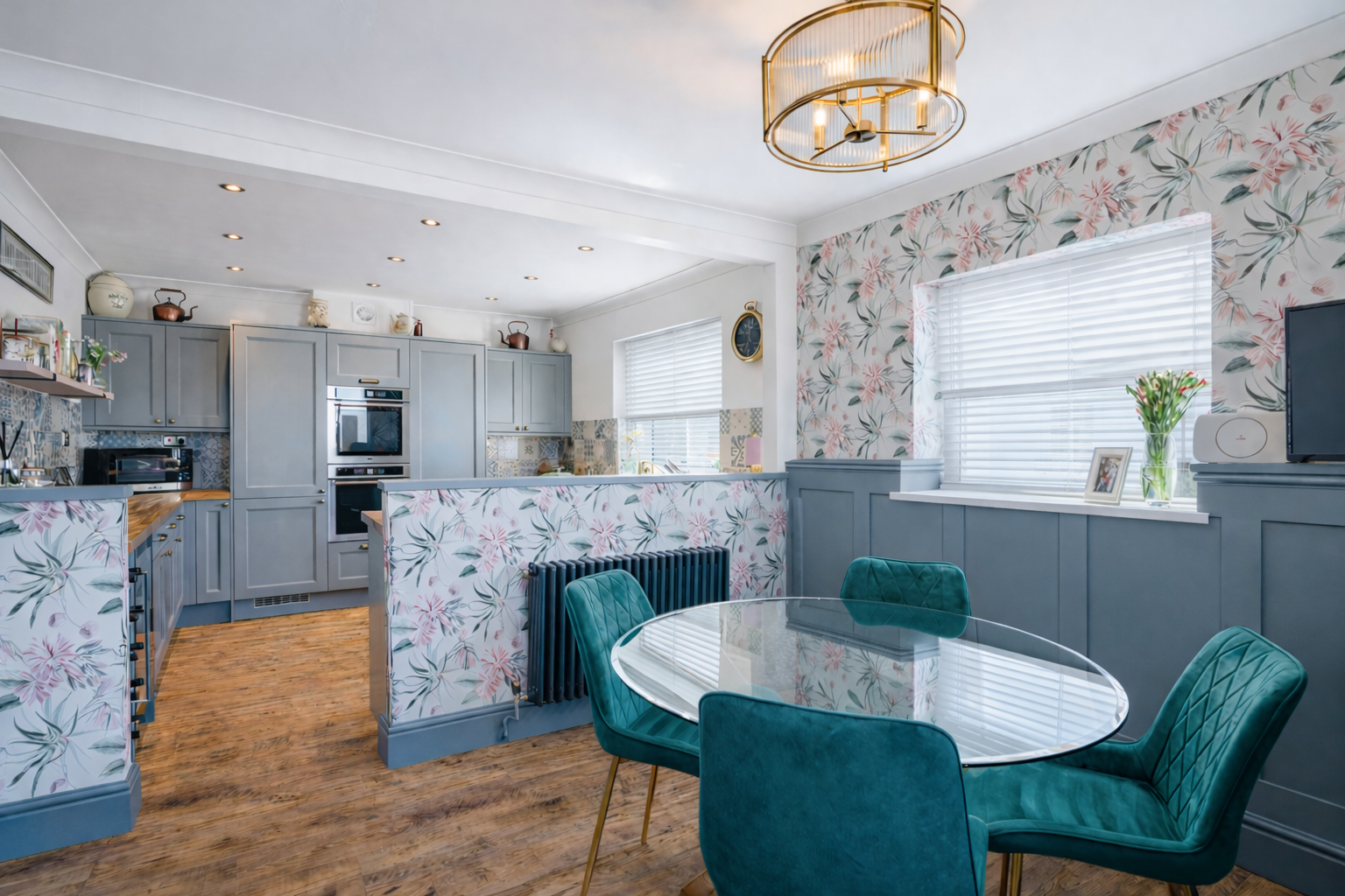 The dining room is a bright and stylish space, perfectly designed for both everyday dining and entertaining. Beautifully presented with elegant botanical wallpaper, the room enjoys an abundance of natural light from dual aspect windows, creating a light and welcoming atmosphere. A contemporary feature ceiling light adds a touch of modern sophistication, while the period-style four-column radiator complements the home’s character and provides a subtle nod to traditional design. Finished with durable and attractive LVT flooring, the room offers both practicality and style, with ample space for a family dining table and seating. Seamlessly connected to the kitchen, this inviting dining area is ideal for modern living and social gatherings alike.