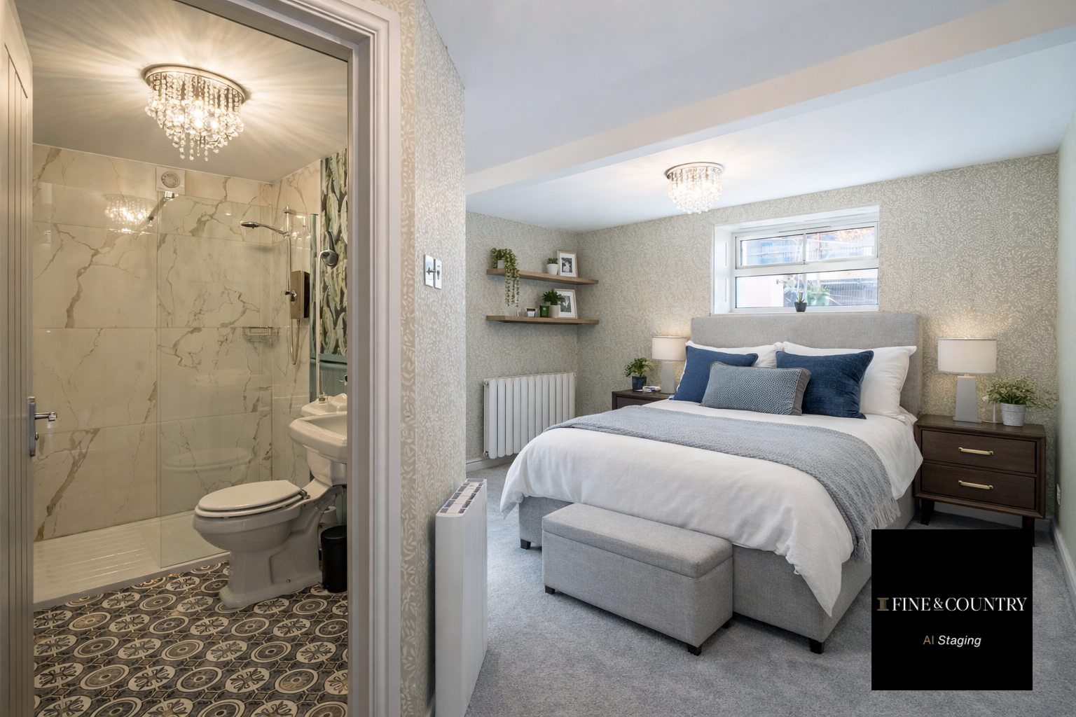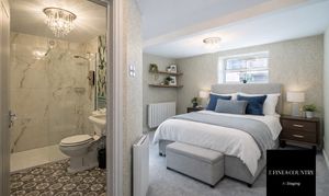 A well-proportioned and inviting bedroom, offering a bright and comfortable space enhanced by a window providing natural light. The room is tastefully decorated in neutral tones with fitted carpeting and stylish wall finishes, creating a calm and relaxing atmosphere. Conveniently located adjacent to a modern en-suite shower room.