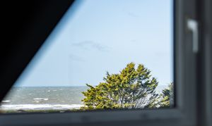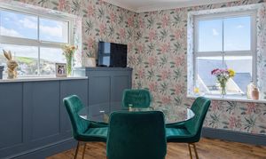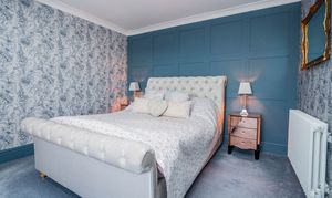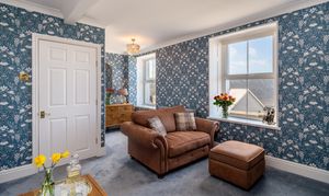 Bedroom two is a well-presented and generously sized double room, finished with stylish décor including feature panelling and elegant wallpaper. Positioned to the front of the property, the room enjoys attractive sea views and an abundance of natural light. Well-proportioned and comfortable, this inviting bedroom offers ample space for furnishings, making it ideal for family, guests or as a beautifully appointed additional bedroom.