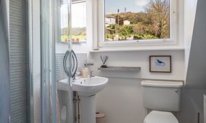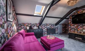 A versatile and stylish space, currently used as a cosy cinema room, featuring a Laura Ashley crystal glass light and a Velux roof window with fitted blind providing natural light. The room also benefits from useful under eaves storage, making it both practical and adaptable for a variety of uses including an additional bedroom, snug, or home office. From this elevated position, the room enjoys spectacular sea views across the Cardigan Bay coastline, adding a truly special and desirable aspect to this charming space.