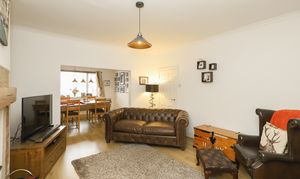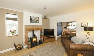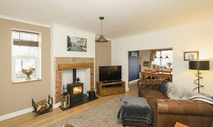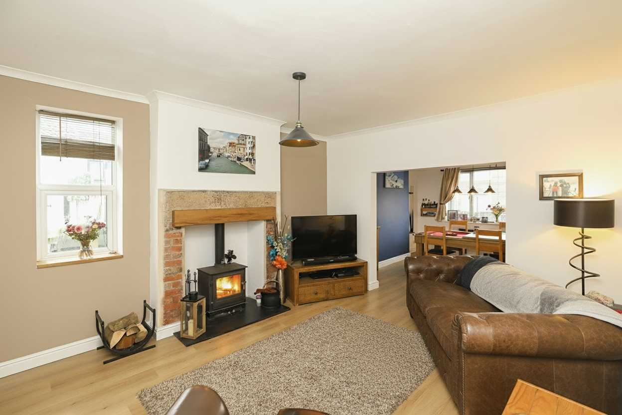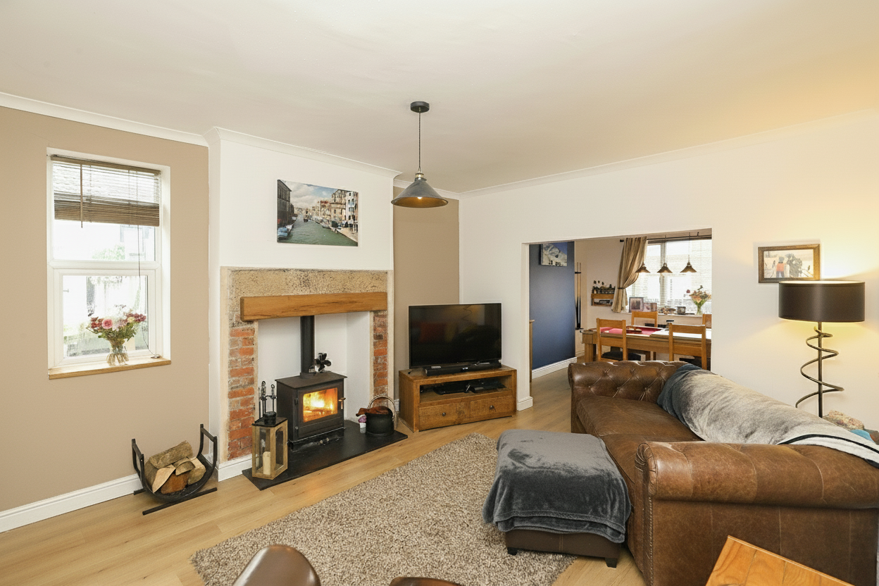 The spacious living room features a characterful log burner that provides a cosy focal point, perfect for relaxing evenings at home. This room flows effortlessly into an open-plan dining area, which is flooded with natural light thanks to generous windows, making it an inviting space for everyday dining and entertaining guests.