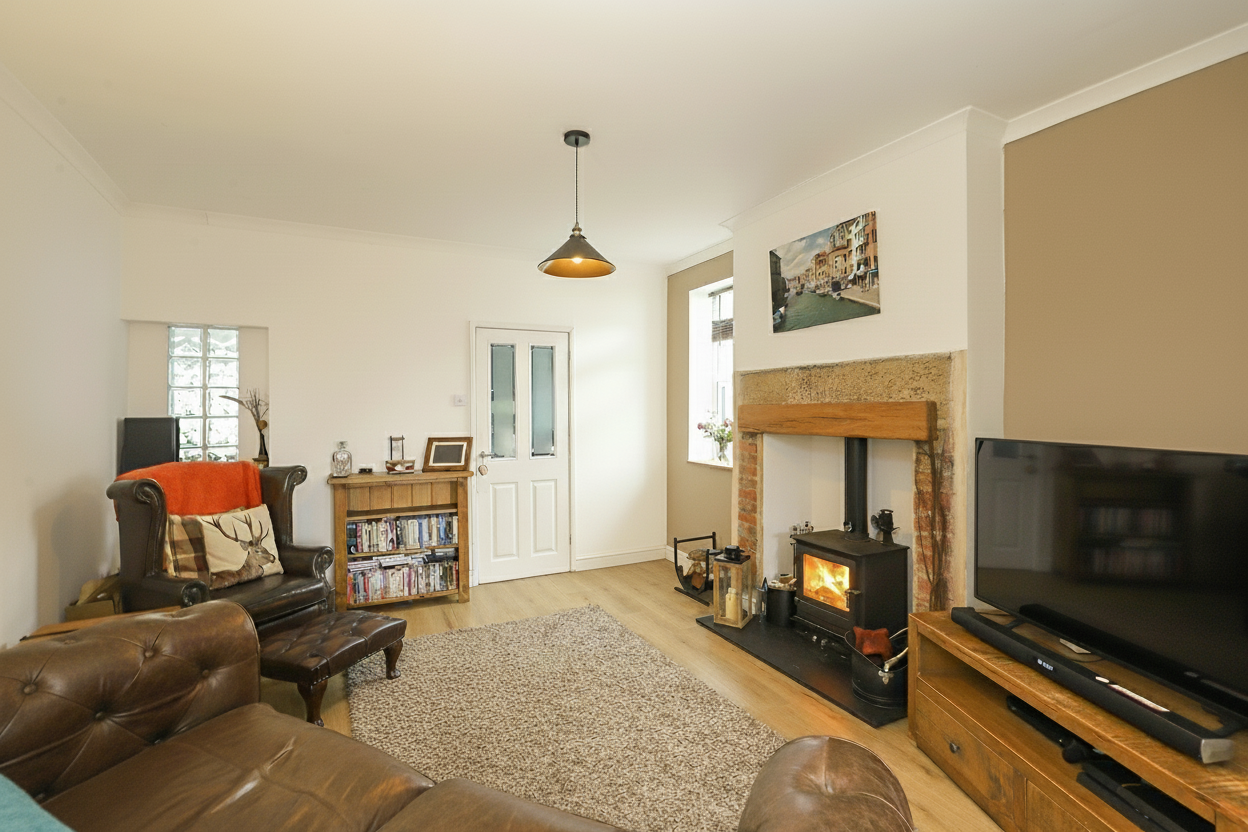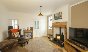 - The Spacious Living Room Features A Charming Log Burner