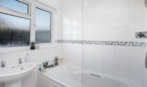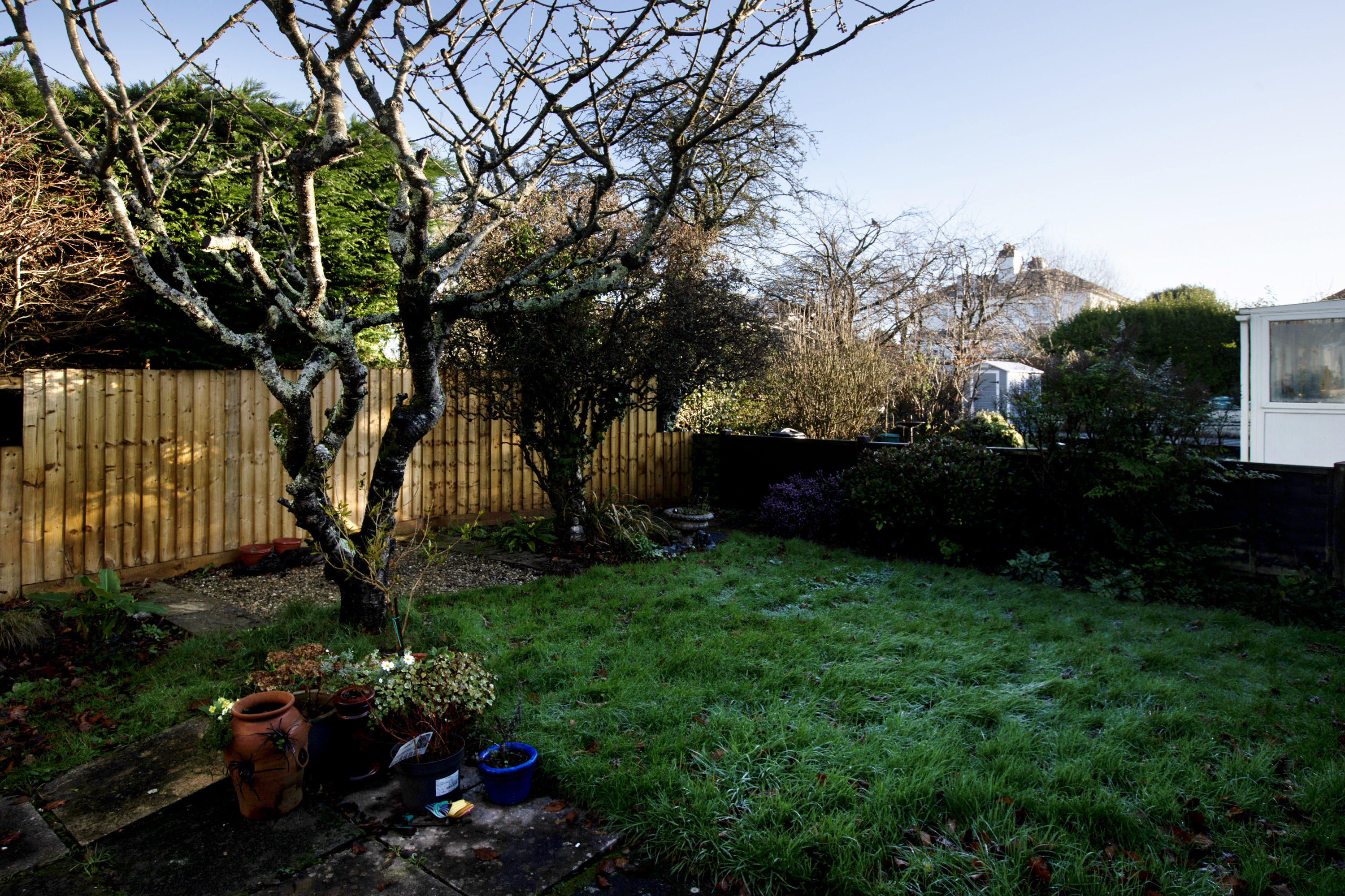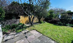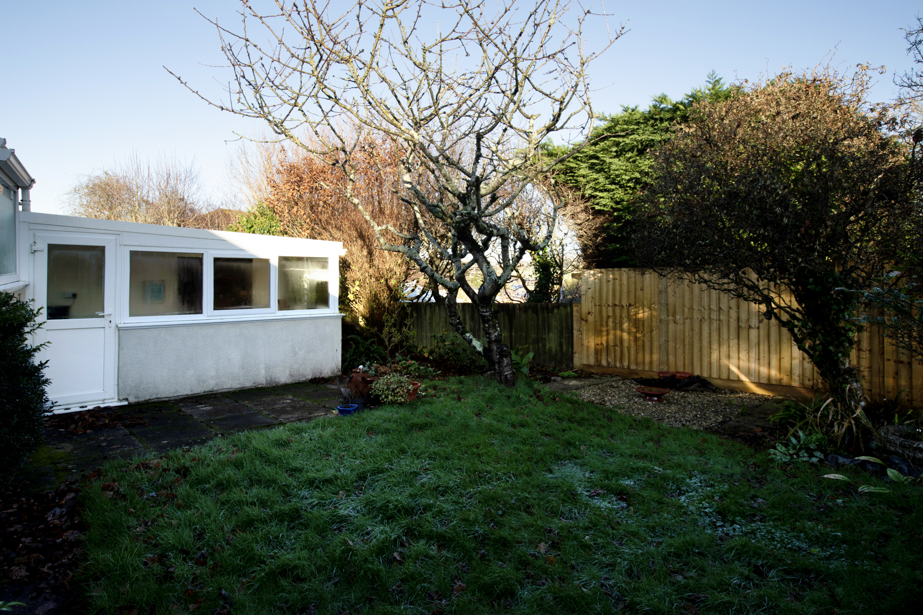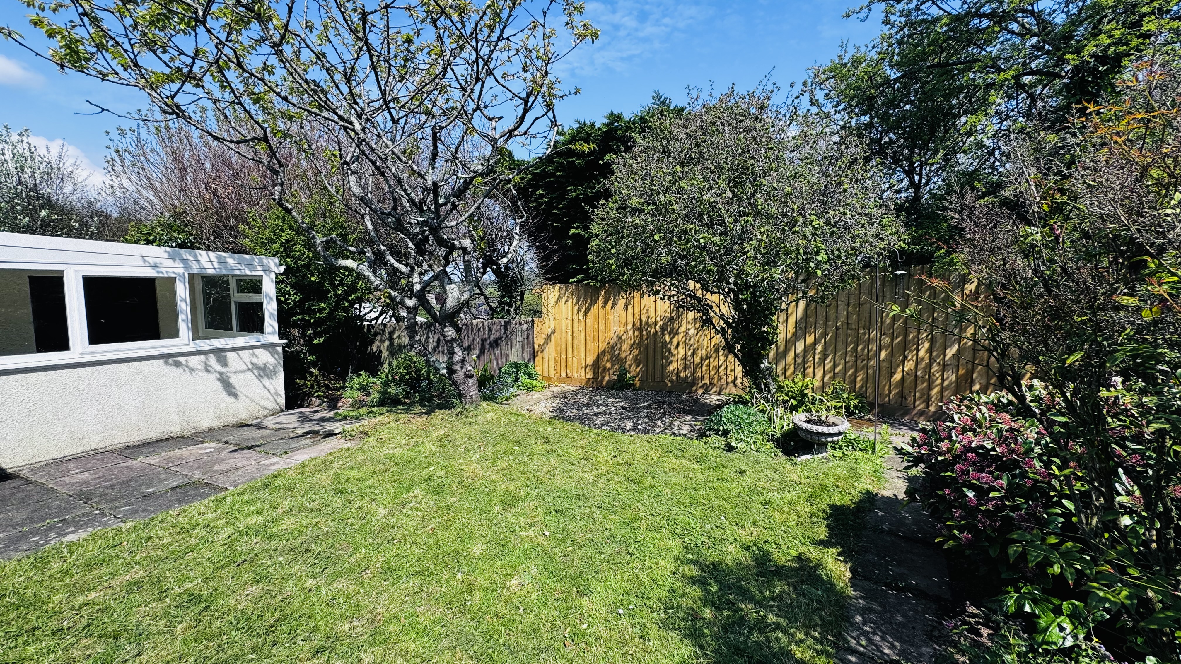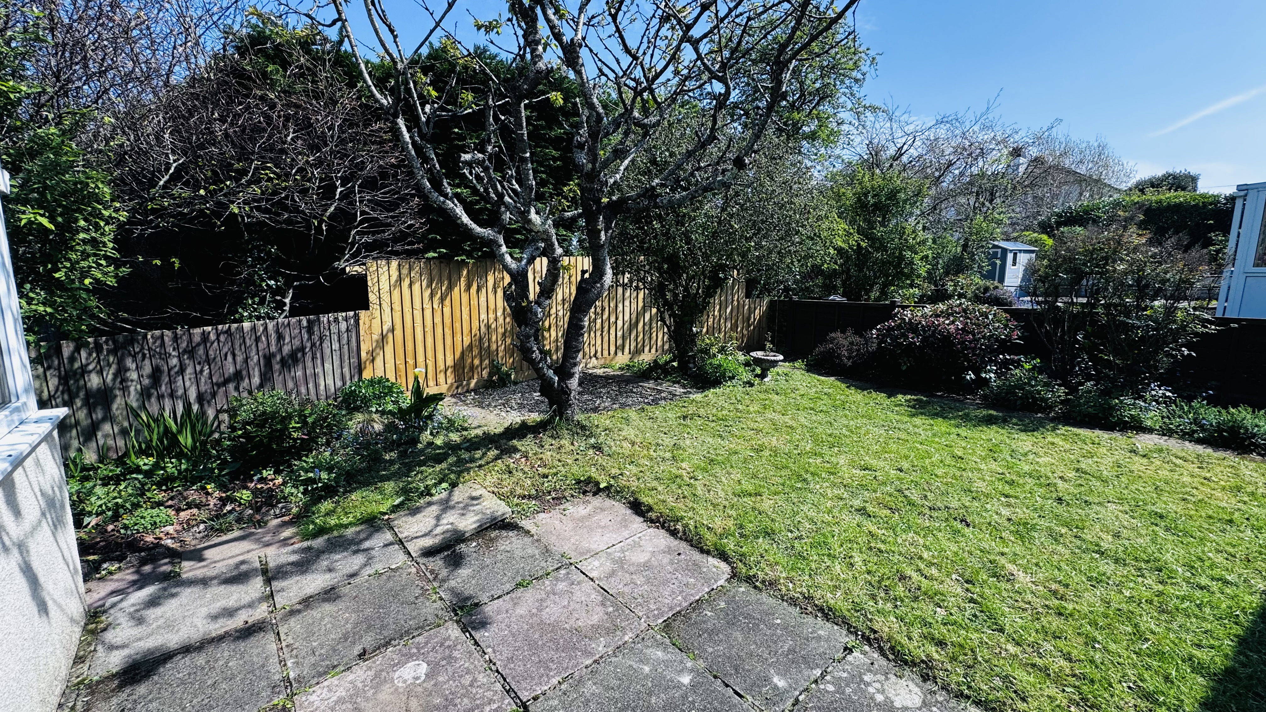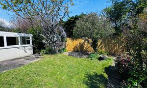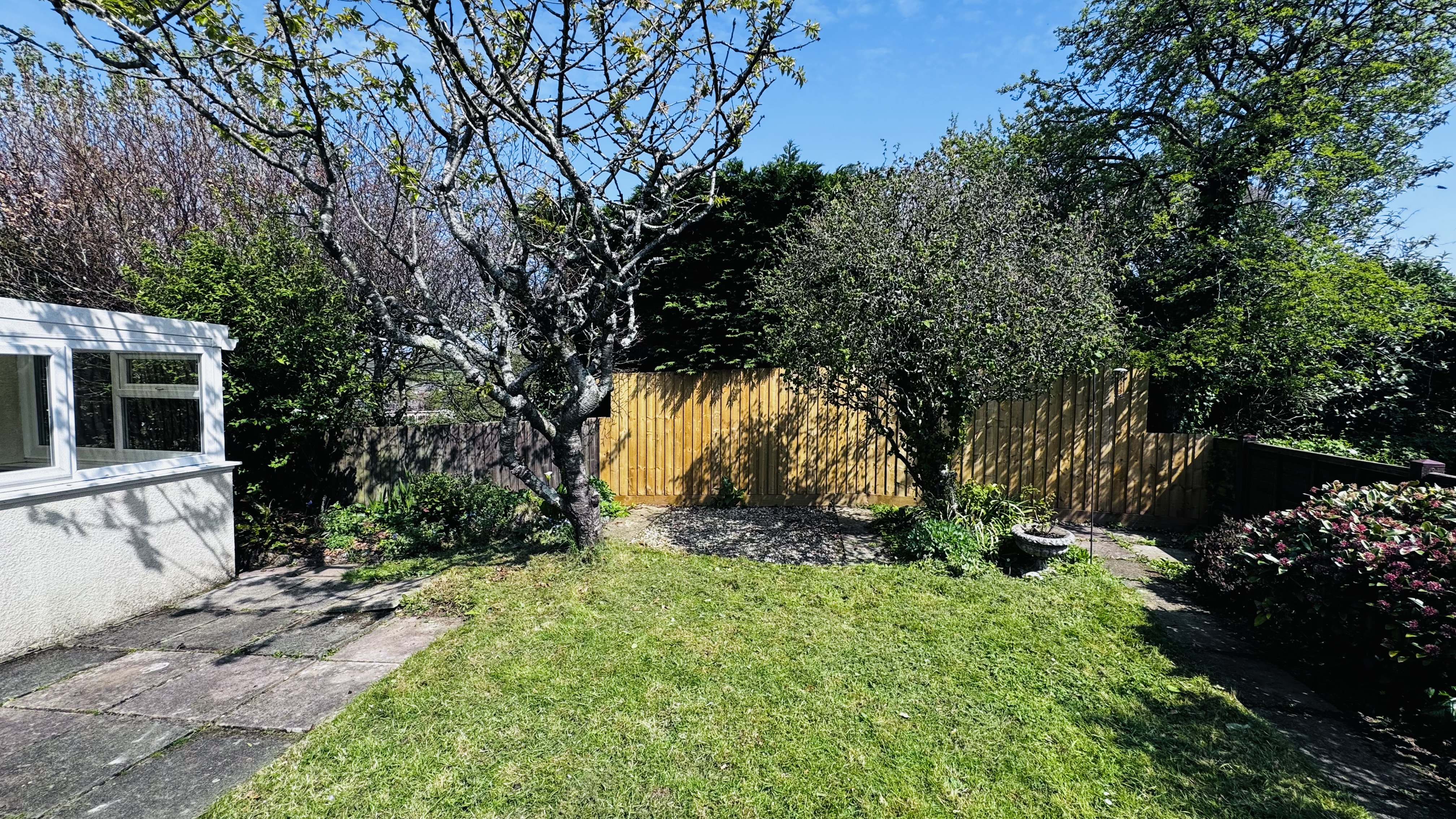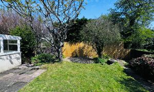 The north-east facing rear garden is fully enclosed with timber fencing, offering a peaceful, private retreat. Accessed through the sunroom, the garden features a lush lawn surrounded by mature shrubs, providing both beauty and privacy. A slabbed patio area offers a perfect spot for outdoor seating, ideal for relaxing or entertaining. The space is tranquil and well-maintained, creating an inviting atmosphere for all occasions.