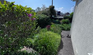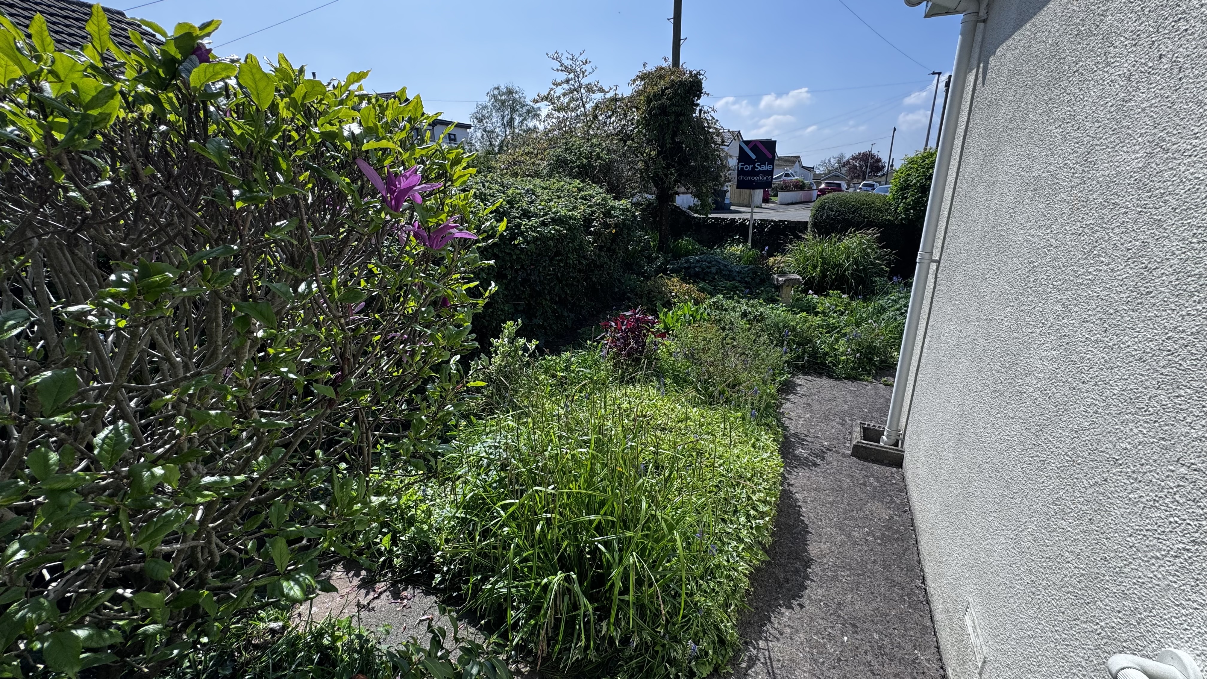The south-west facing front garden is private and serene, with mature shrubs providing privacy and texture.