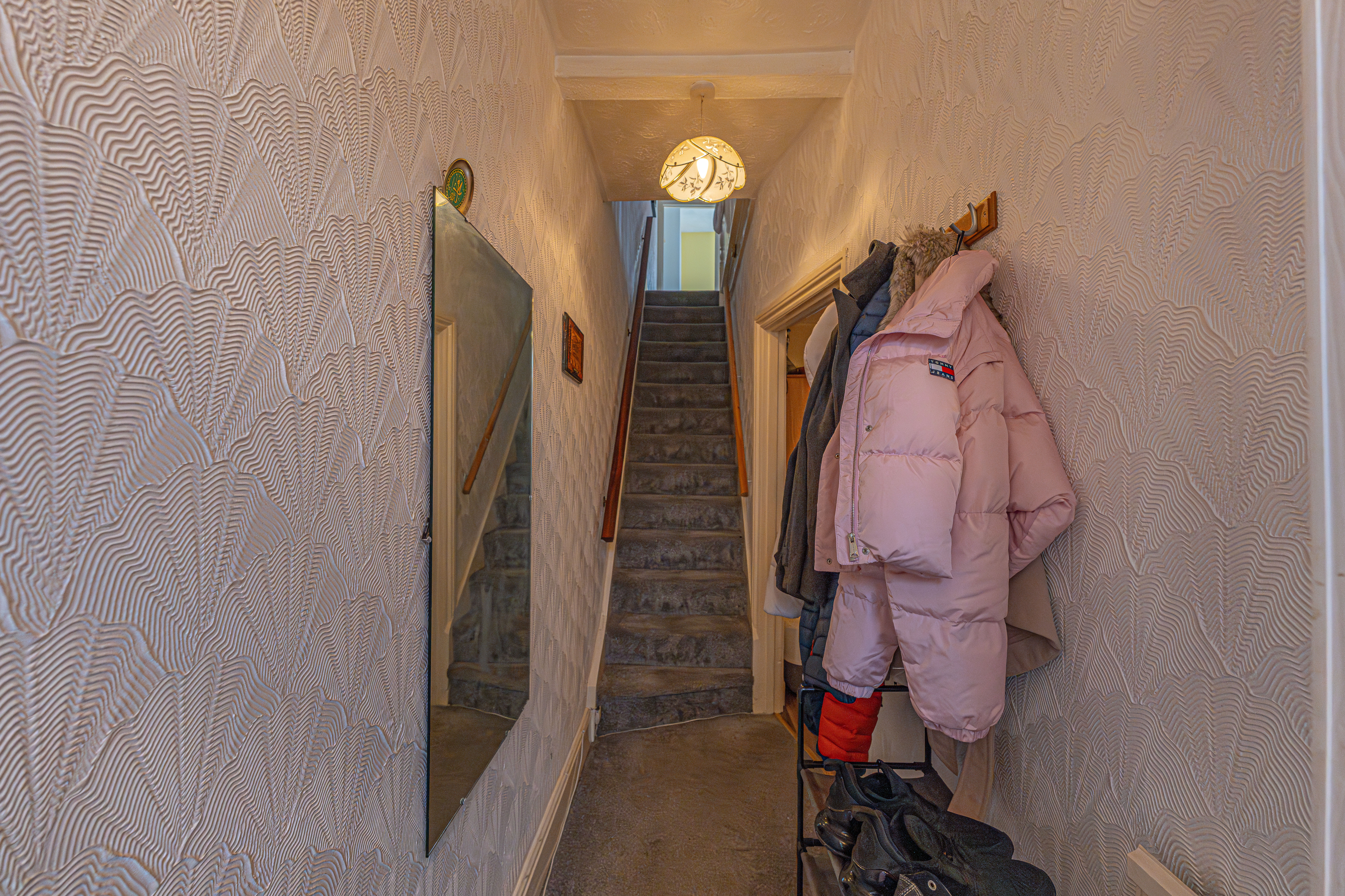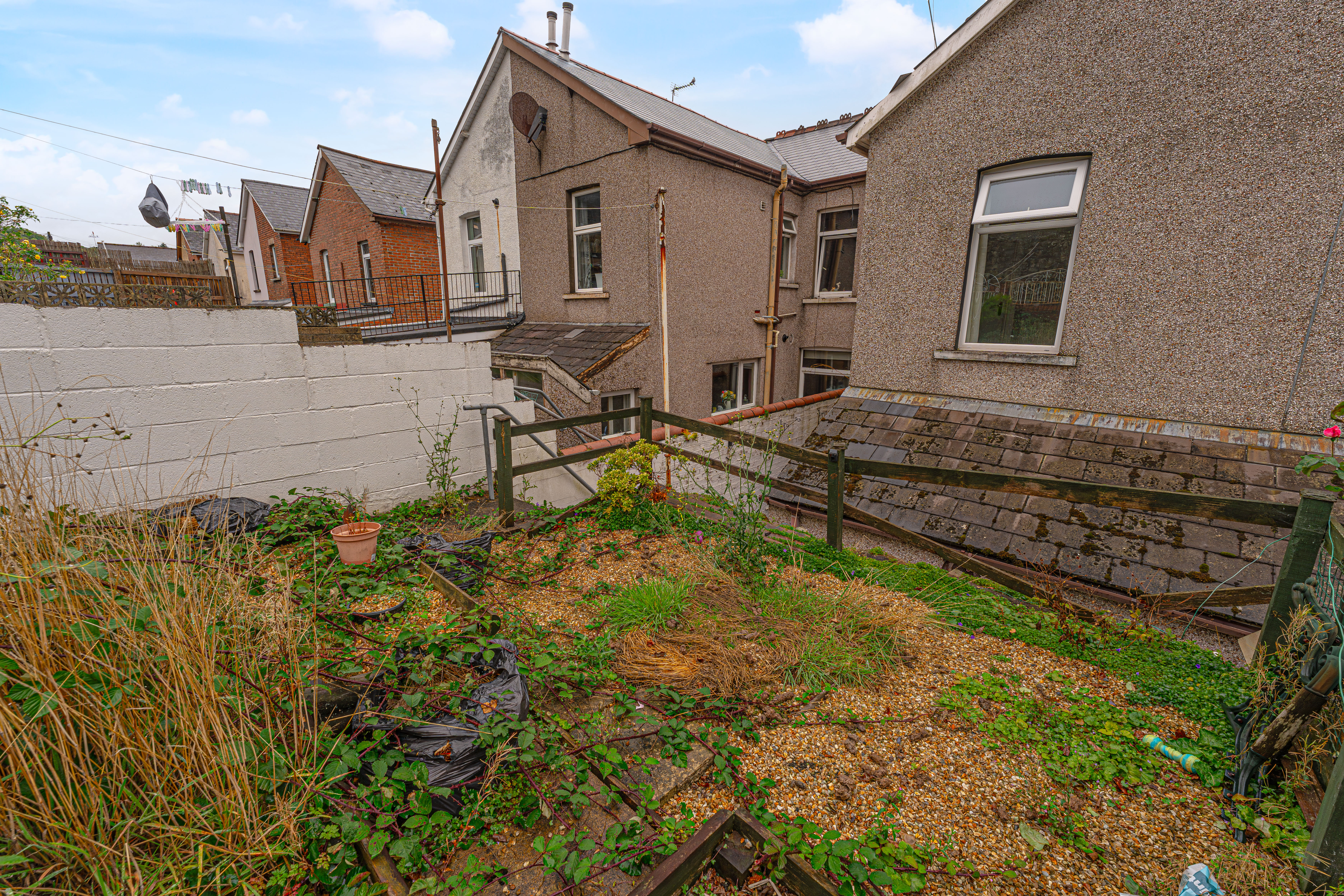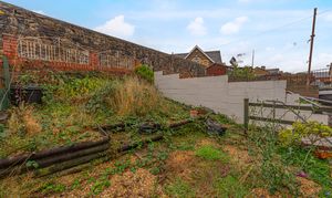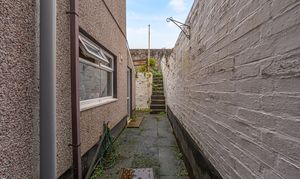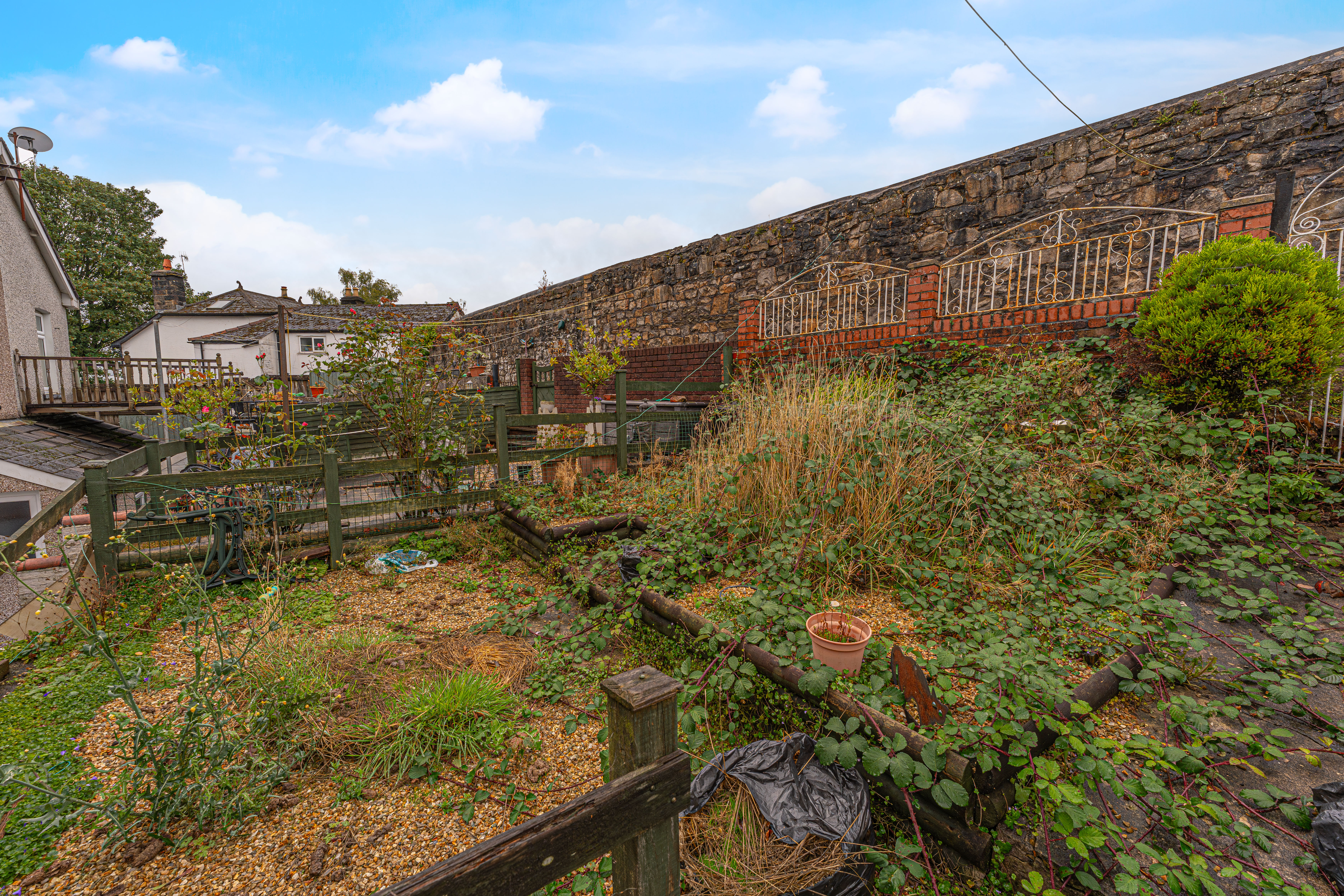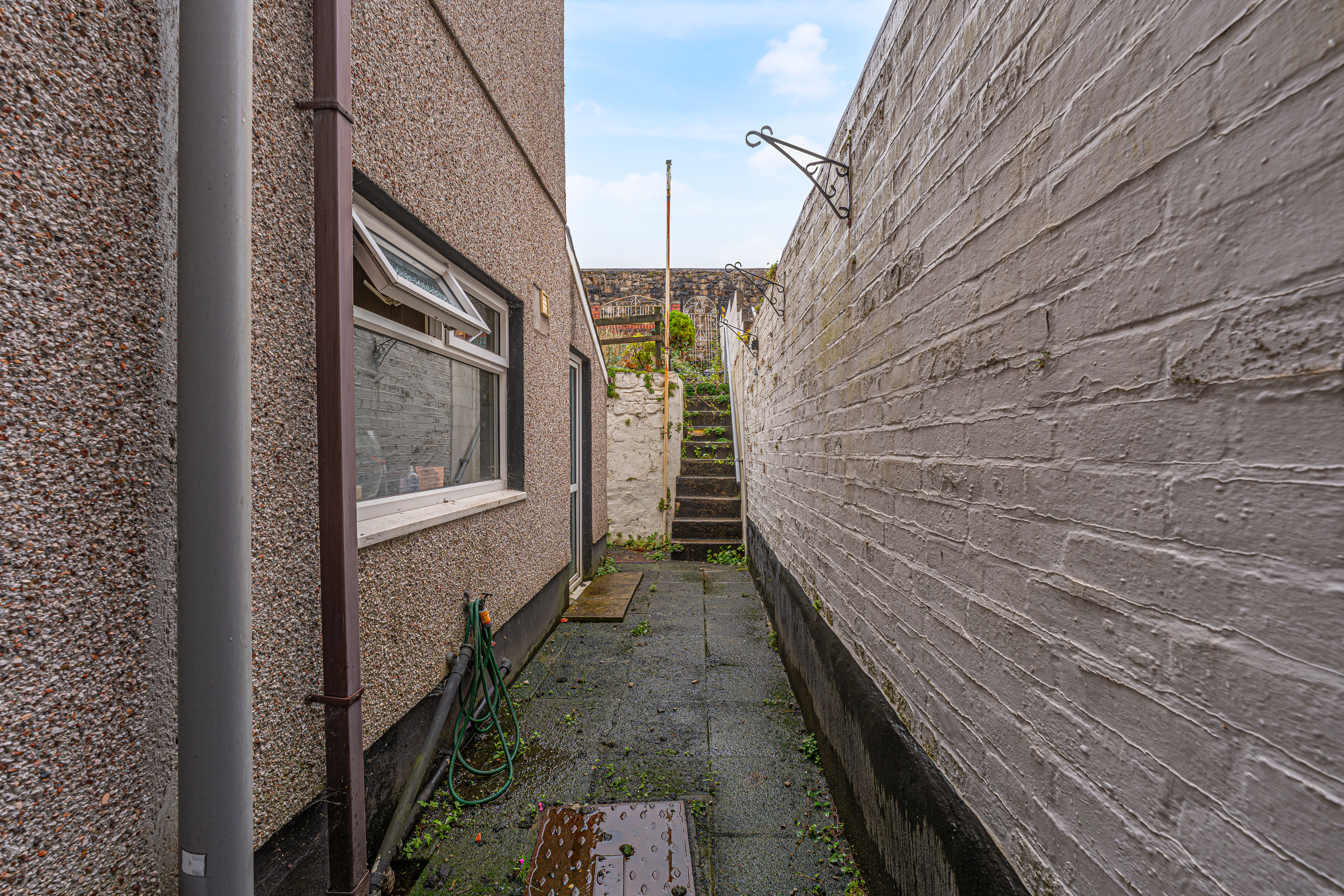 Stepping outside we have a large secluded patio connected to the house, with steps up to a pebble stone garden, which is great for relaxing in the fresh air, as well as providing a great opportunity for future development. The garden also features a gate to a pathway running alongside the rear of the terrace, highlighting an alternative entry point to the property.