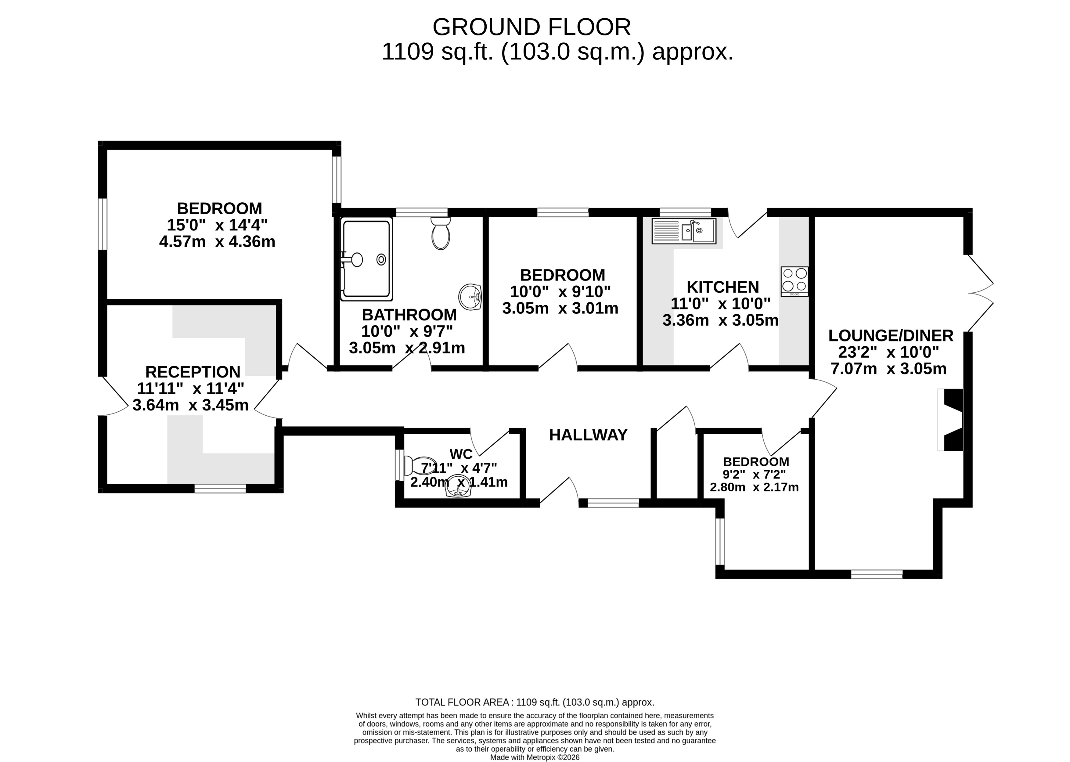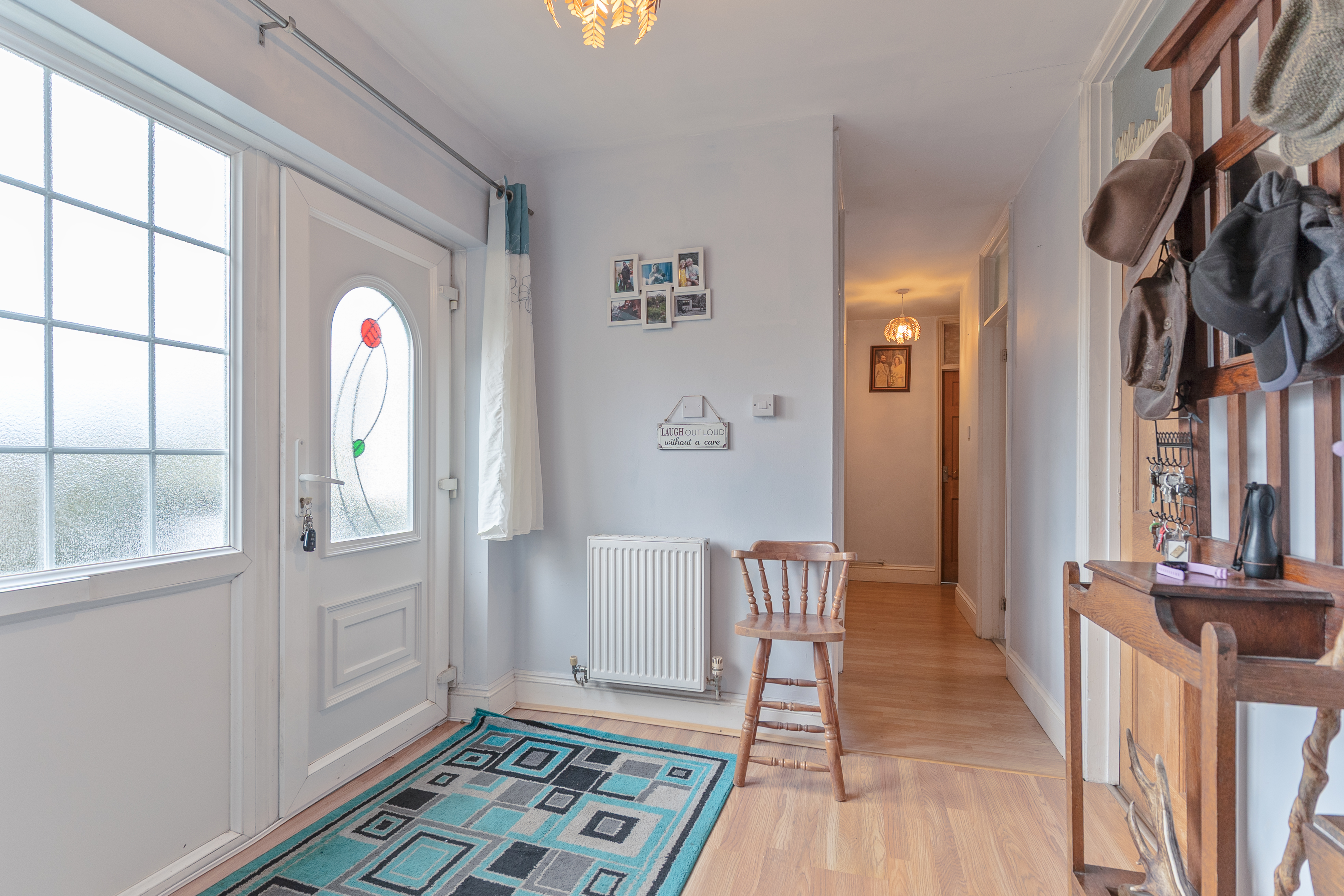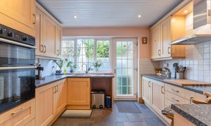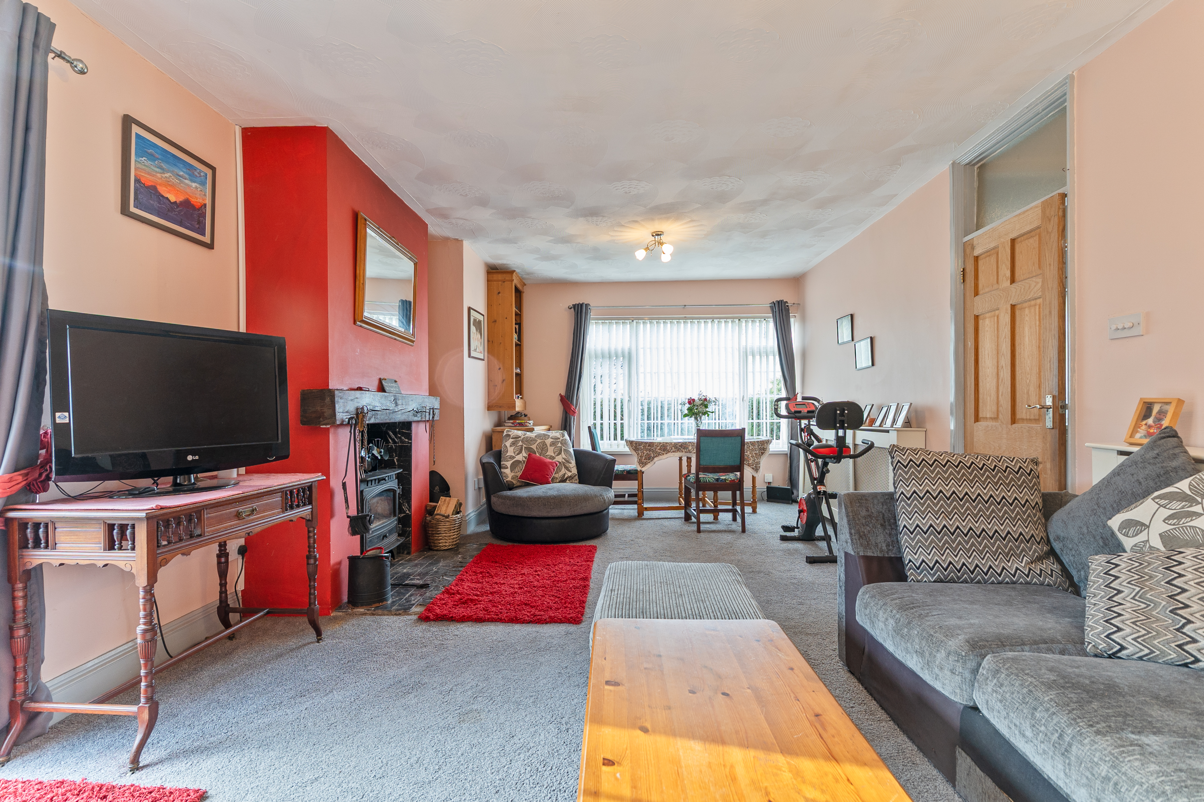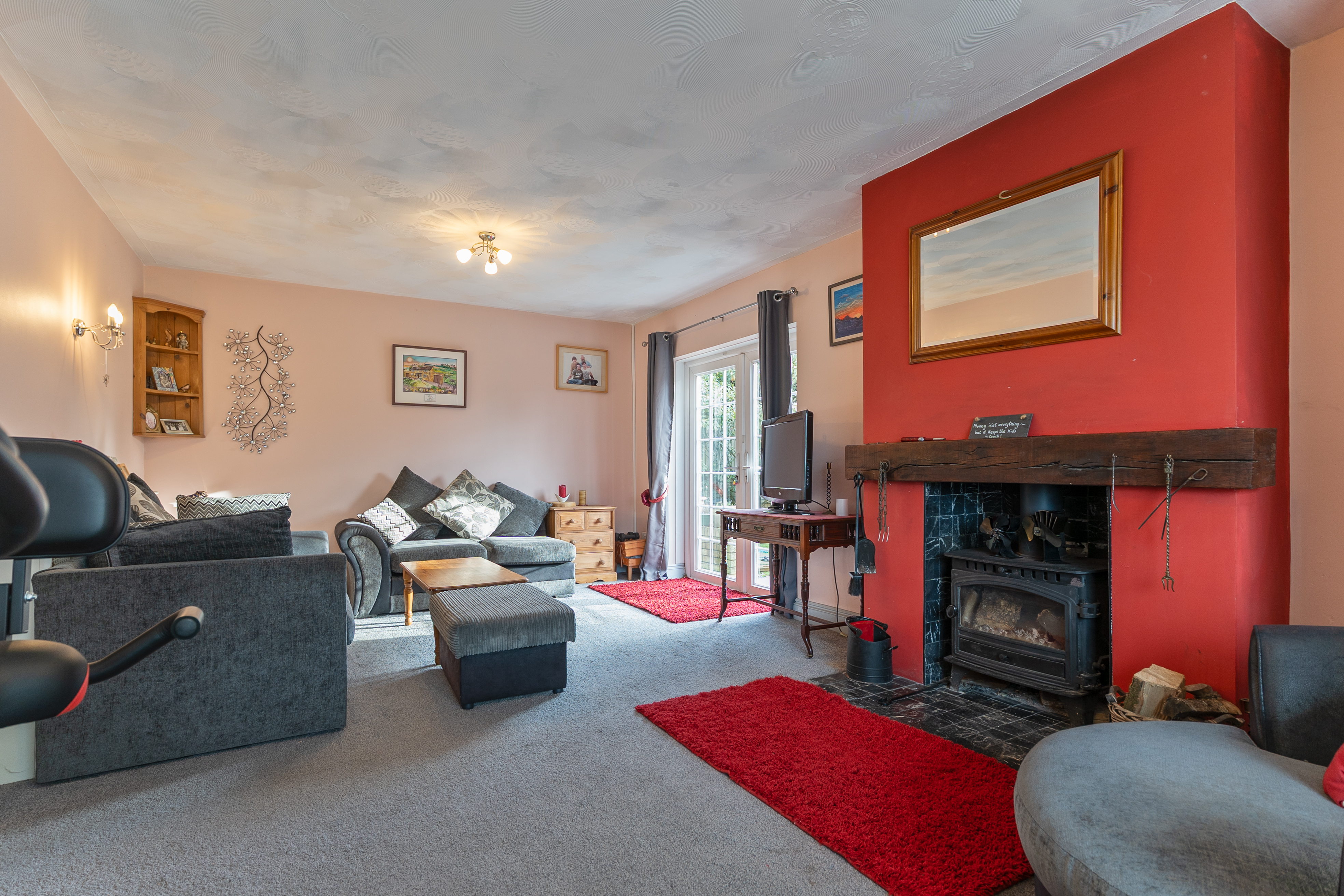 You enter the property through a spacious entrance hall, which provides access to all rooms within the bungalow. Along the right-hand side is the impressive open-plan dining/family room, featuring a characterful log burner fireplace and patio doors opening directly onto the garden, creating a warm and inviting space ideal for entertaining. Adjacent to this is the kitchen, fitted with ample floor and wall units, offering excellent storage and workspace. The bungalow offers three bedrooms, comprising two comfortable double rooms and a single bedroom, suitable for family living, guests or home working. There is also a large bathroom, complemented by a separate cloakroom, adding further practicality.
