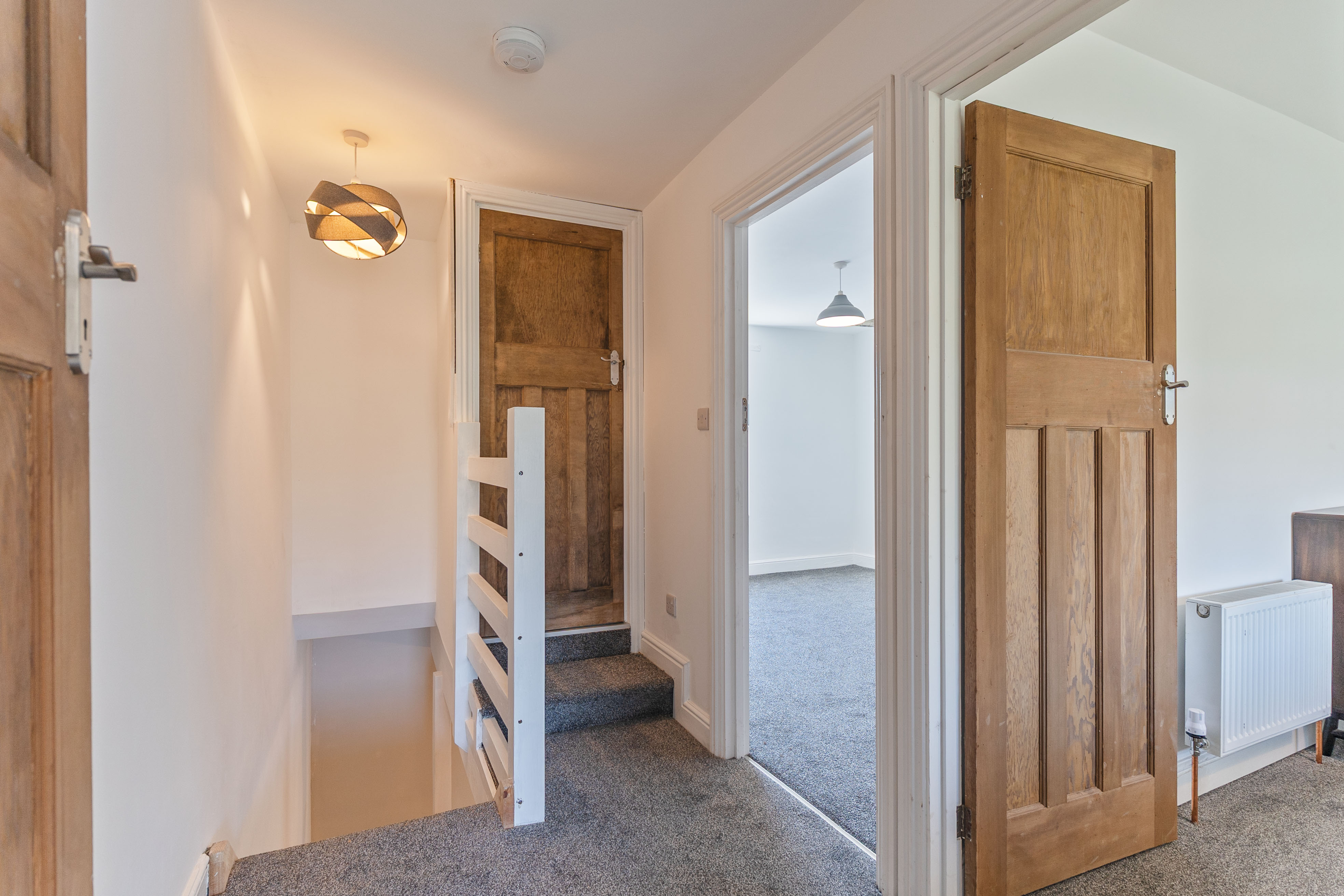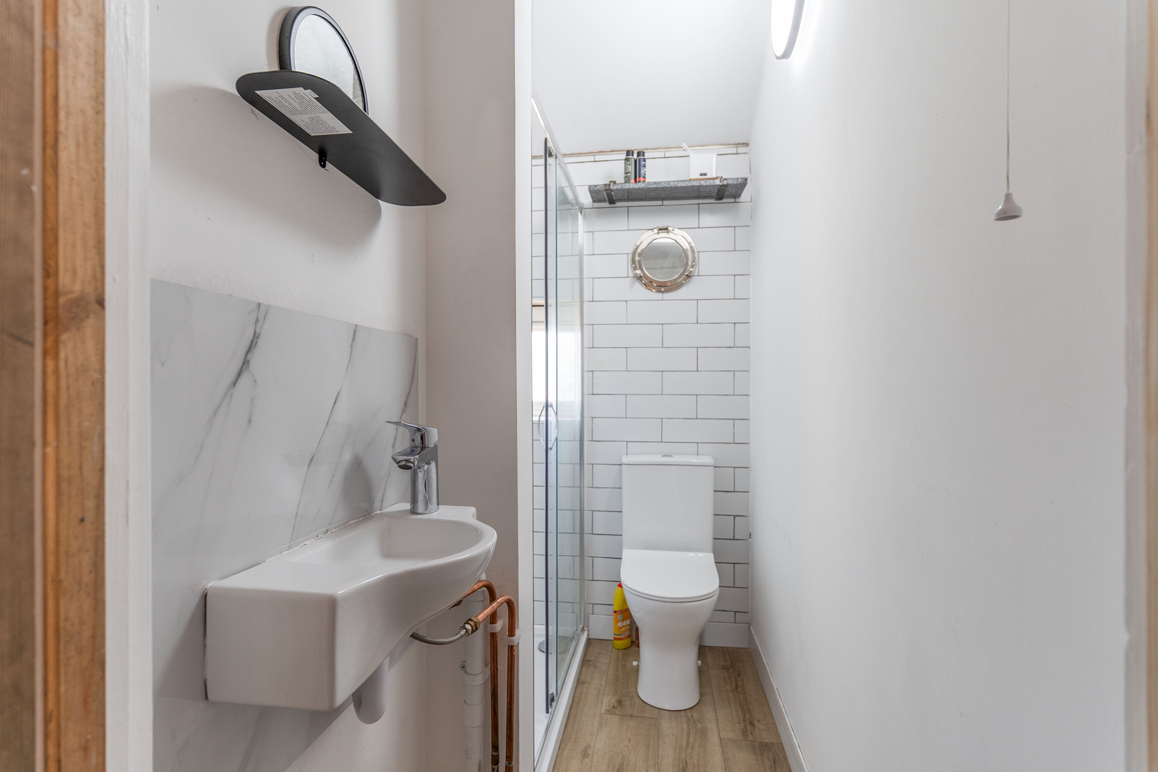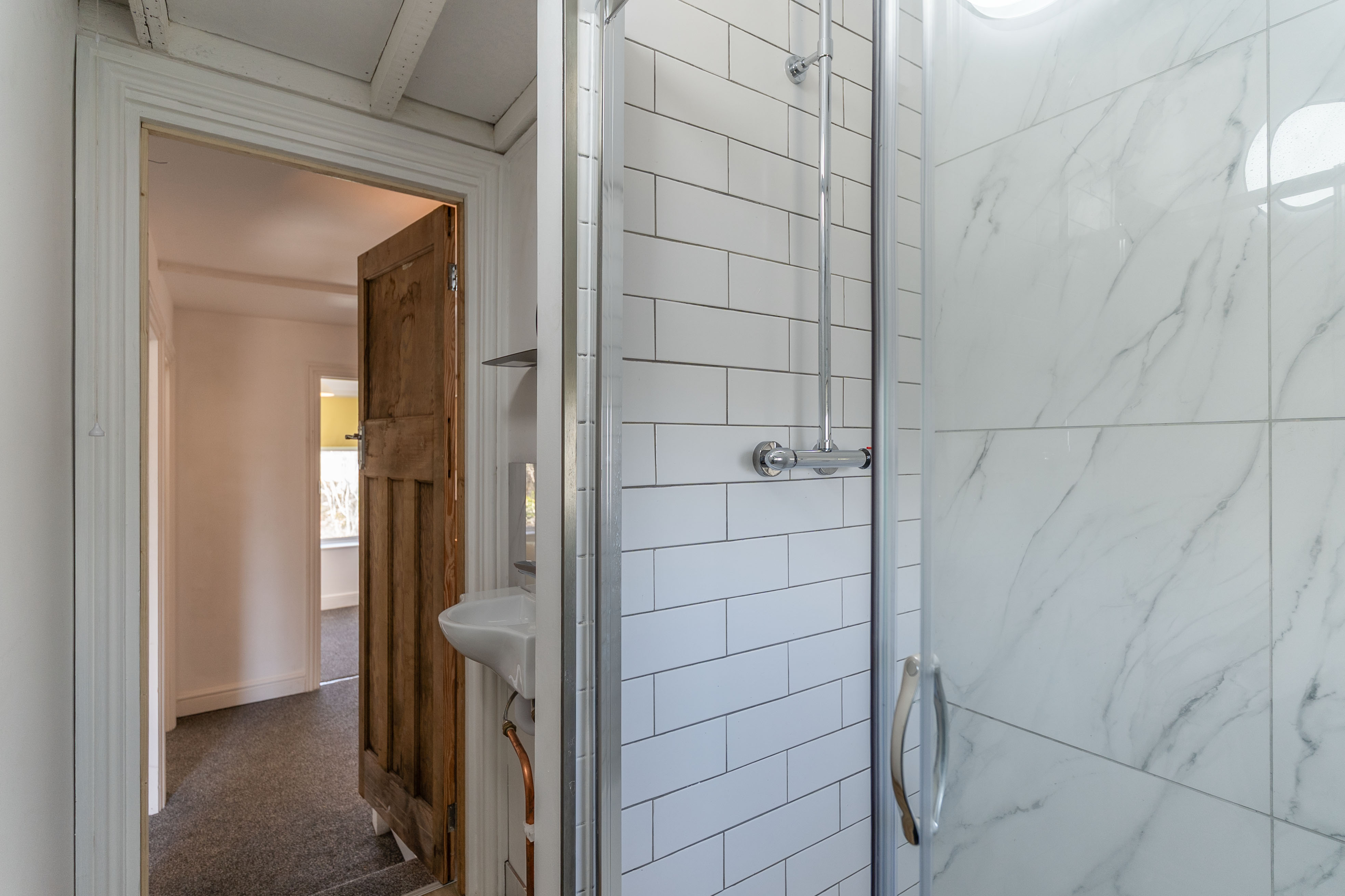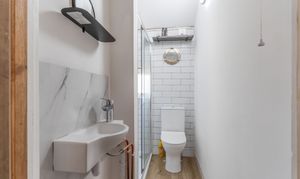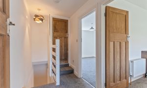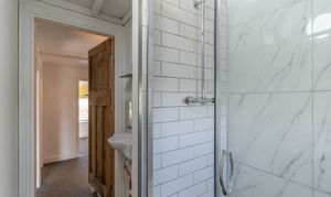 On the first floor are three bedrooms and the shower room. The property offers two double bedrooms and a third bedroom, which could also be used as a home office or cot room. The modern shower room is fitted with a WC, hand basin and walk-in shower, completing the first-floor accommodation.