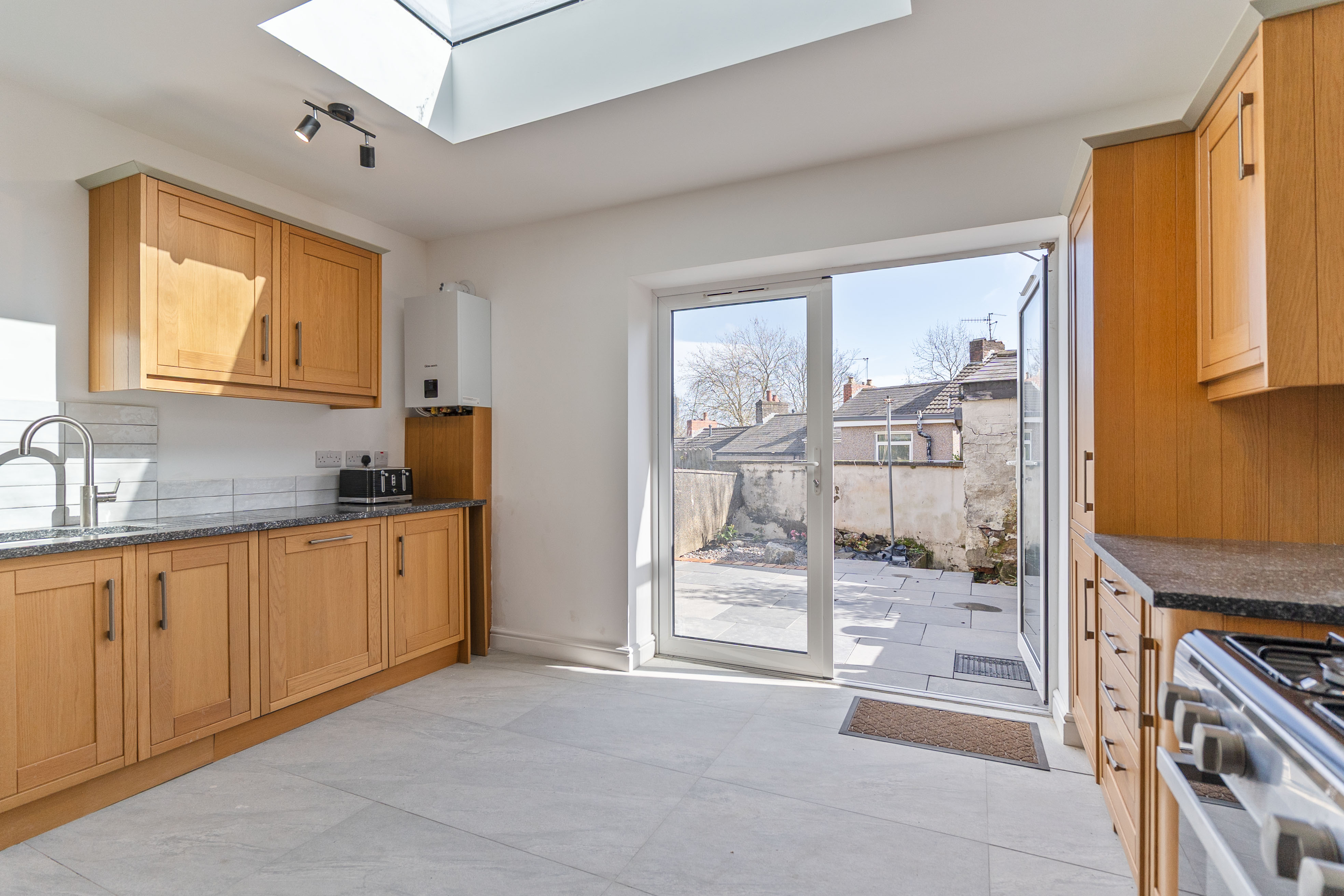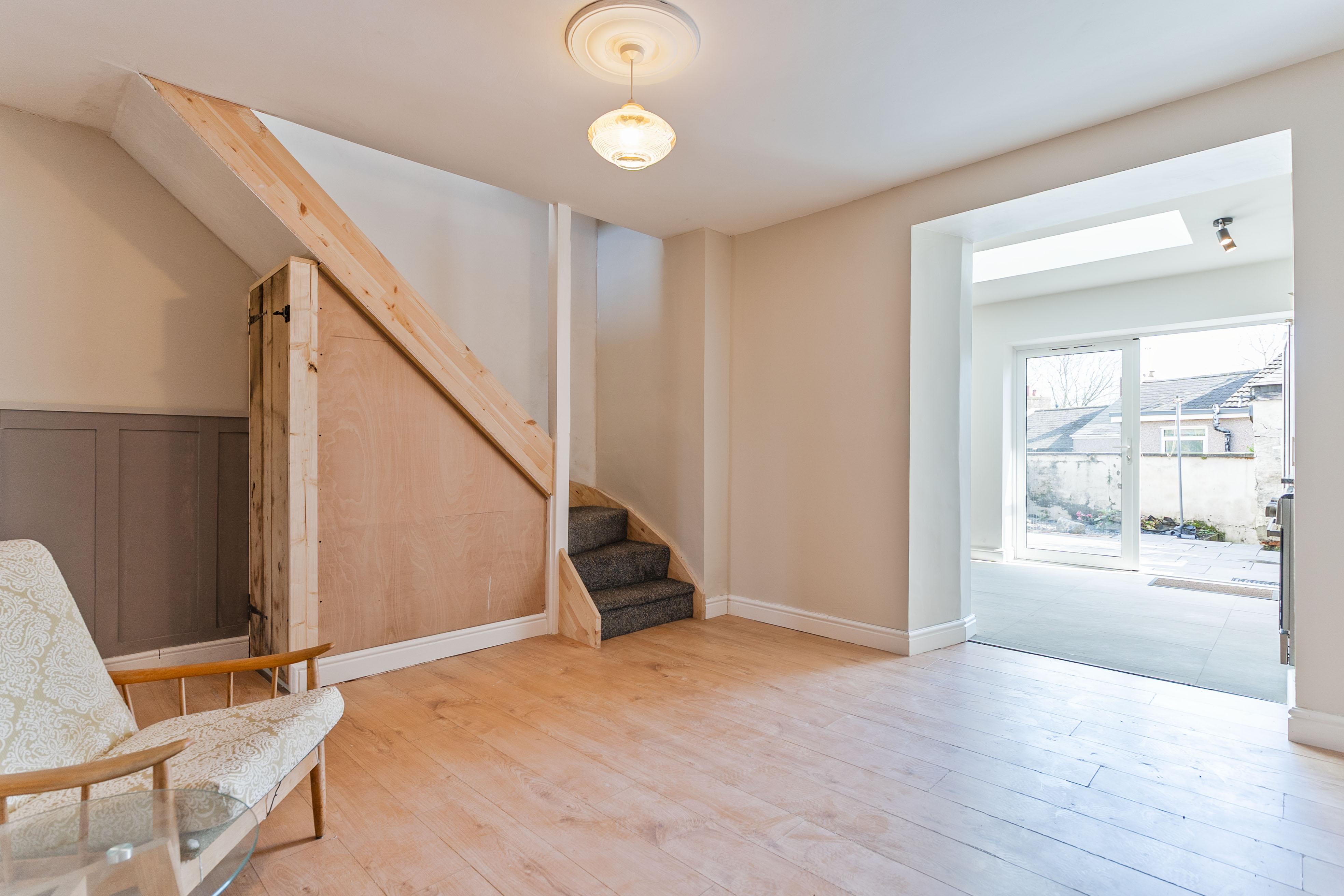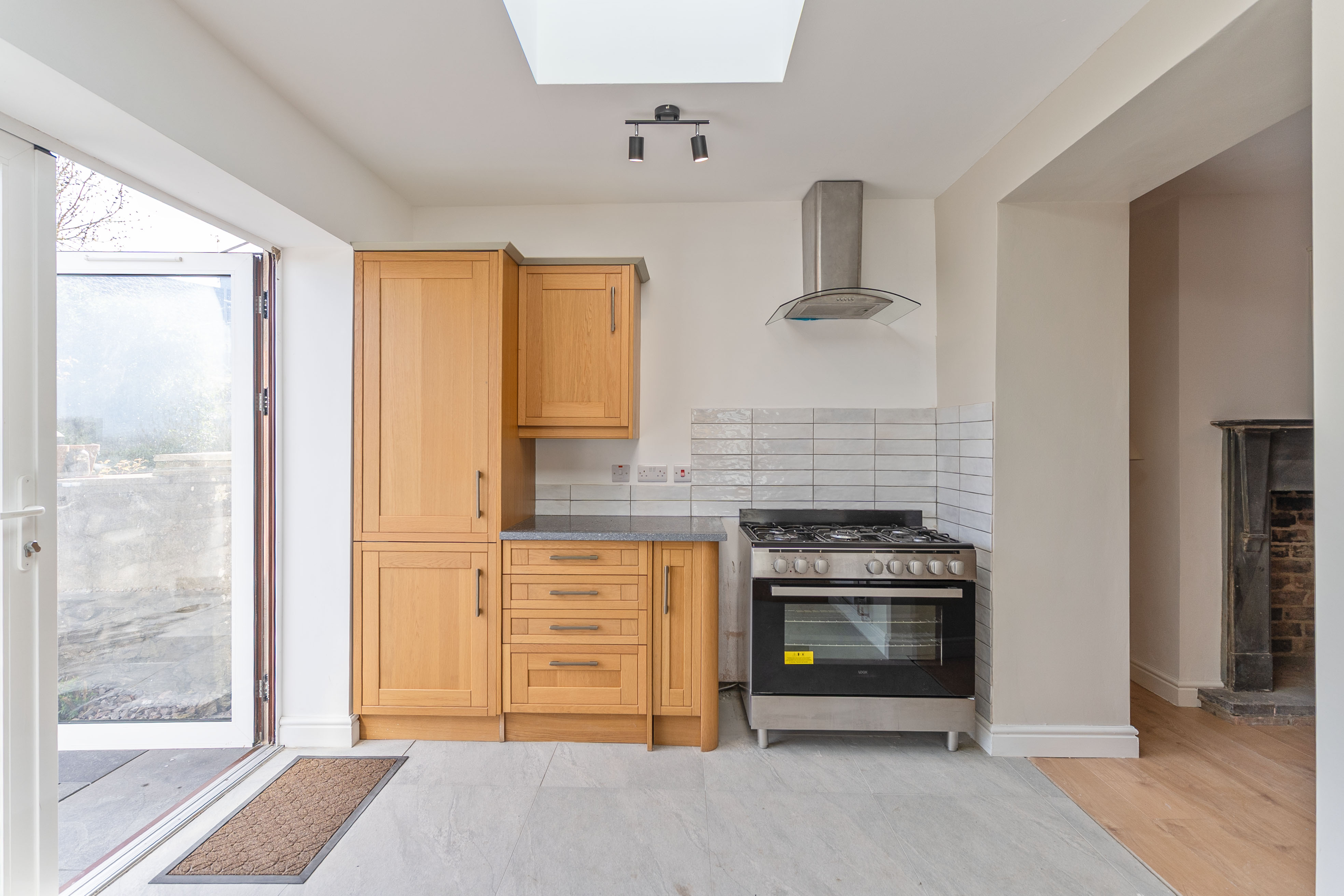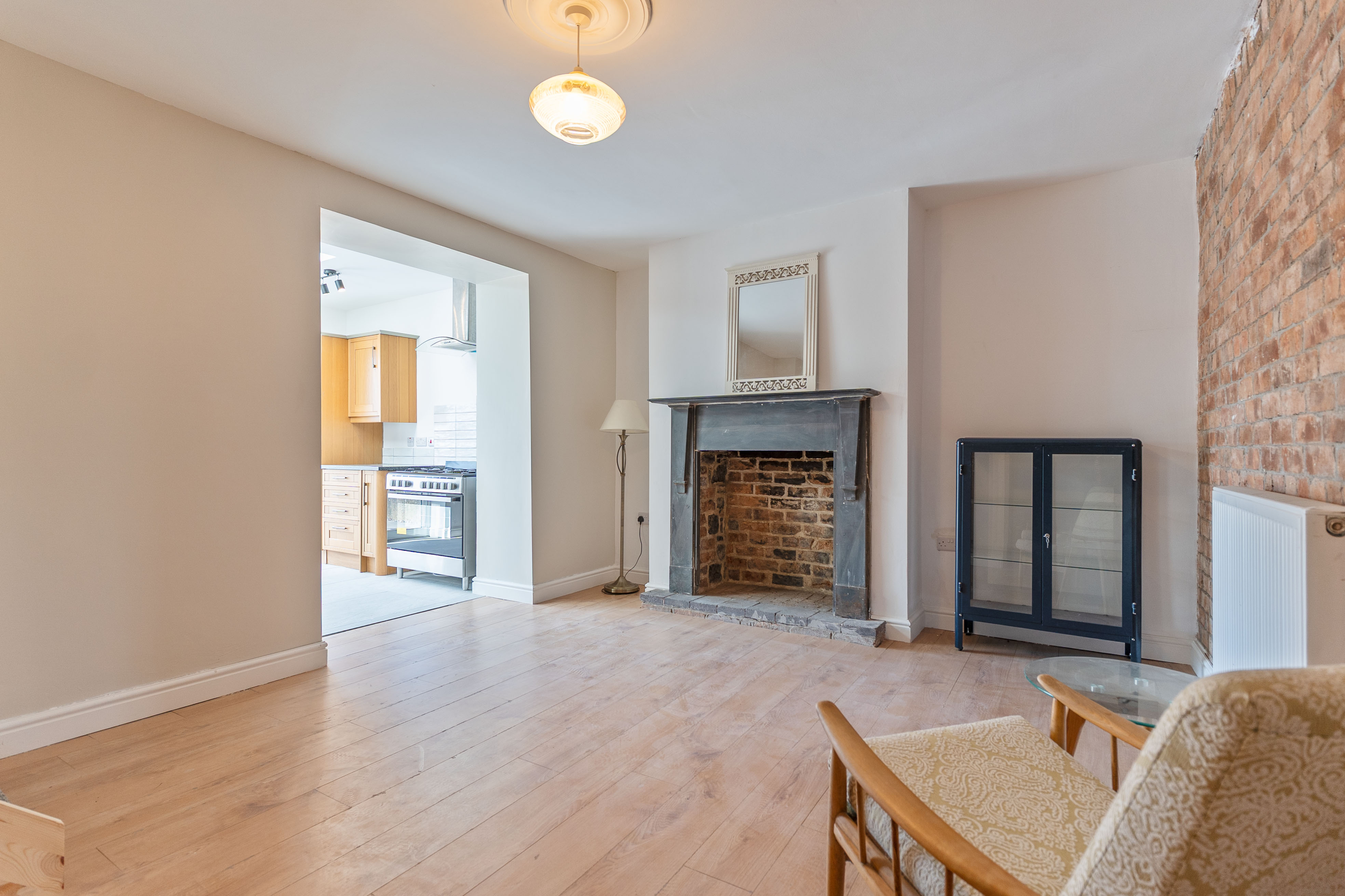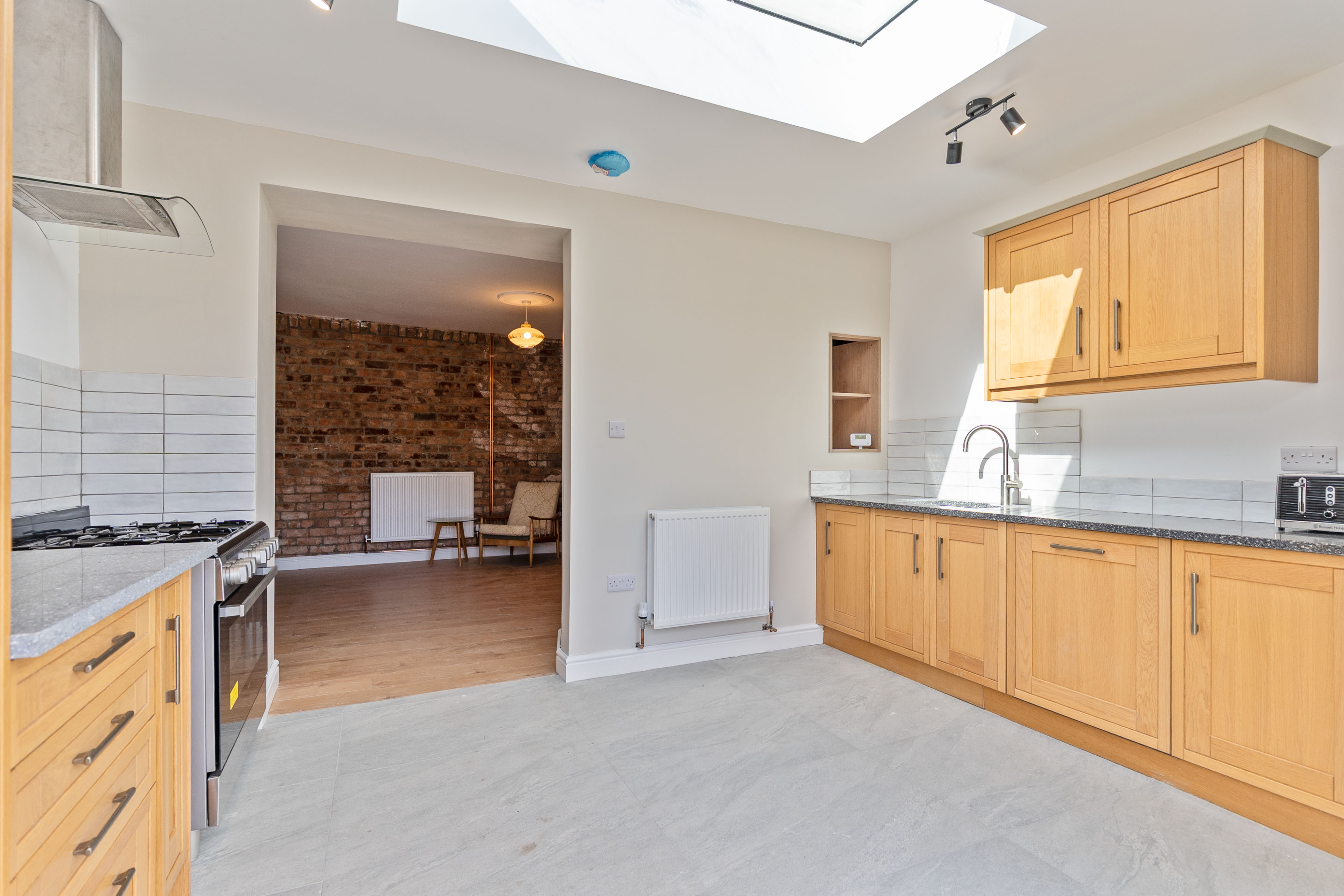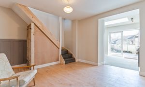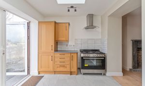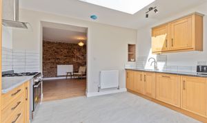 You enter the property through the hallway, which provides access to the two reception rooms. To the front is a neutrally presented living room, offering a comfortable and welcoming space for relaxation. To the rear is an open plan dining room, featuring an exposed brick wall that adds character and charm. This room also provides access through to the kitchen as well as the staircase leading up to the first floor. The kitchen is a good size and benefits from a skylight, allowing for plenty of natural light, along with patio doors that open out to the rear garden.