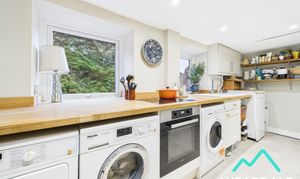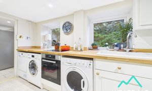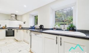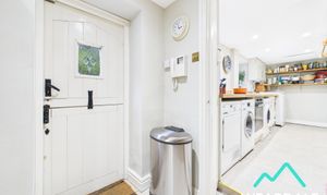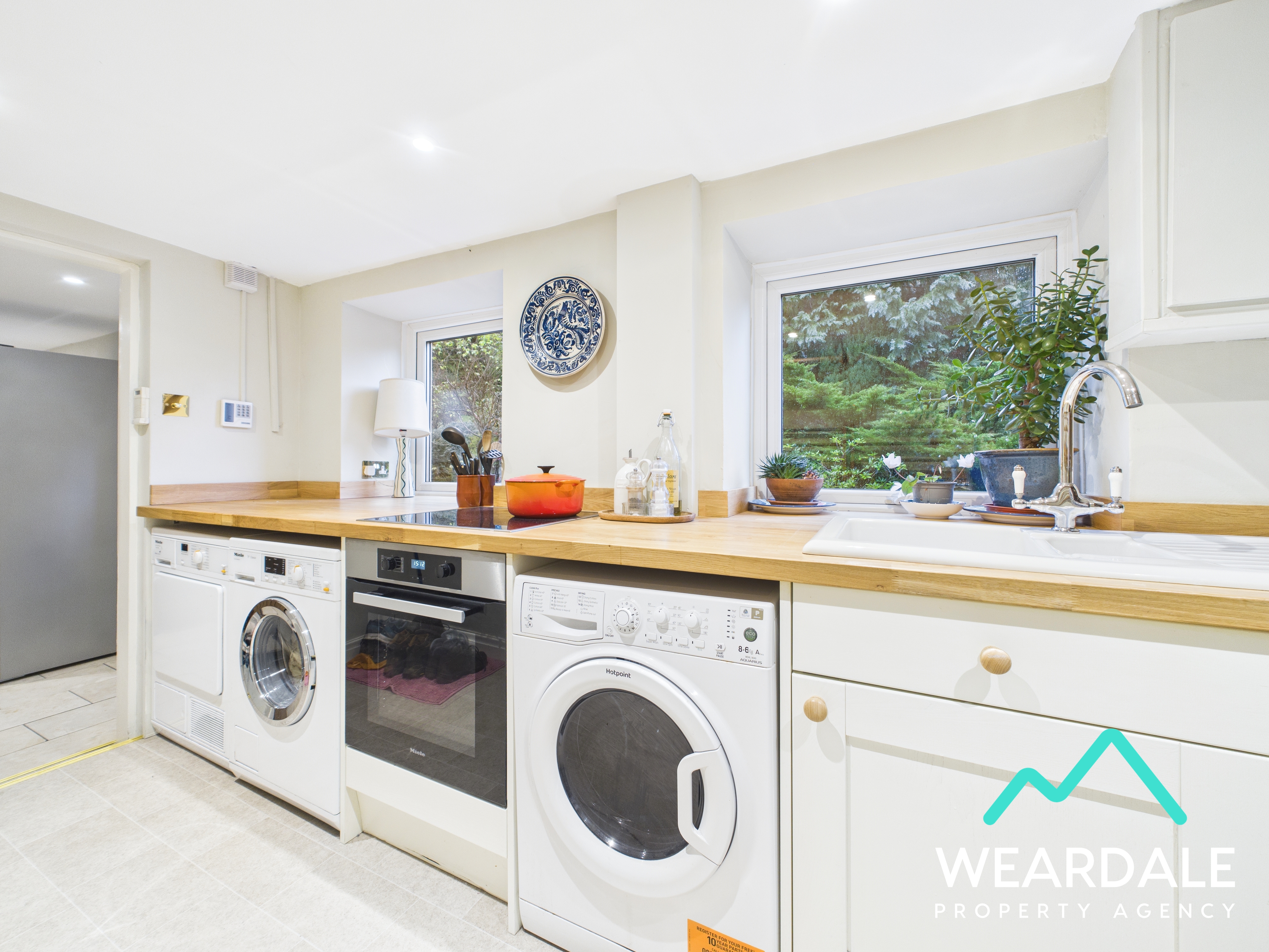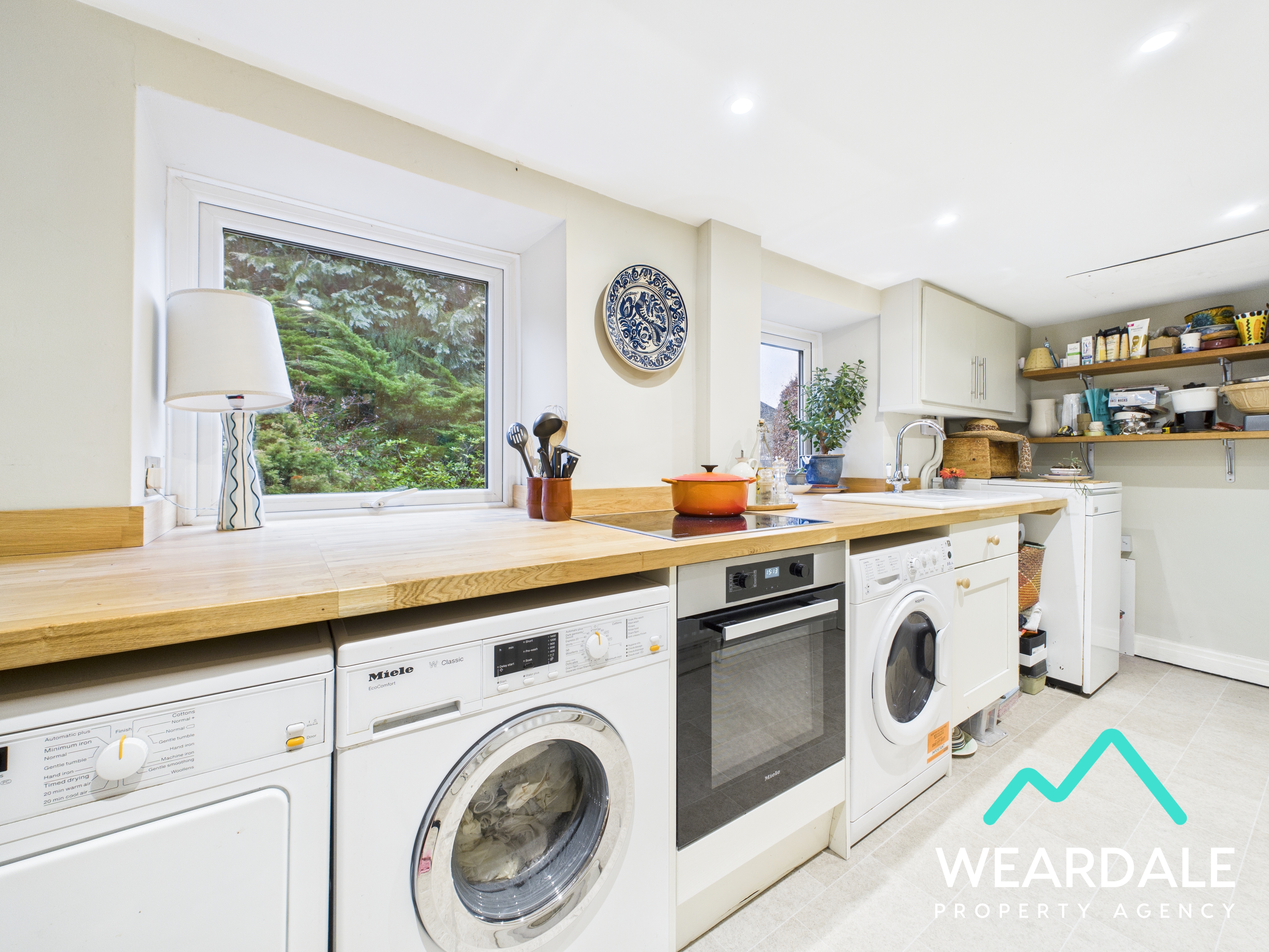 - Also positioned to the rear of the property and internally accessed via the main kitchen - 2 uPVC windows looking over the rear garden - Oak work surfaces with Miele integrated electric oven and hob - Miele washing machine - Miele tumble dryer - 1.5 porcelain sink with under counter storage drawer and cupboard - Over counter storage cupboards - Wall mounted shelving - Wall mounted drying racks - Radiator - Vinyl flooring - Ceiling spotlights - Neutrally decorated - The back kitchen is home to the property’s oil-fired system boiler which provides central heating to the whole house. This room also houses the water filtration system