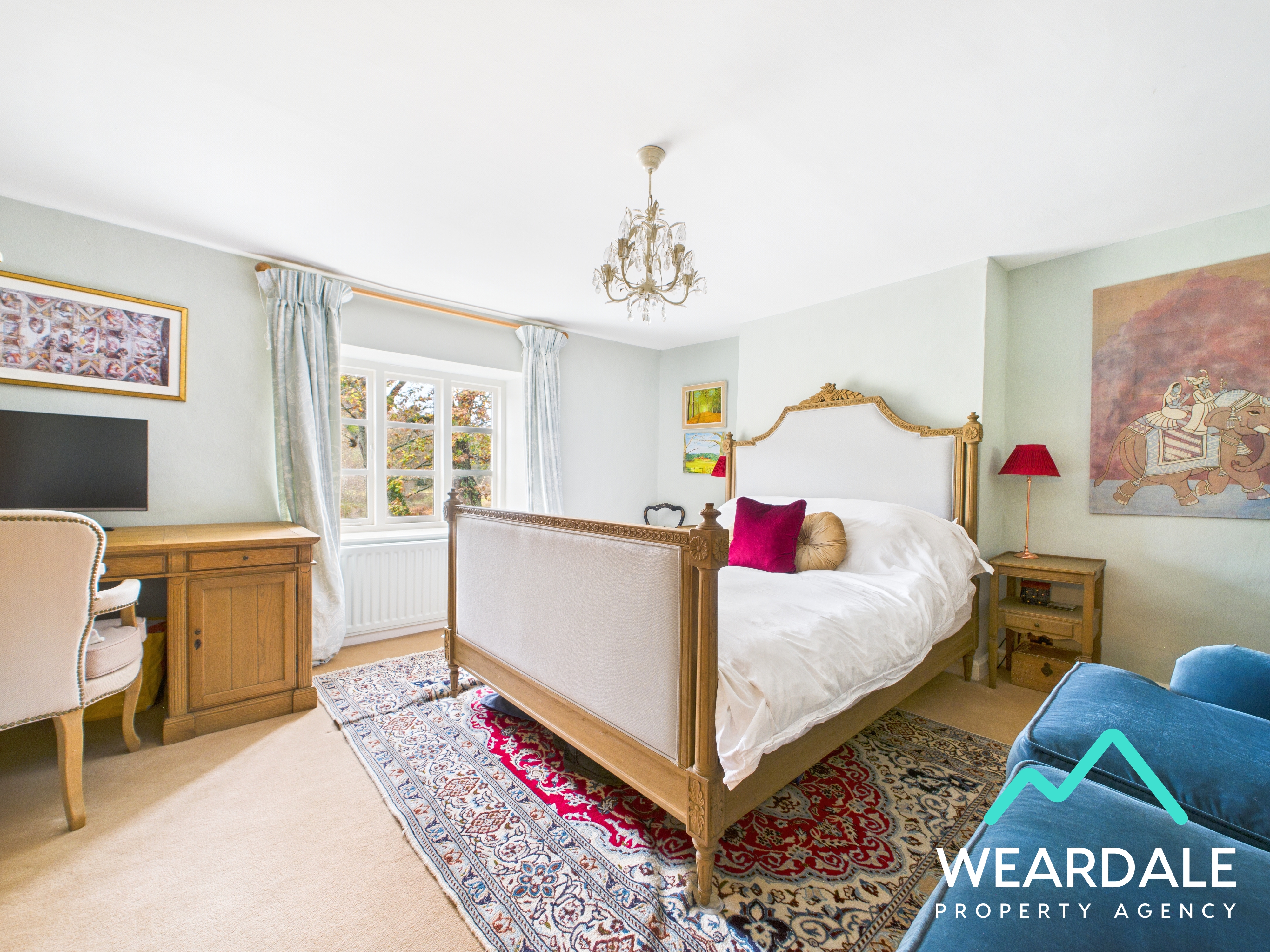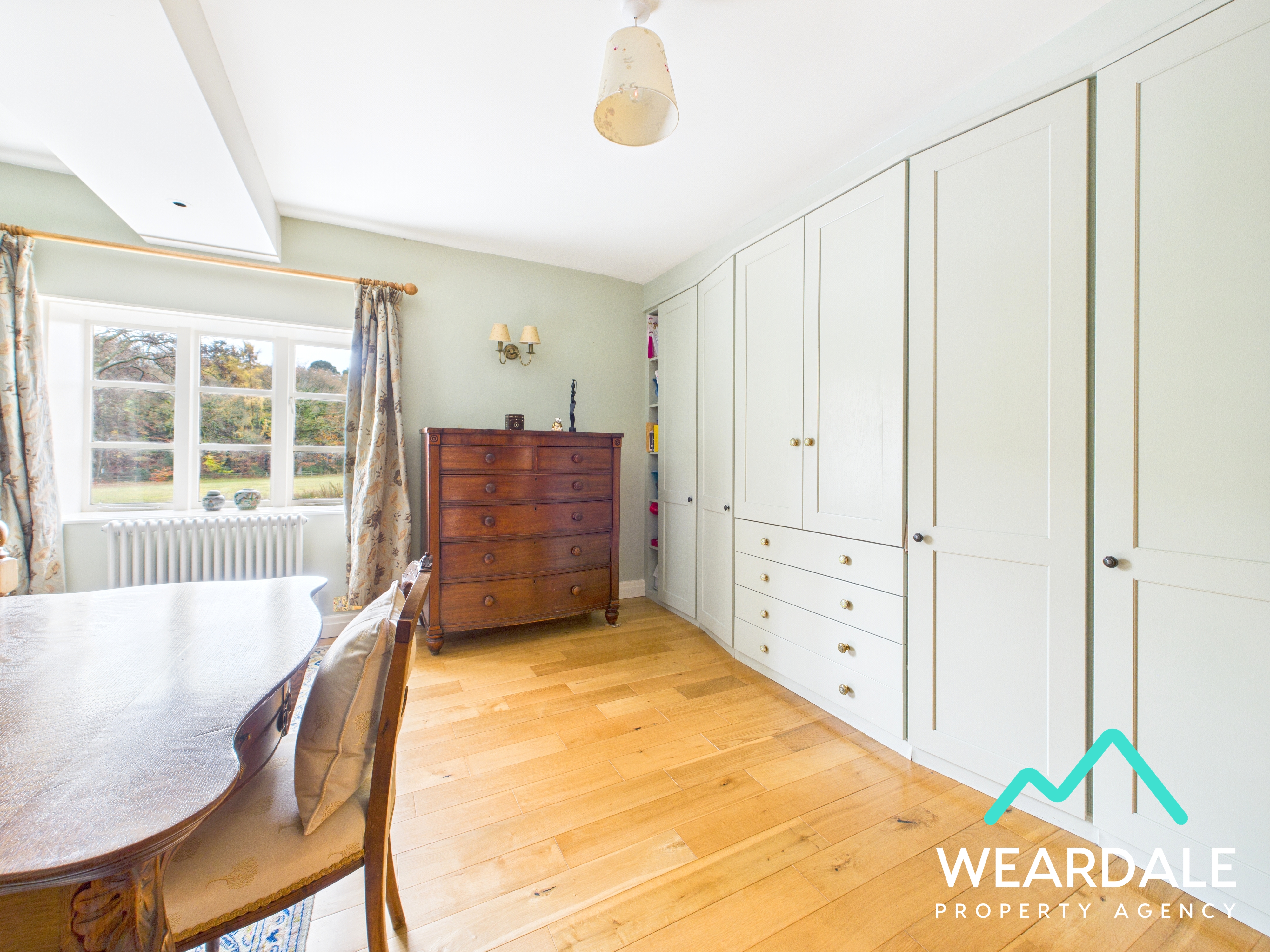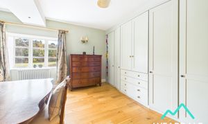 - Positioned to the front of the property in between bedrooms 2 and 4 and accessed from the landing. - Well-proportioned double room with wooden framed single glazed window to the Southern aspect with beautiful views - Carpeted - Neutrally decorated - Ceiling light fitting - Radiator - Built-in storage wardrobes with wooden doors - Space for additional freestanding storage furniture