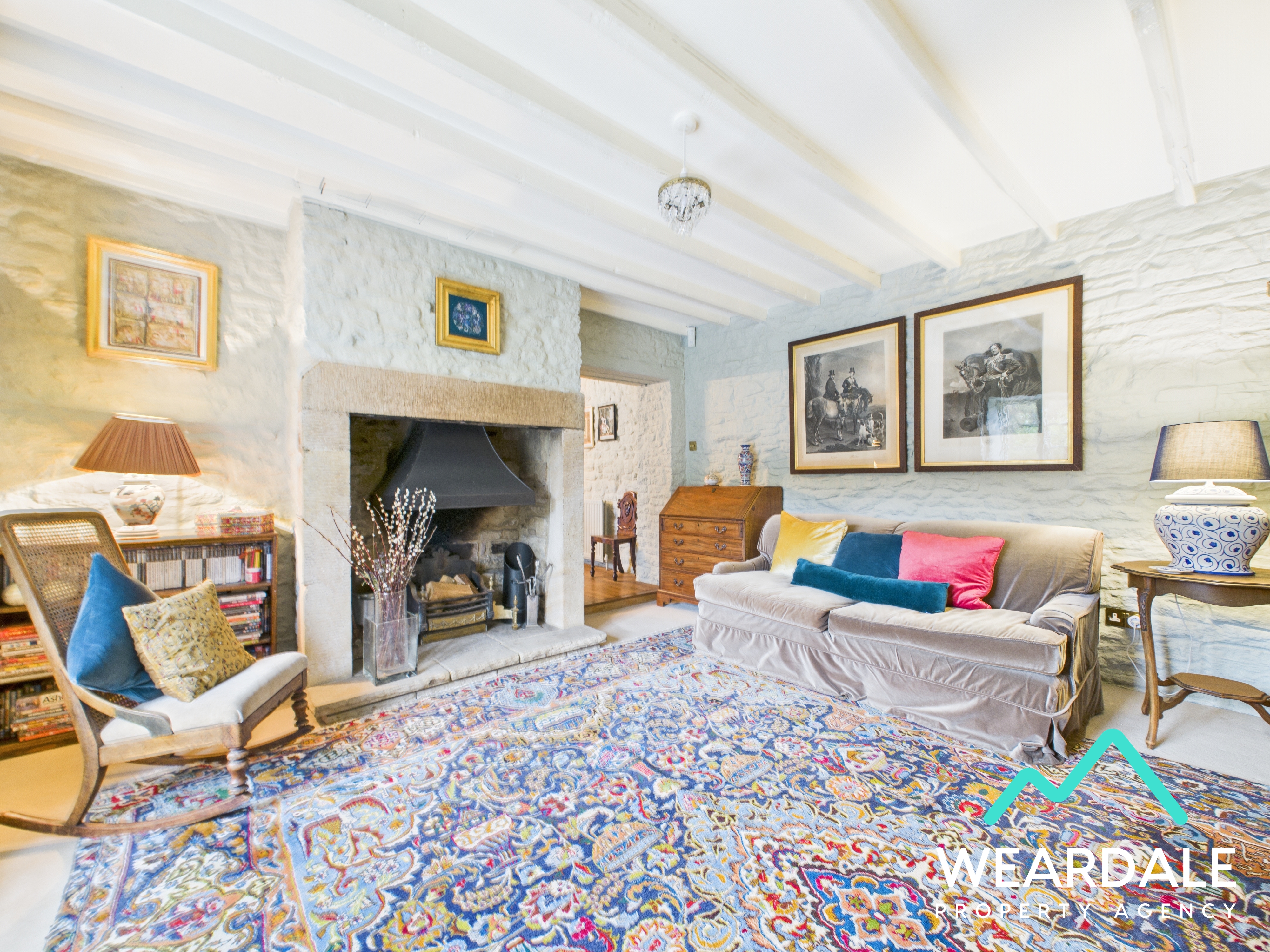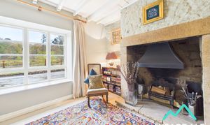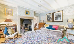 - Internally accessed from the study via an oak door, positioned to the front of the property and providing onward internal access to the dining room - Wooden framed single glazed window to the Southern aspect - Exposed wooden ceiling beams - Open fire set on a stone hearth and in a stone surround with lined chimney - Exposed stone walls to 2 sides - Carpeted - Ceiling and wall mounted light fittings - Radiator