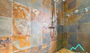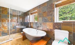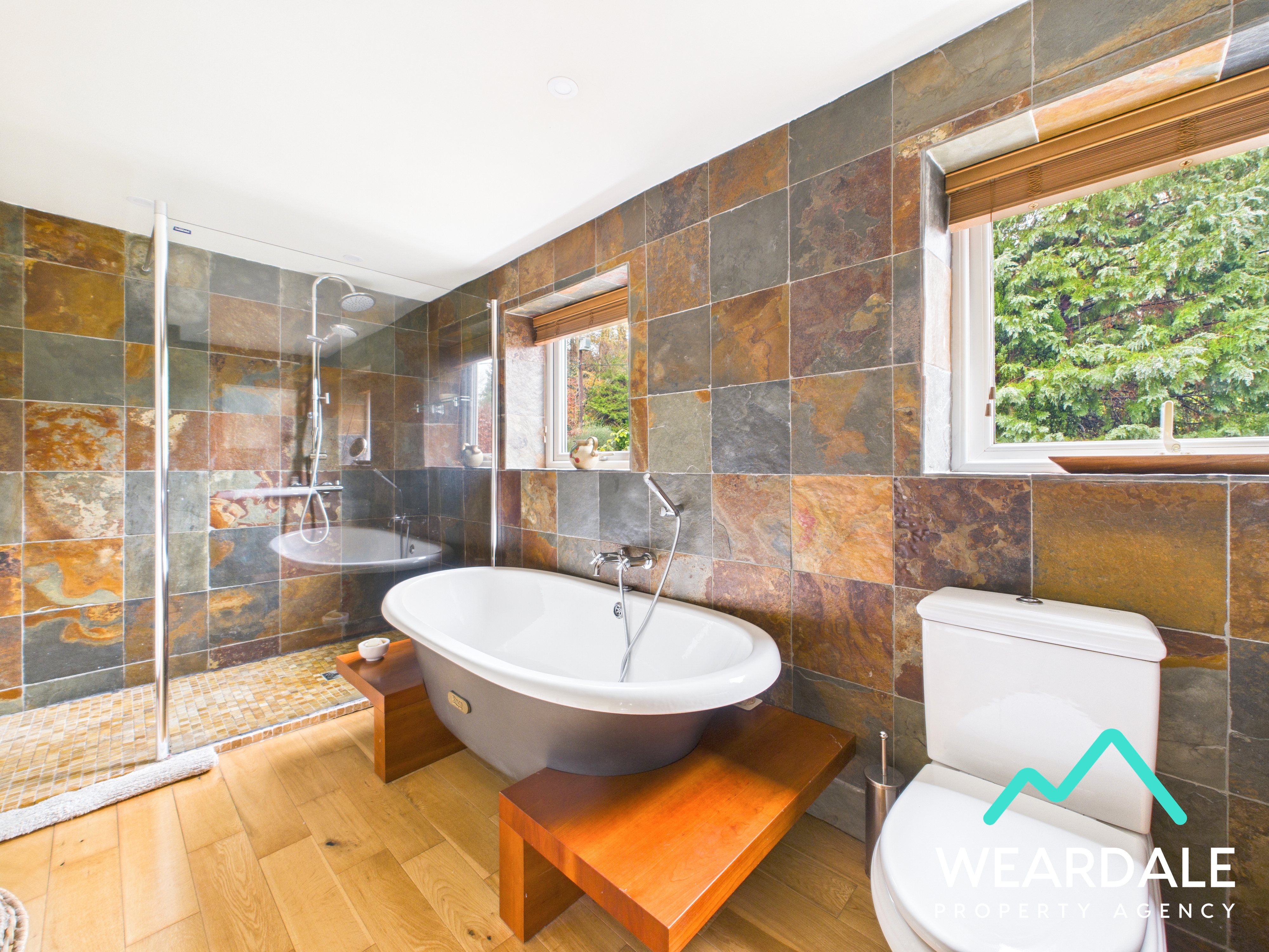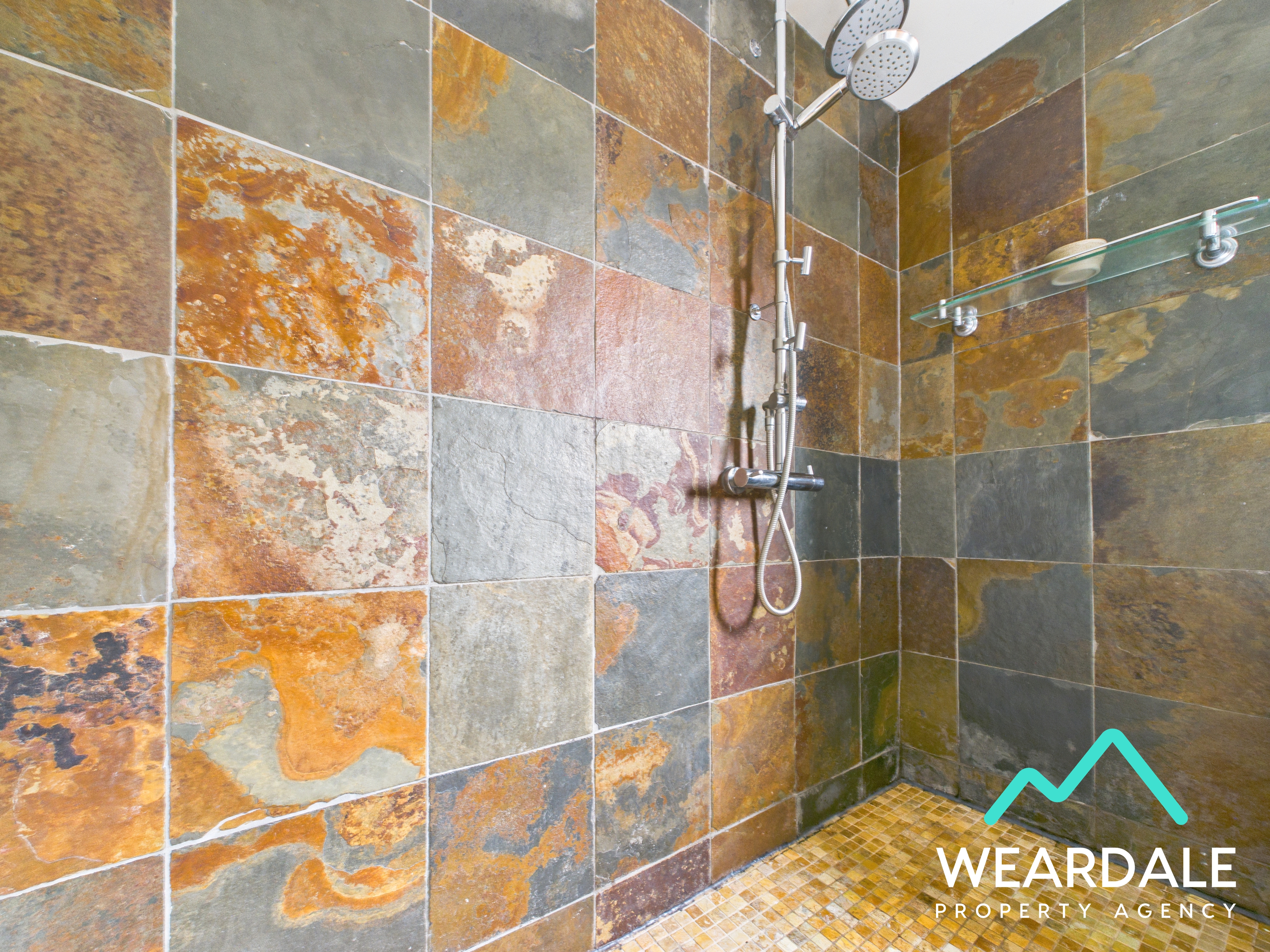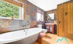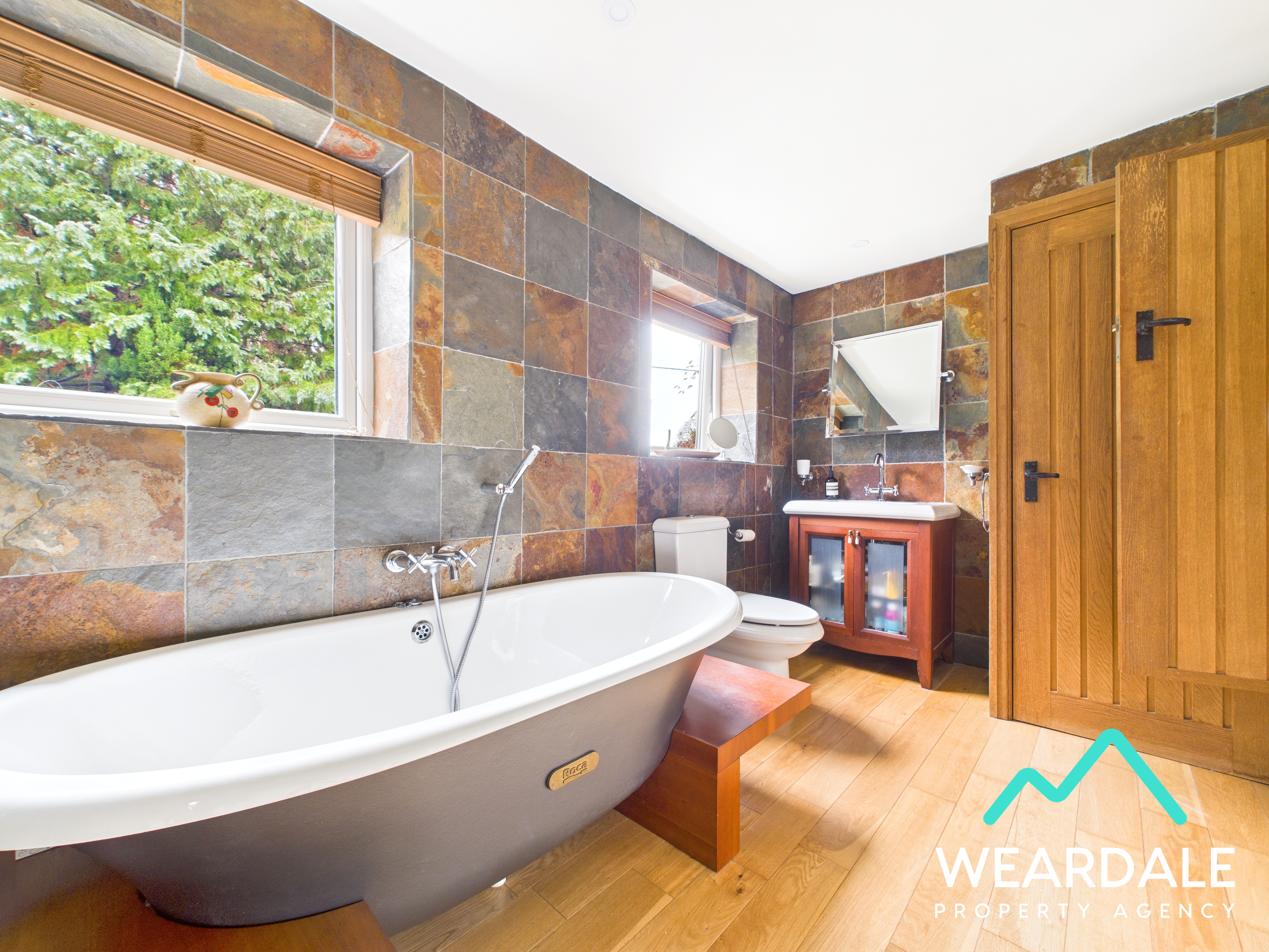 - Positioned to the rear of the property and accessed directly from bedroom one through an oak door and down two slate tiled steps - 2 uPVC windows looking over the garden to the rear - Solid oak flooring - Three walls fully tiled in fired earth slate and one wall exposed stone - Traditional column radiator with heated towel rail - Roll top bath - Large walk-in shower with fully tiled wet room style enclosure, with mains fed shower and rainfall head - WC - Hand wash basin set on wooden vanity unit with storage below - Airing cupboard with oak door which houses the property’s hot water cylinder - Ceiling spotlights