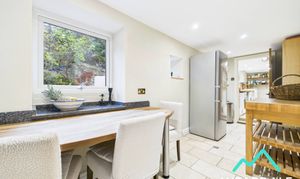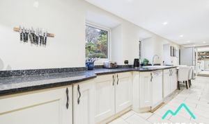 - The kitchen is positioned to the rear of the property, accessed internally via the dining room, providing onward internal access to the back kitchen and external access to the rear garden via a wooden stable door with a small frosted glass pane - Long kitchen spanning most of the rear of the property with 4 uPVC windows looking over the garden, 3 of these windows benefit from granite sills - Travertine flooring with bronze insets - Ceiling spotlights - 1.5 porcelain sink - Granite work surfaces - Integrated Miele electric oven and induction hob with overhead extractor hood - Miele dishwasher - Integrated fridge and integrated freezer, plus ample space for an additional freestanding fridge freezer - Oak topped breakfast bar - Under counter storage units - Neutrally decorated