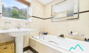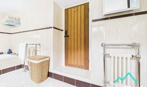 - Positioned to the rear of the property and accessed from the landing - Large family bathroom with 2 uPVC windows looking over the rear garden - Tiled flooring - Fully tiled walls - Wooden panel ceiling - Ceiling spotlights - WC - Large walk-in shower cubicle with tiled enclosure and glass screen - Mains fed shower with rainfall head - Tiled bath - Hand wash basin - The bathroom benefits from low level cupboard doors which provide access to an opening which has been boarded and insulated with the installation of plumbing and electrical supply to allow the new owners to convert into an additional ensuite linked to bedroom 2 if desired. The space measures 2.33 x 1.85