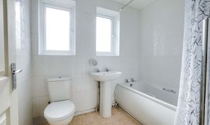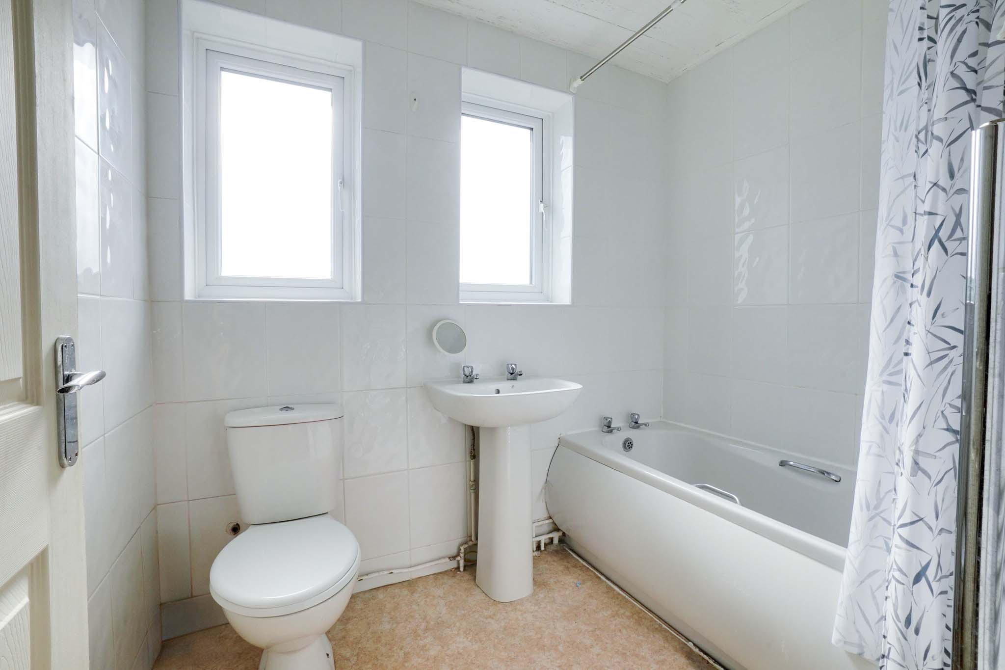 With two double glazed windows to the rear elevation, bath with electric shower over, low-level WC, pedestal wash hand basin, tiled walls, vinyl floor, heated chrome towel rail.