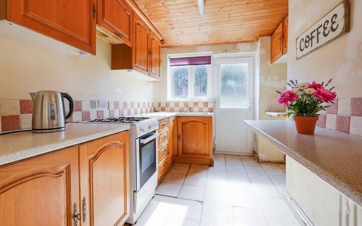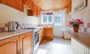 Measurement narrowing to 2.05 m. With double glazed door and window to the rear elevation, sink and drainer unit, a range of wall and base units with work surface over, gas cooker point, plumbing for washing machine, breakfast bar, under stairs storage cupboard with meters, vinyl floor, part tiled walls, radiator.