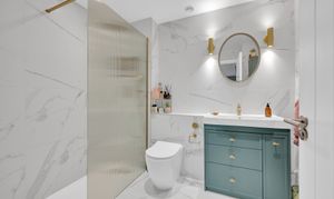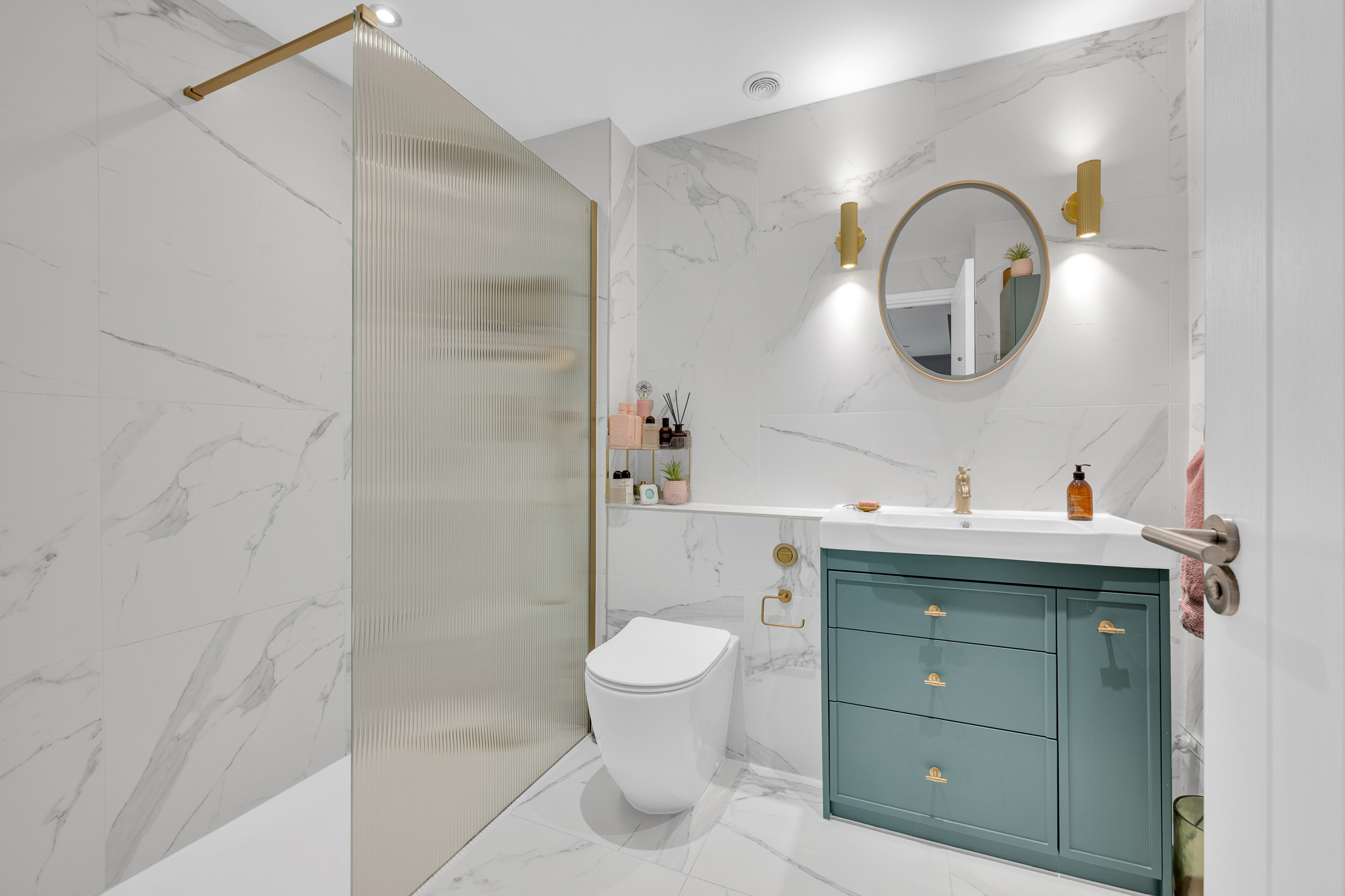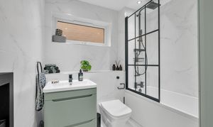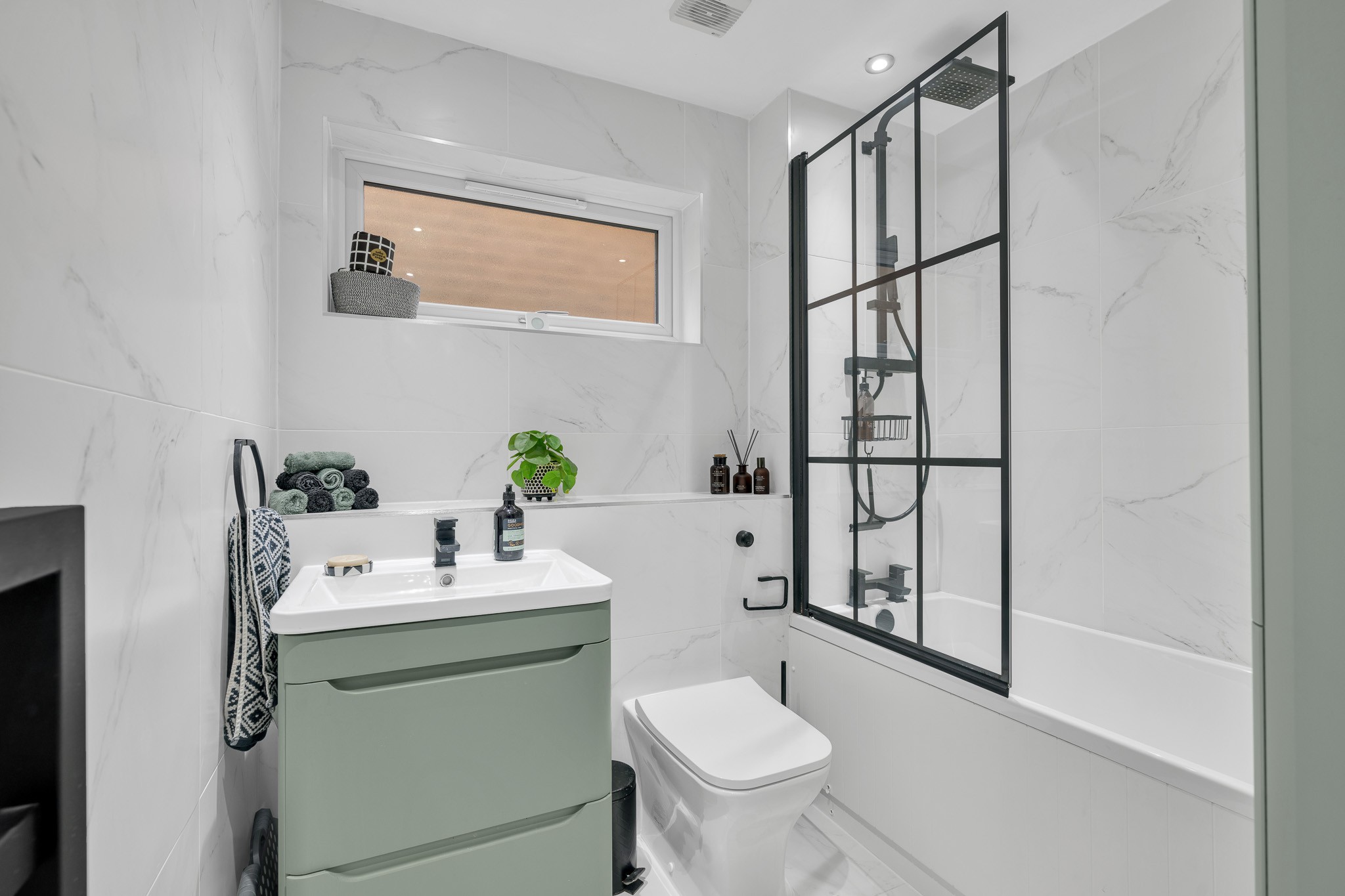 The family bathroom continues the high specification theme, with marble finishes, a bath with overhead shower and Crittall-style screen, and a contemporary vanity unit.