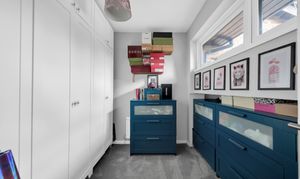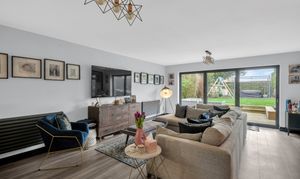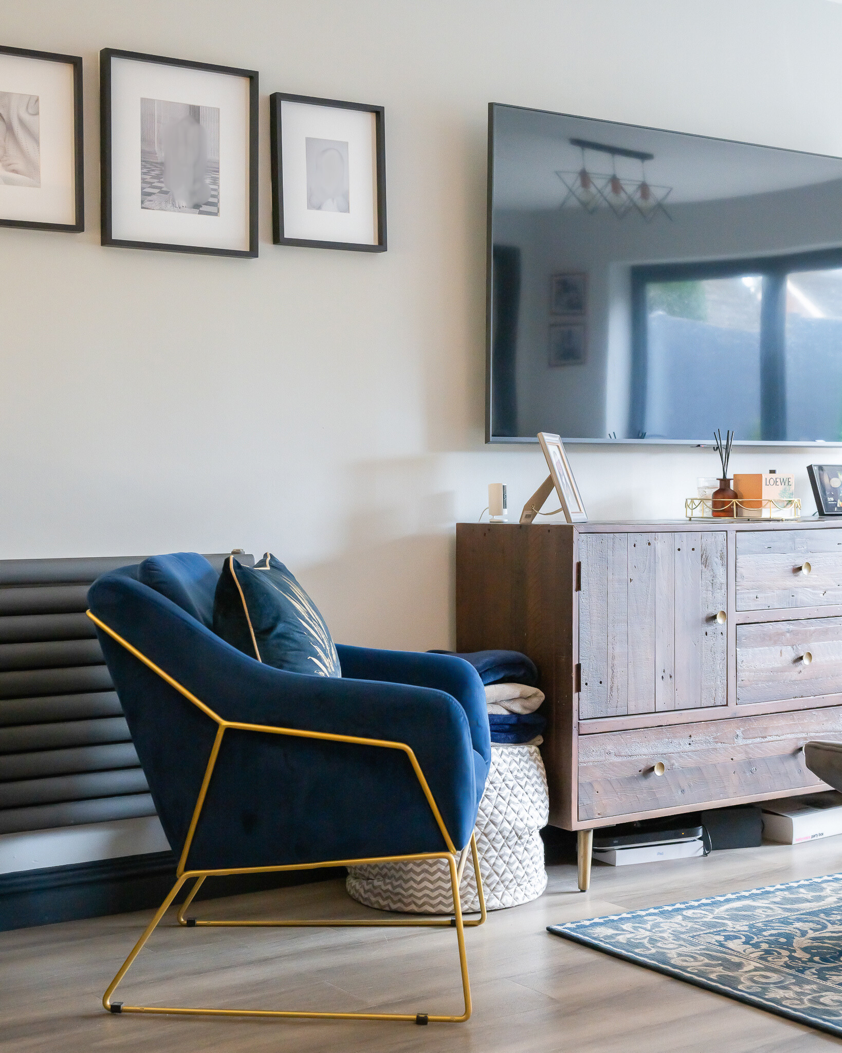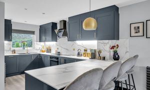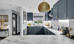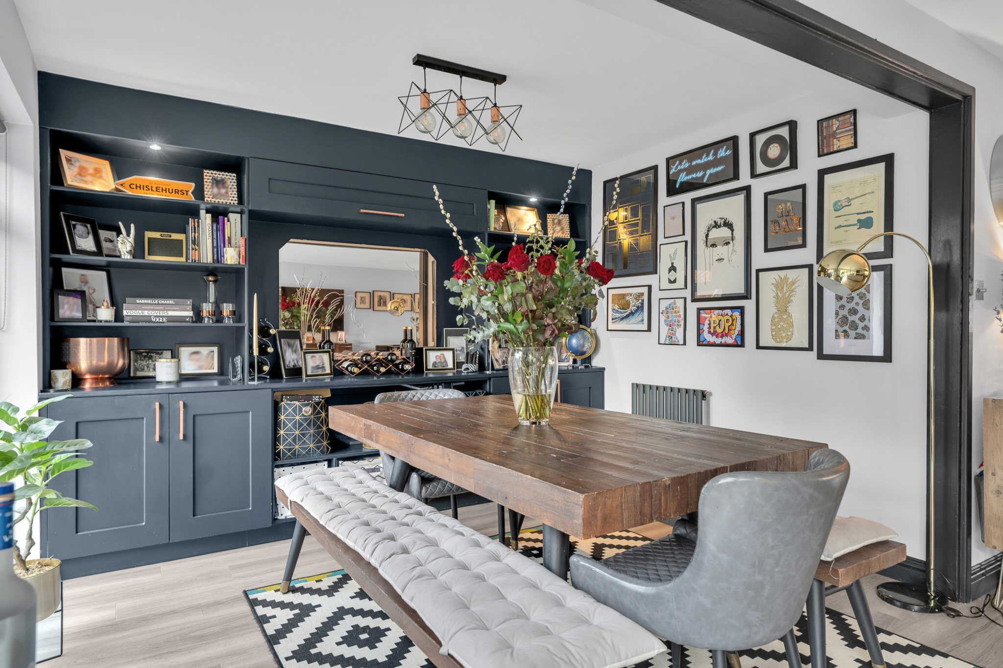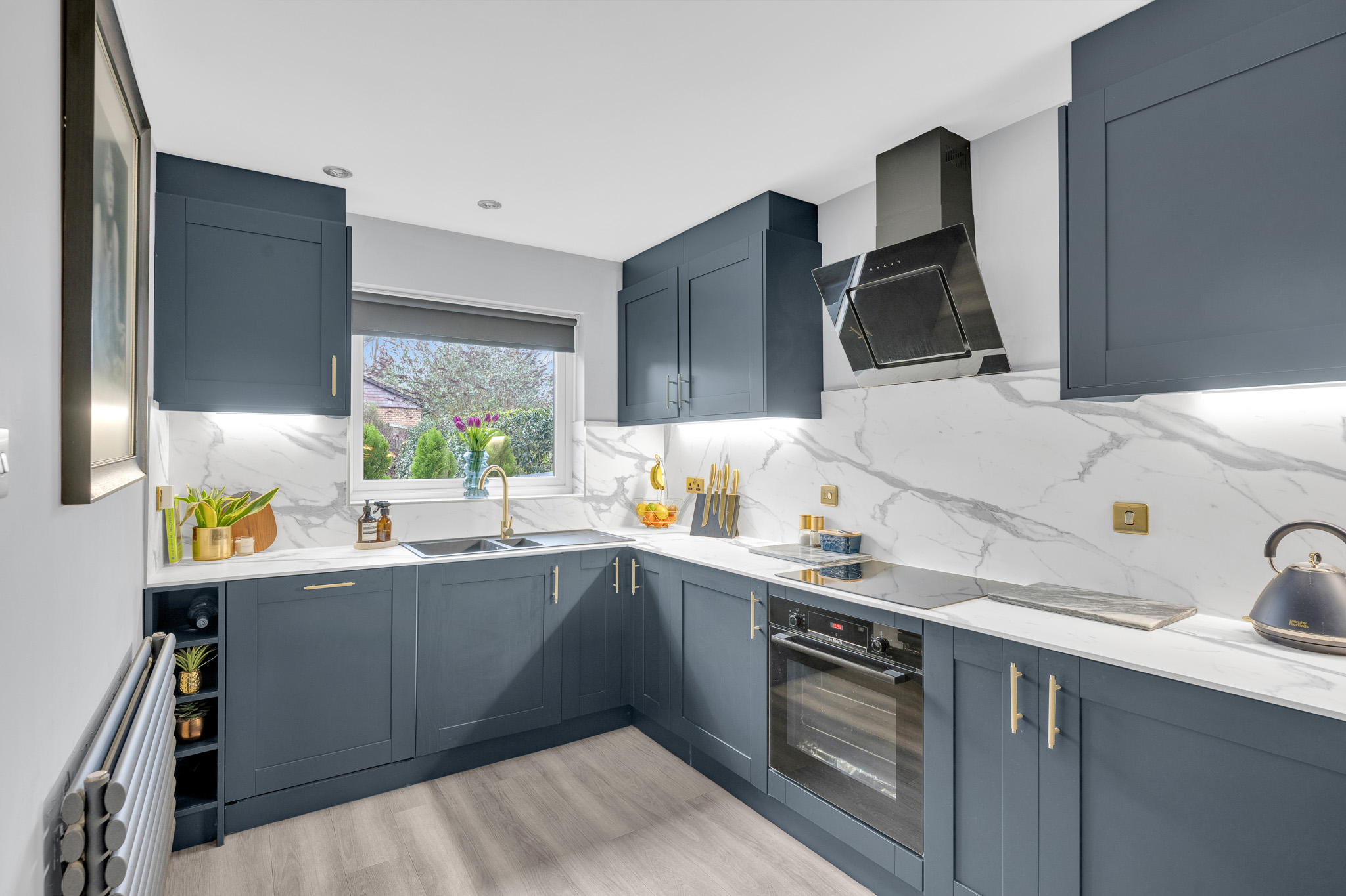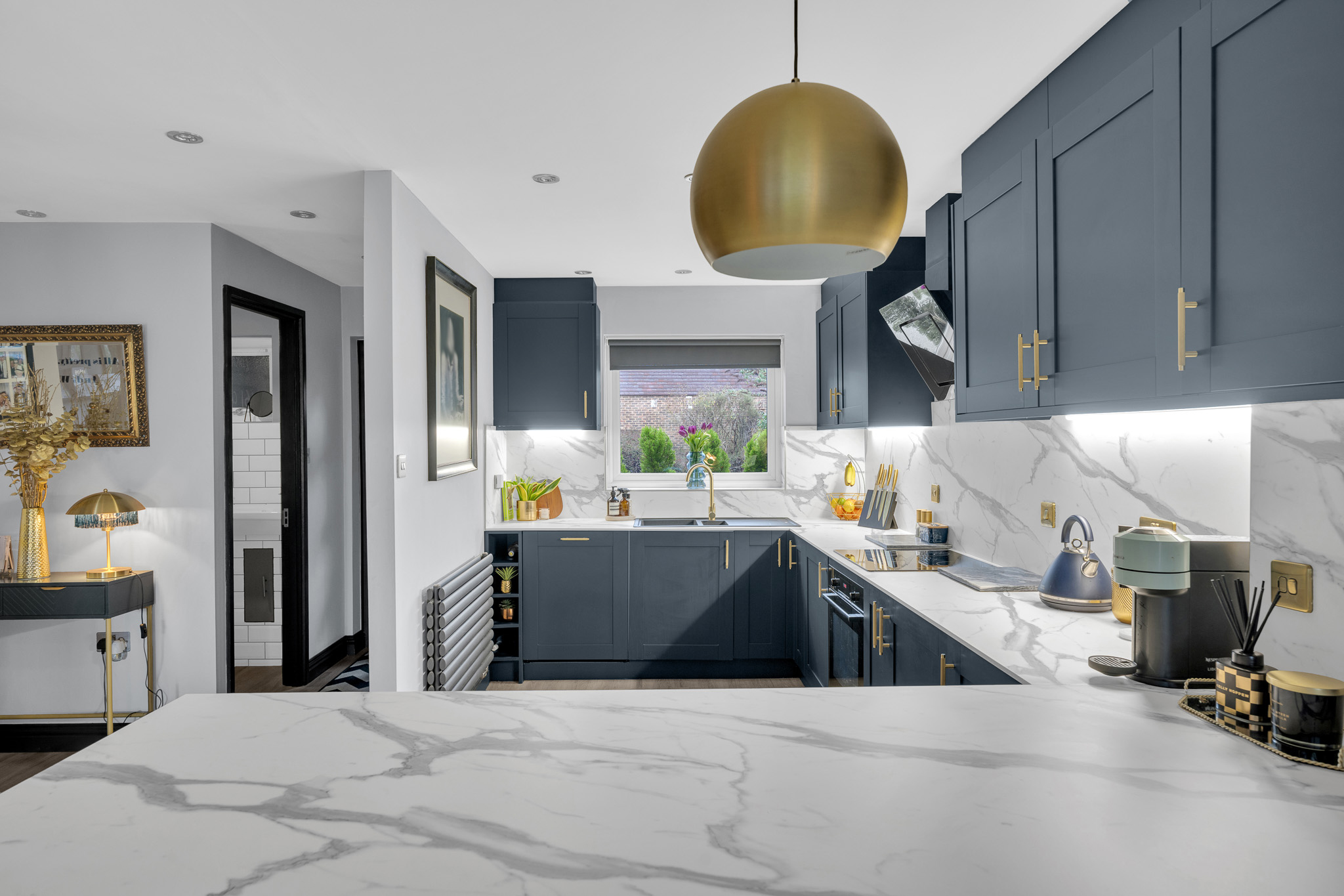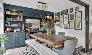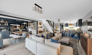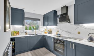 The contemporary kitchen features striking dark blue cabinetry, marble work surfaces and a generous breakfast bar, seamlessly flowing into relaxed seating and dining areas. A wall of bespoke built-in shelving and storage enhances both style and practicality, while wide bi-fold doors open directly onto the south-westerly garden, creating a seamless indoor-outdoor connection.