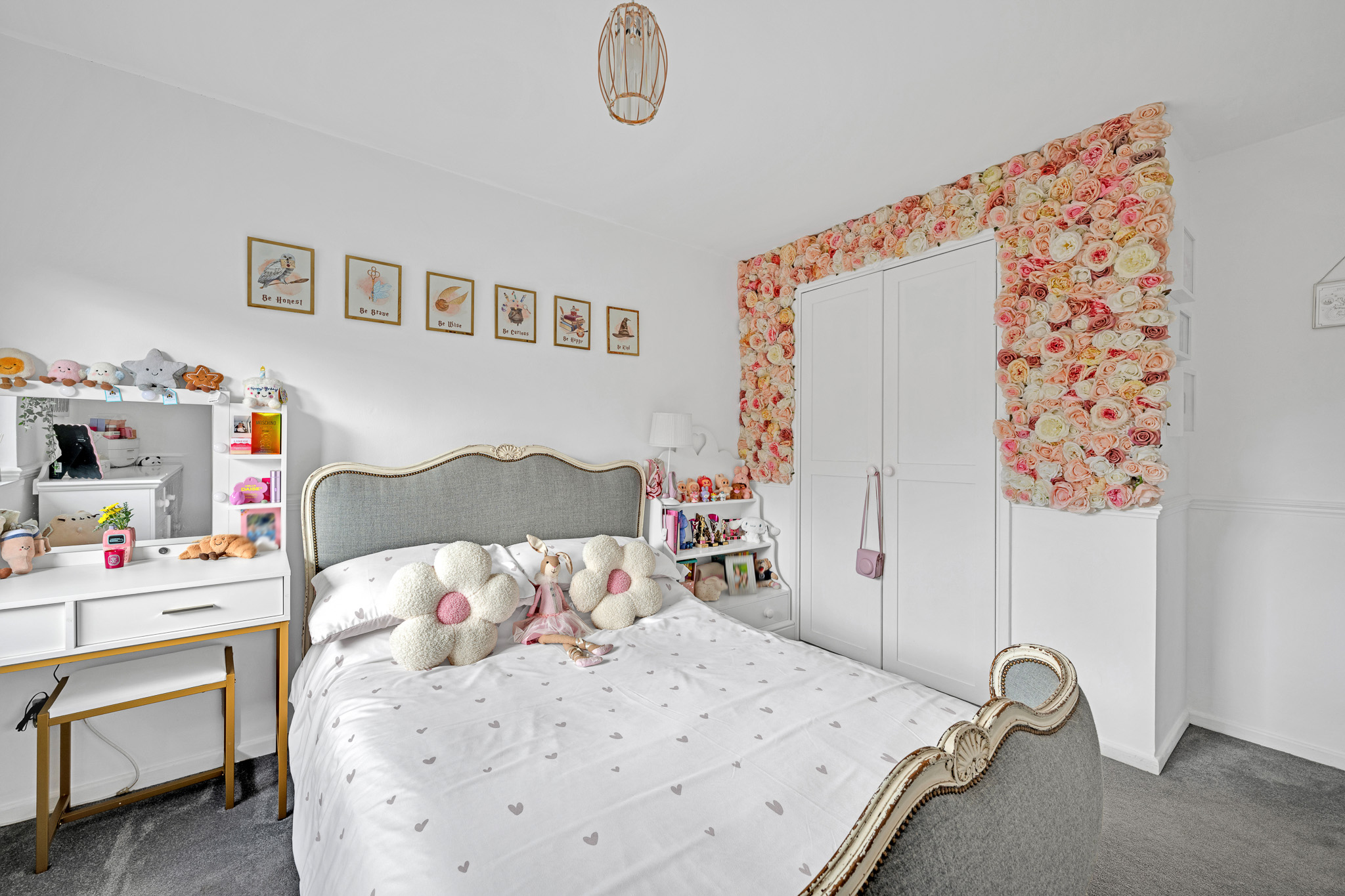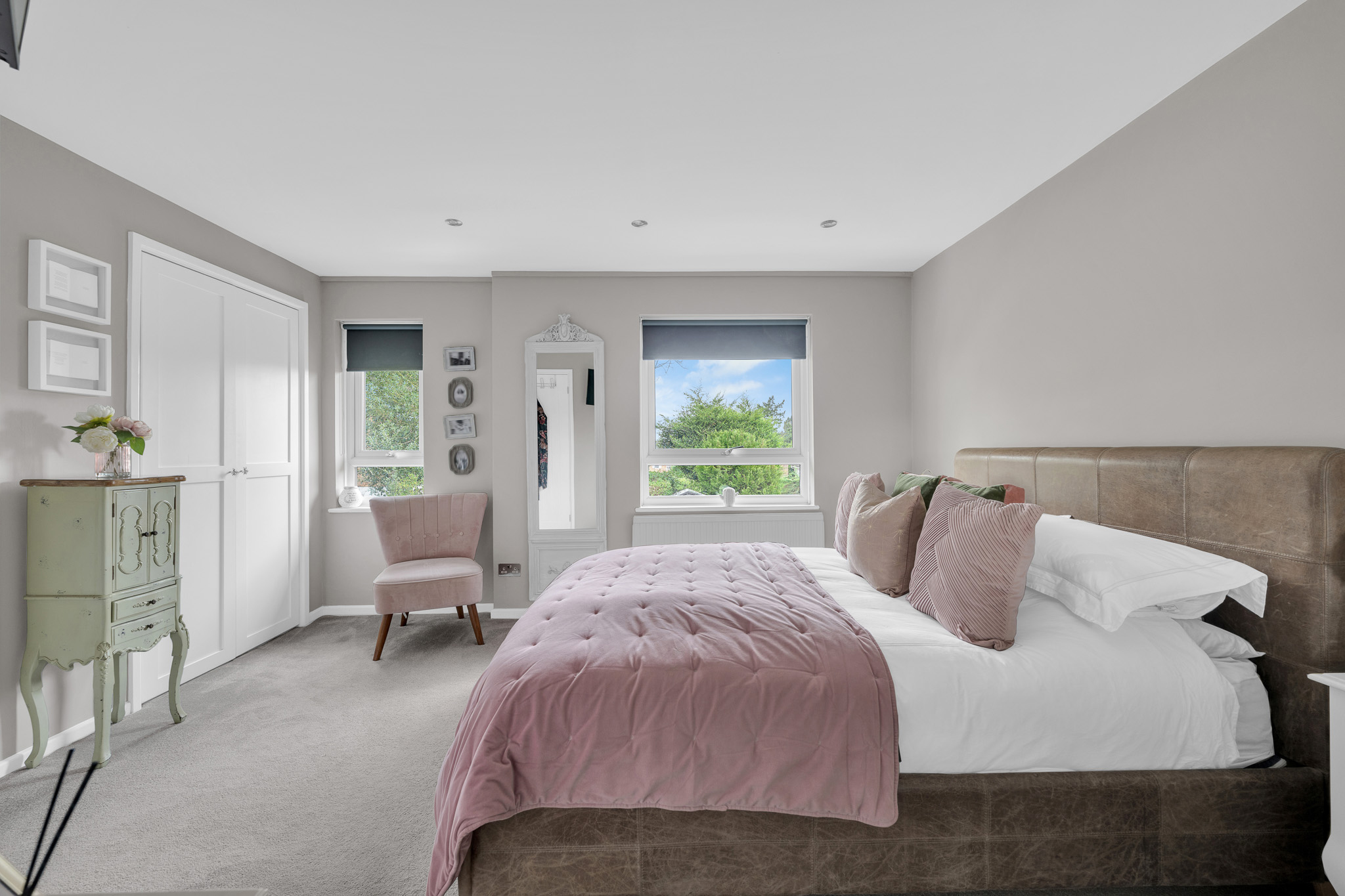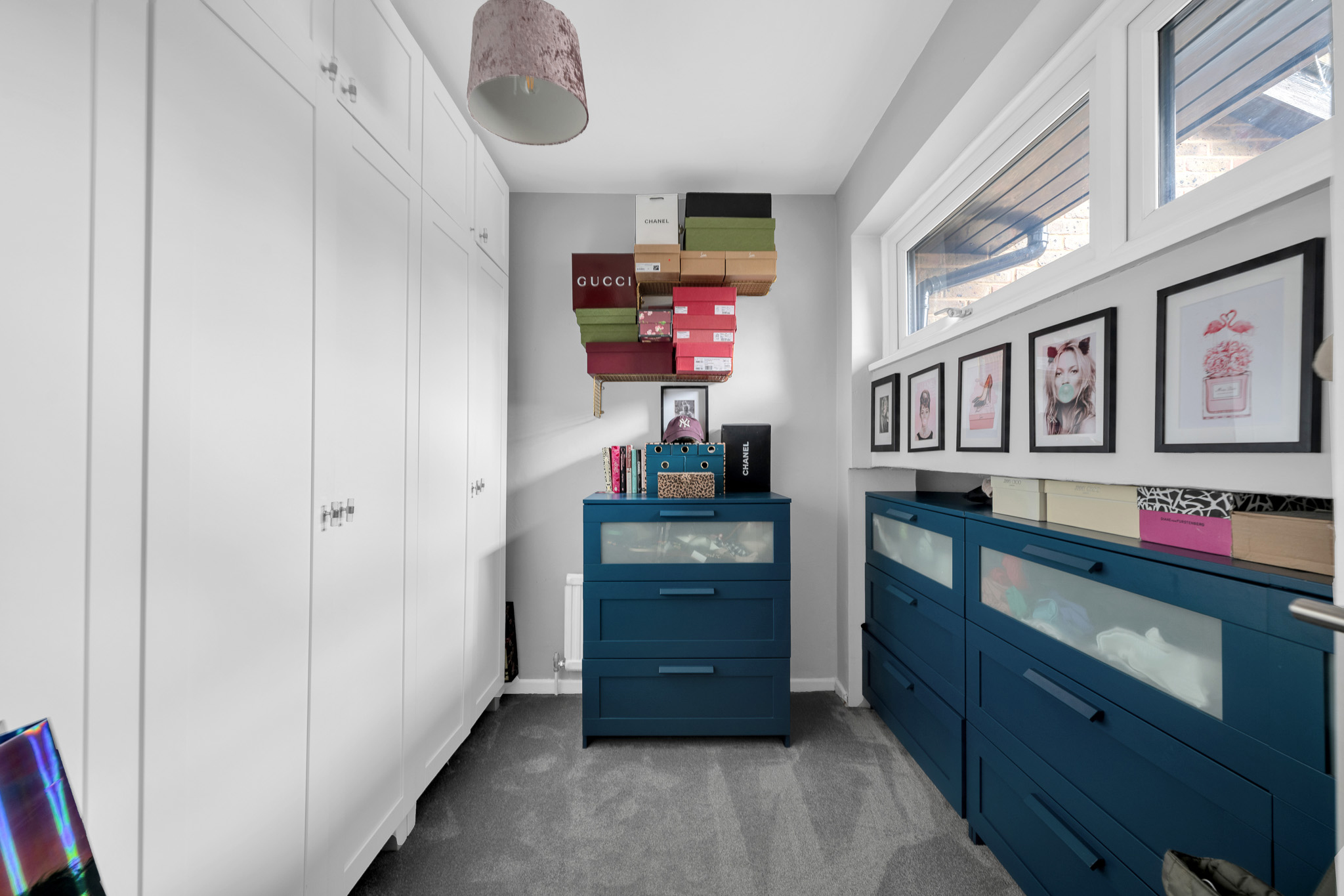 Upstairs, all five bedrooms are thoughtfully arranged on the first floor. The principal suite is particularly generous, featuring built-in wardrobes and a luxurious en-suite shower room with marble tiling, a walk-in shower and elegant gold-tone fittings. Bedrooms two and three also benefit from fitted wardrobes, whilst bedrooms four and five provide versatility as a nursery, home office or dressing room.