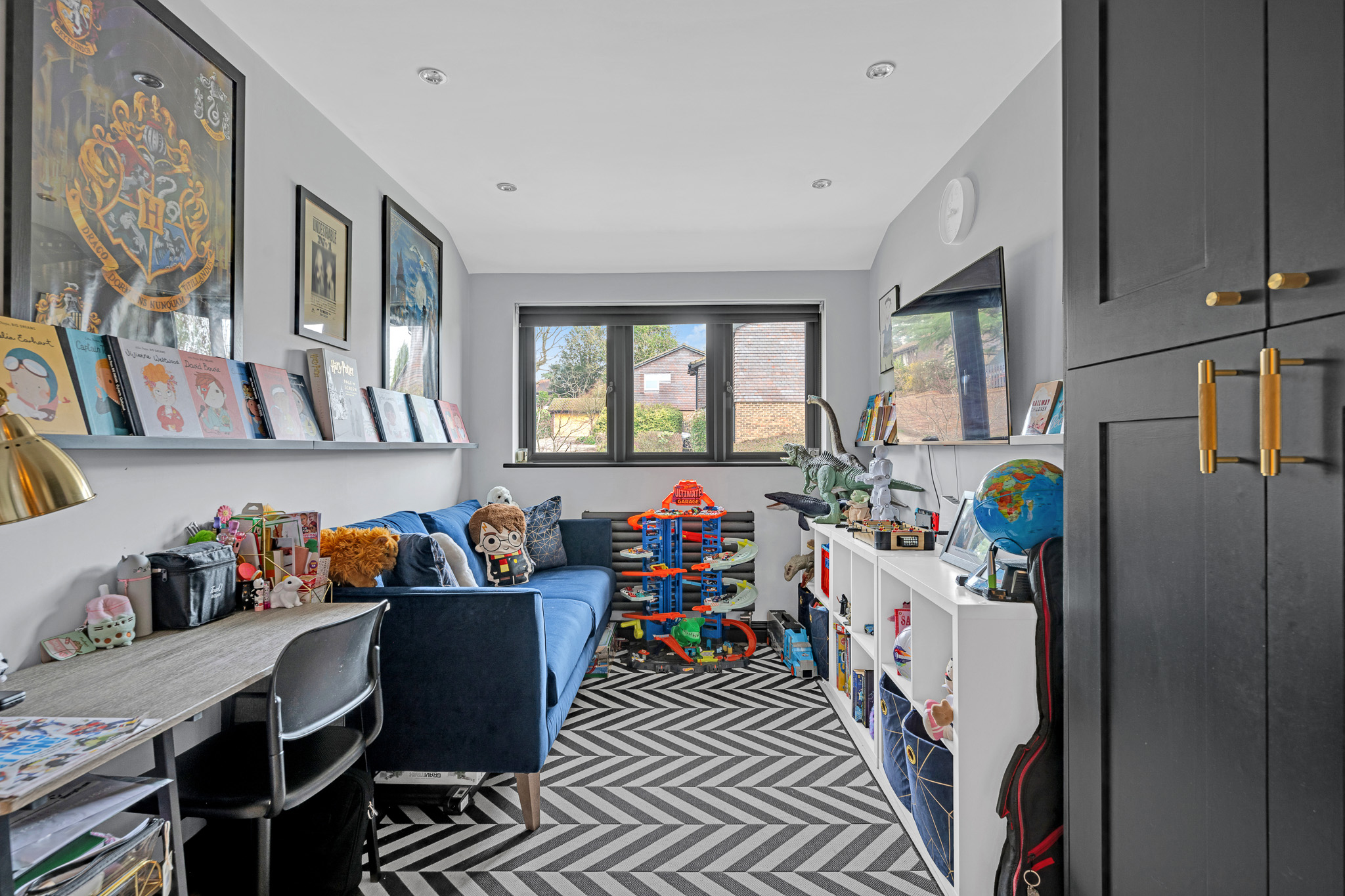 A substantial utility room provides excellent additional storage and laundry space, ensuring the main living areas remain clutter-free. To the front of the house, a separate reception room currently arranged as a den/playroom offers flexibility as a snug, office or formal lounge. A guest cloakroom completes the ground floor.