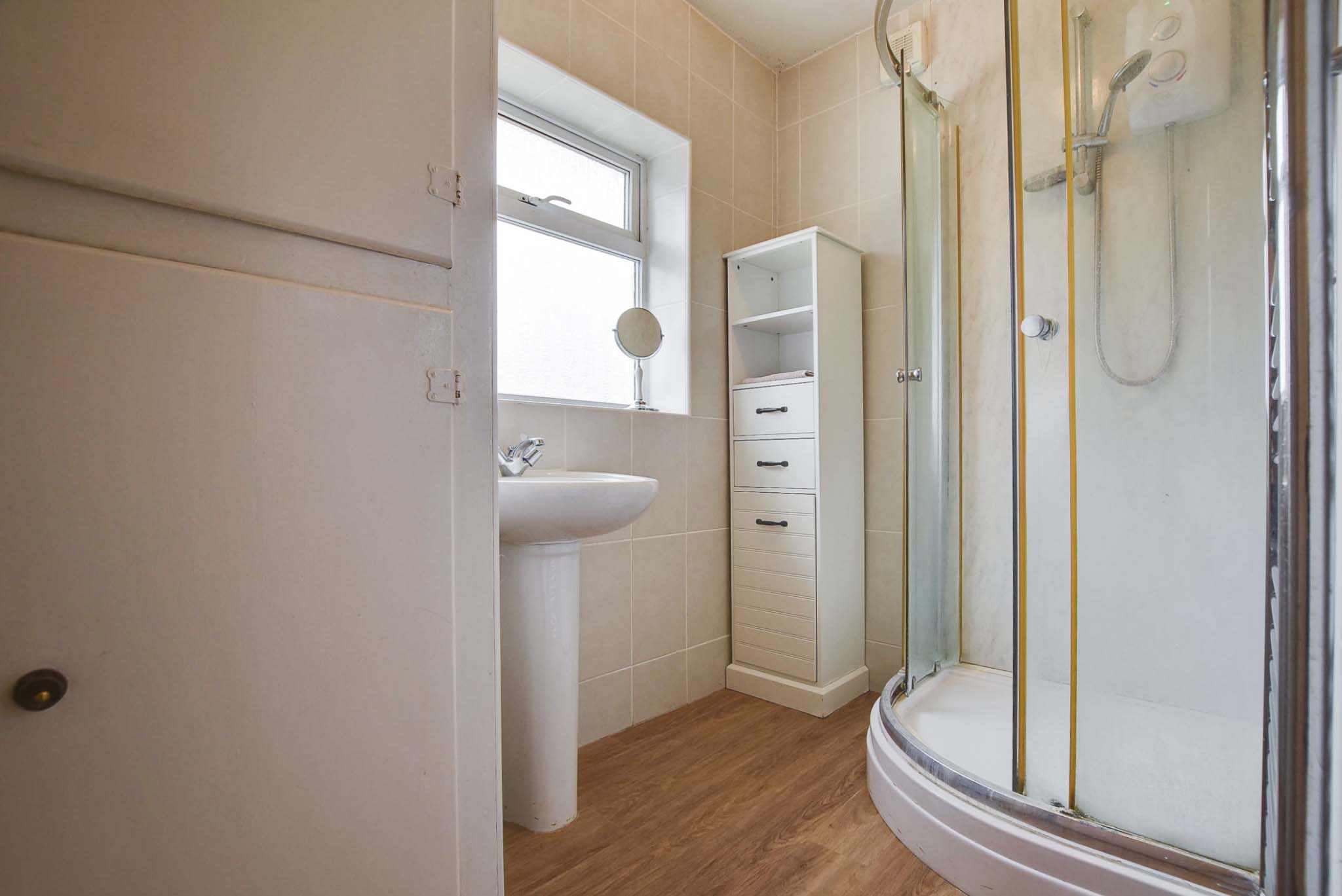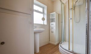 With double glazed window to the rear elevation, laminate floor, tiled walls, shower cubicle, storage cupboard housing gas boiler, wash hand basin, ladder towel rail/radiator.