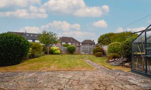 With paved patio seating area, lawn, flowerbeds and shrubs, fencing to the perimeter.