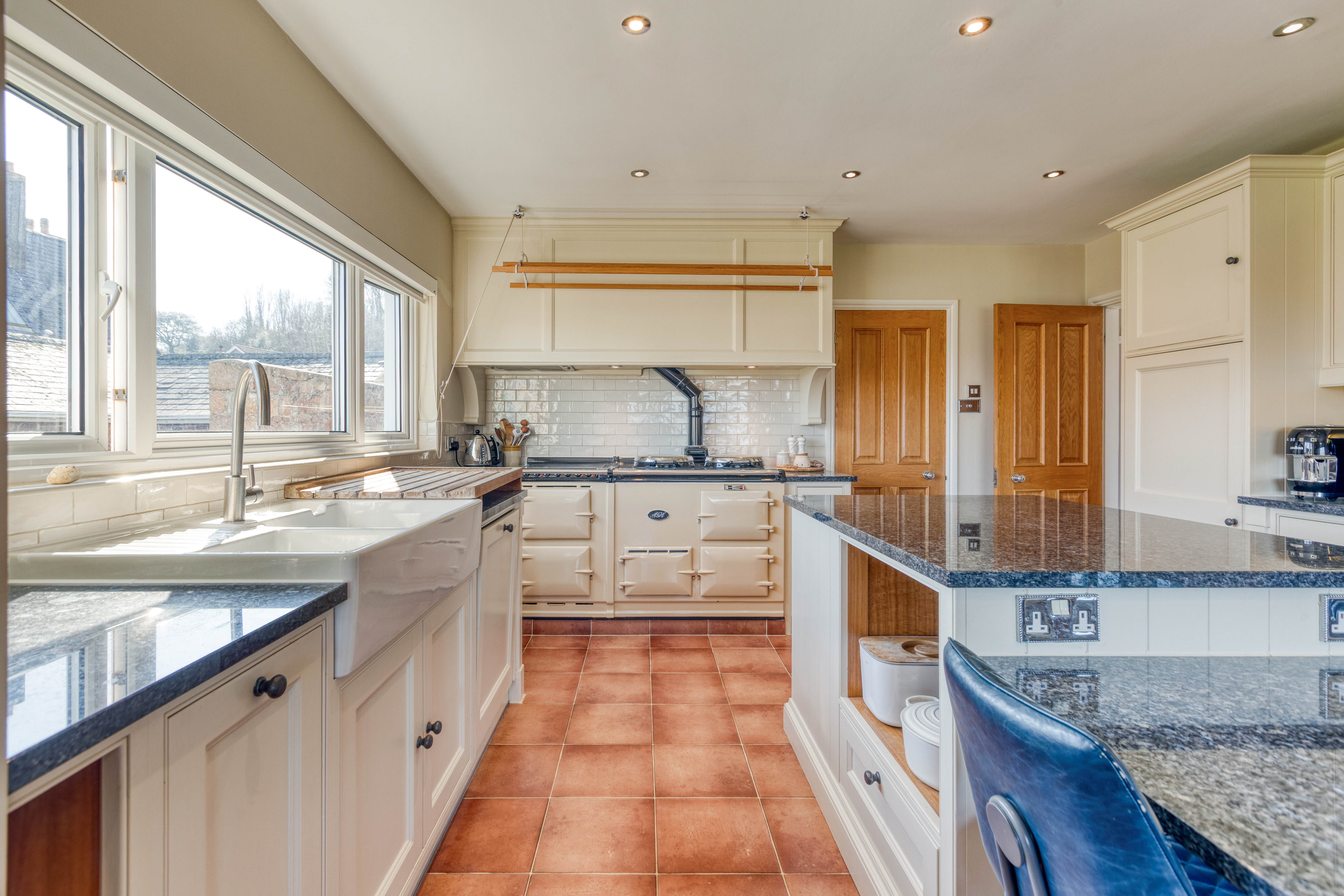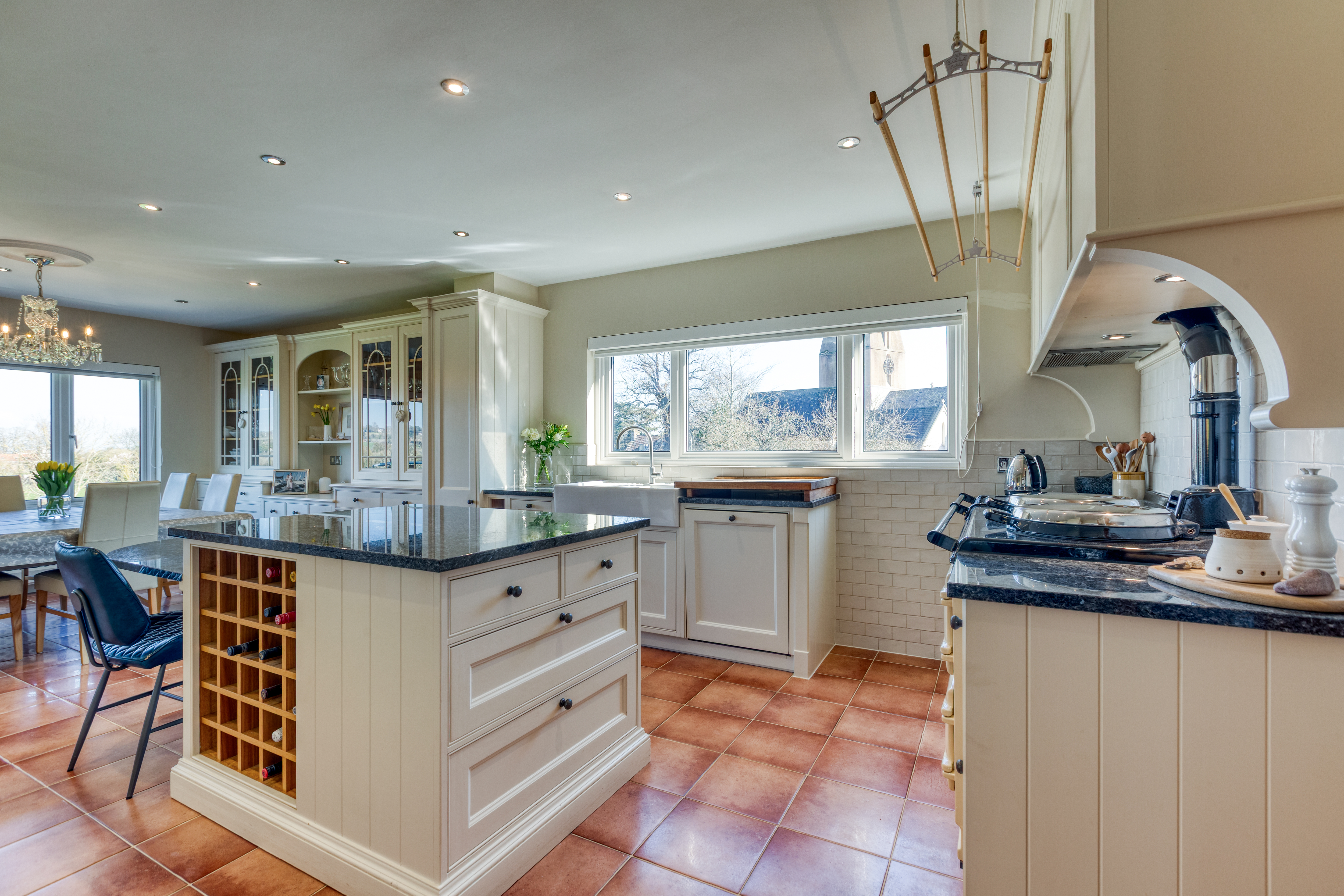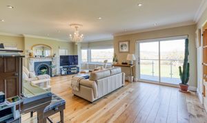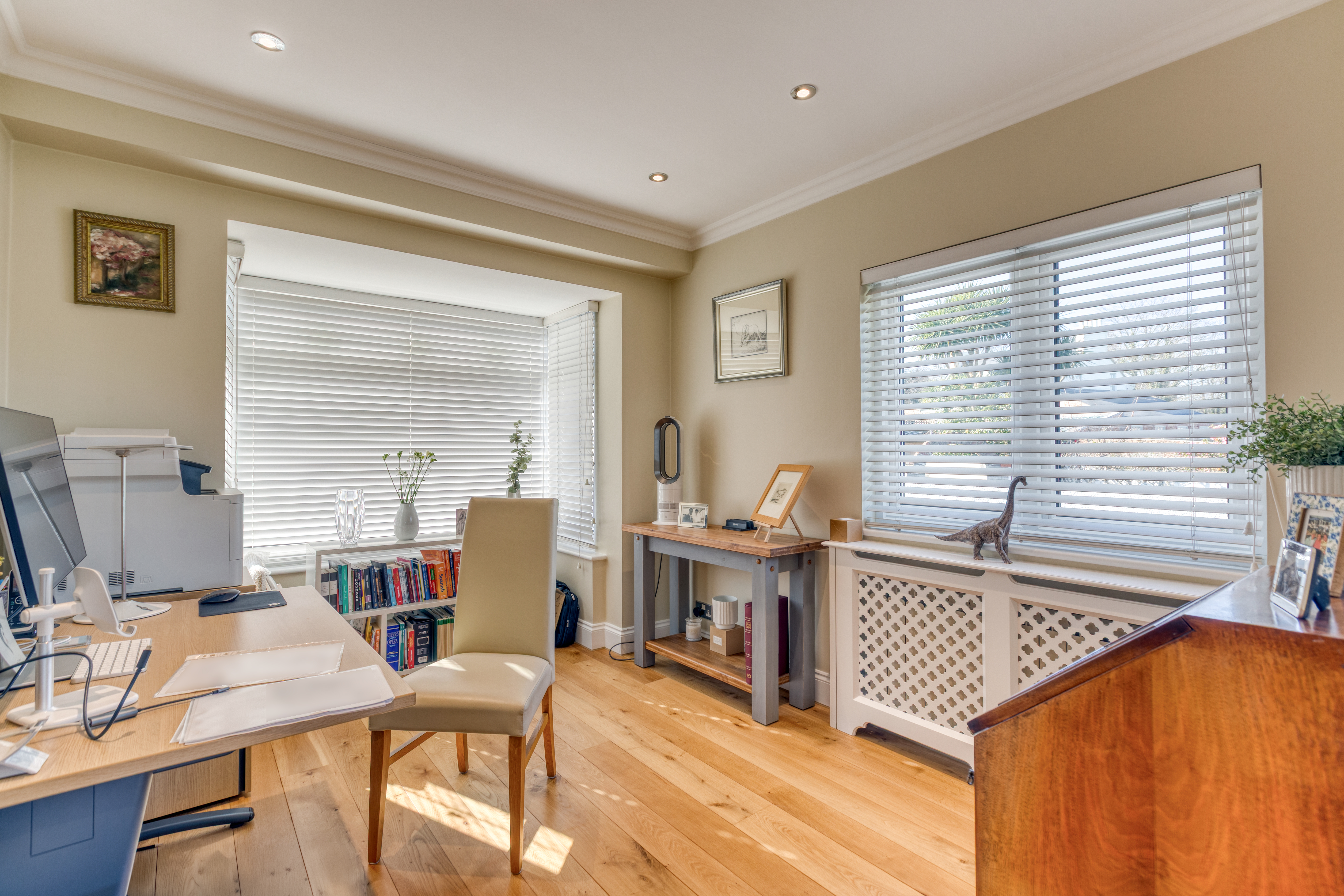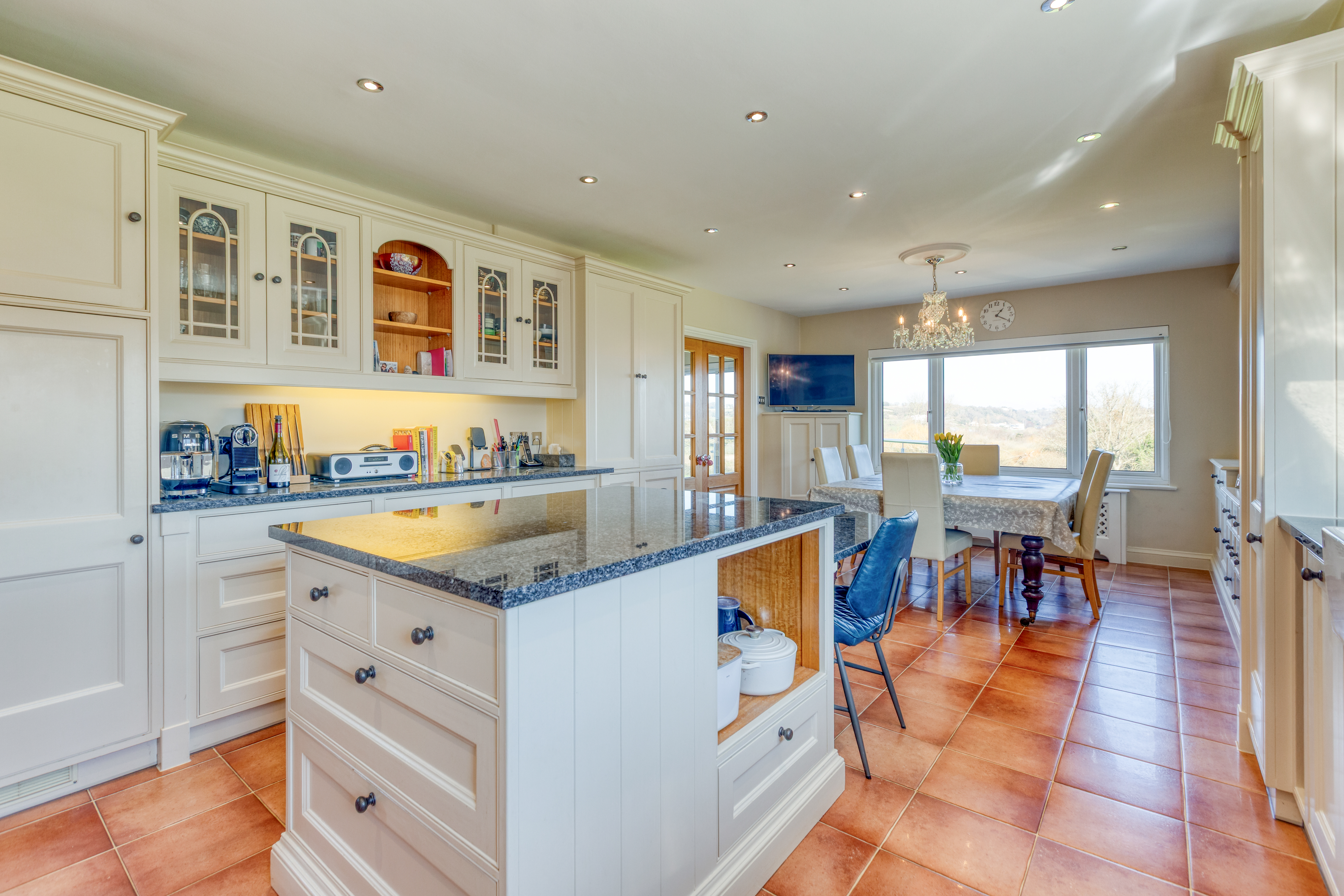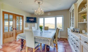 The accommodation is thoughtfully arranged to take full advantage of the surrounding countryside. A bright sitting room enjoys attractive rural views and opens directly onto a balcony, creating an ideal space to relax while overlooking the field and countryside beyond. The property also benefits from two dedicated offices, providing excellent flexibility for home working or study.
