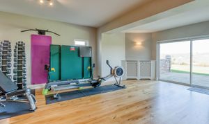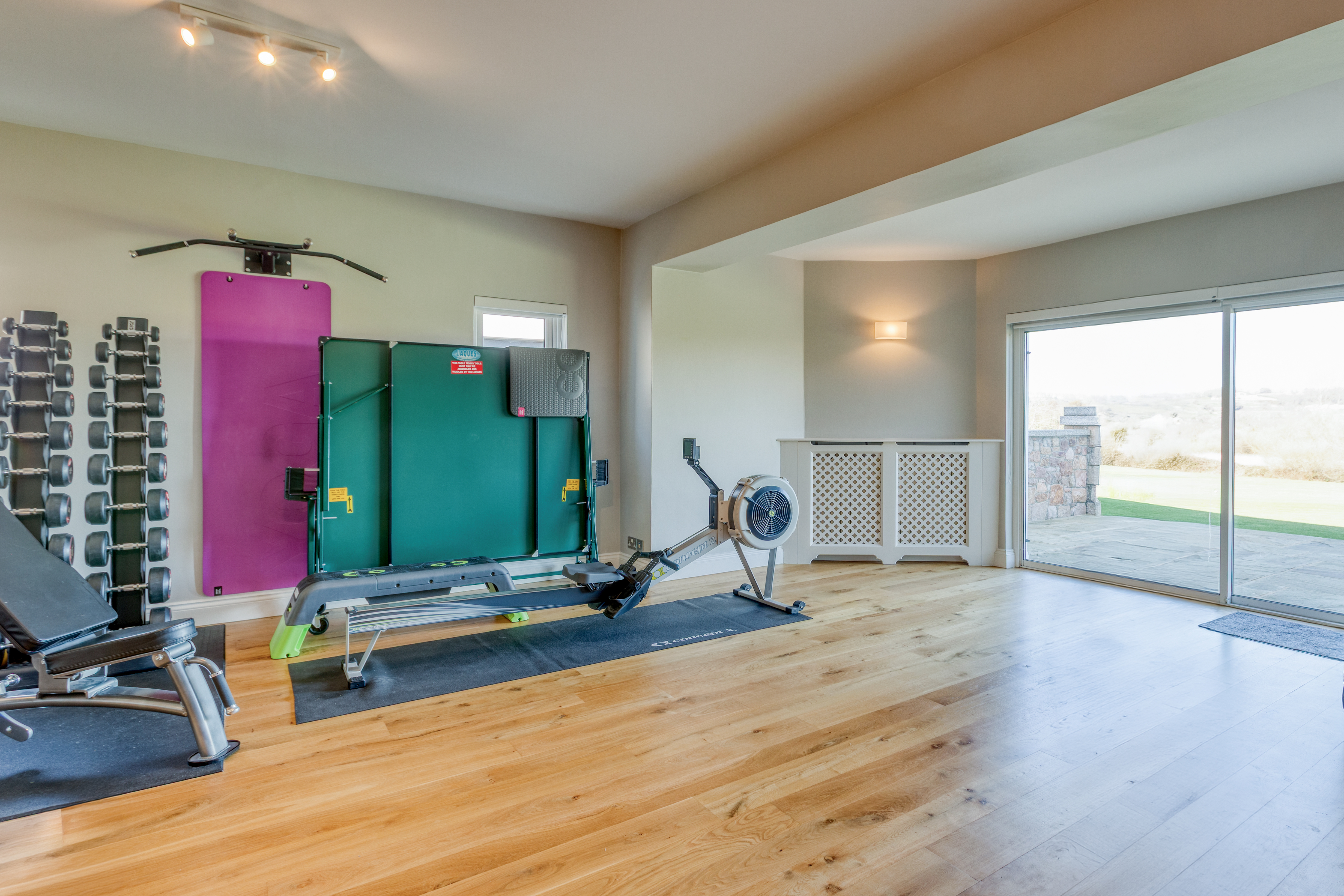 On the lower ground floor, a spacious gym or games room opens onto a terrace, extending the living space outdoors and offering a versatile area for recreation, entertaining or family use.