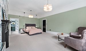 The master bedroom feels more like a hotel suite with its drop reading pendants flanking a space for a sizable bed, a separate seating area by the wide picture window, a cast-iron period fireplace, column radiators, and striking peacock feature wallpaper.