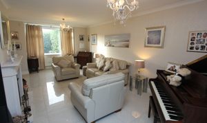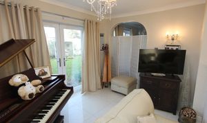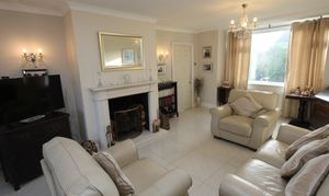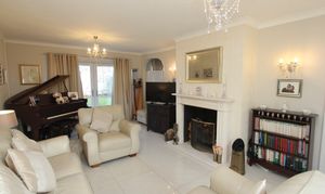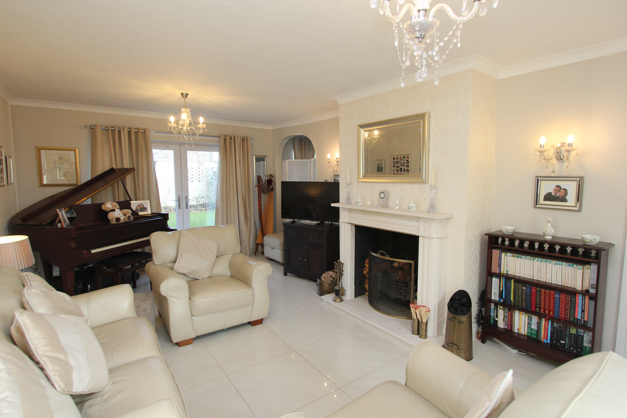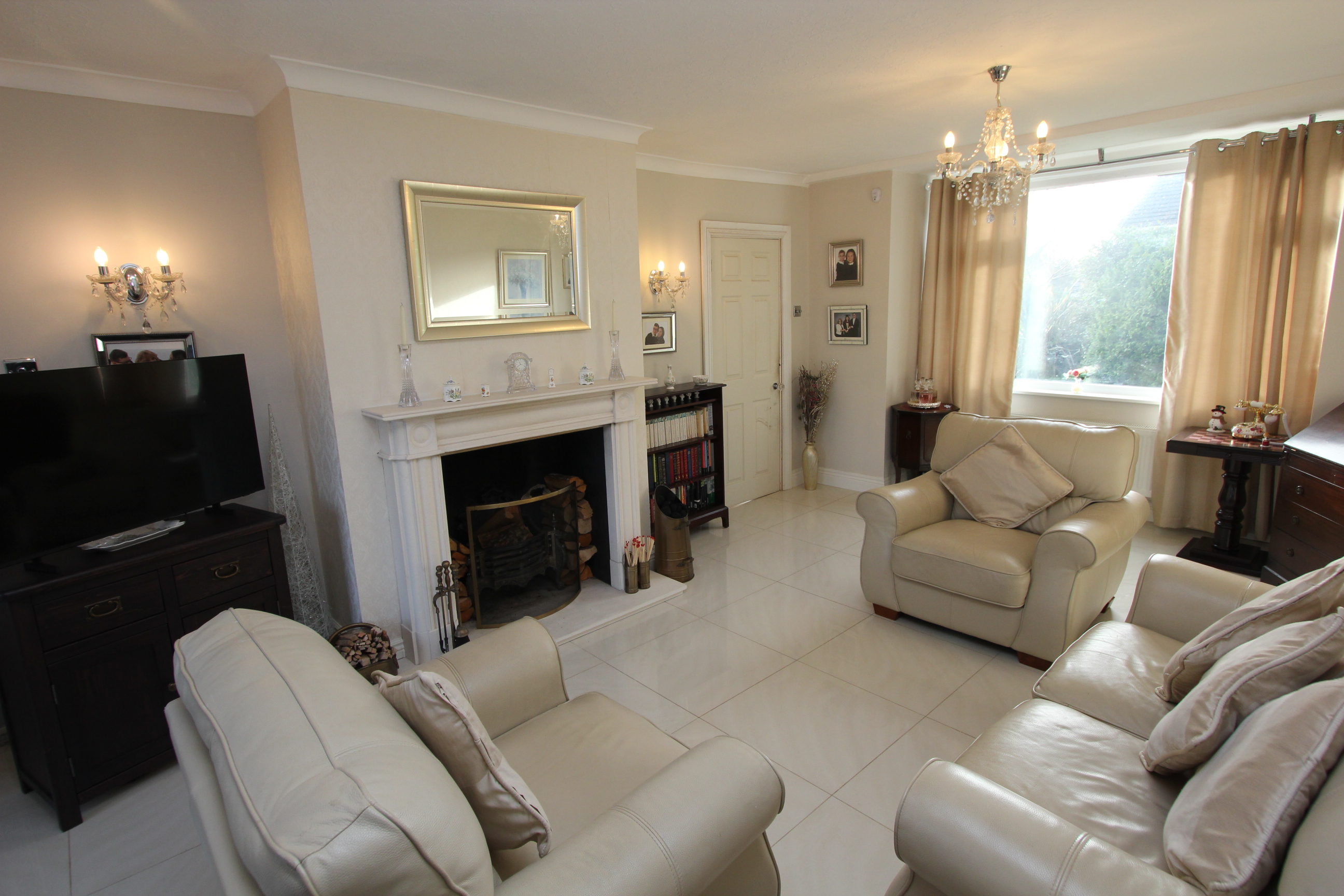 UPVC window to front. Radiator. Porcelain floor tiles. Open fire with limestone fireplace surround. UPVC French doors to rear. Opening to dining room.