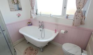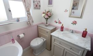 UPVC opaque window to front. Low level WC. Wash hand basin with mixer tap.