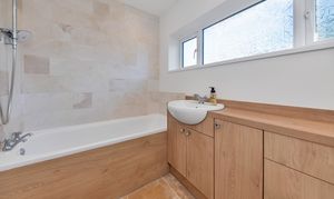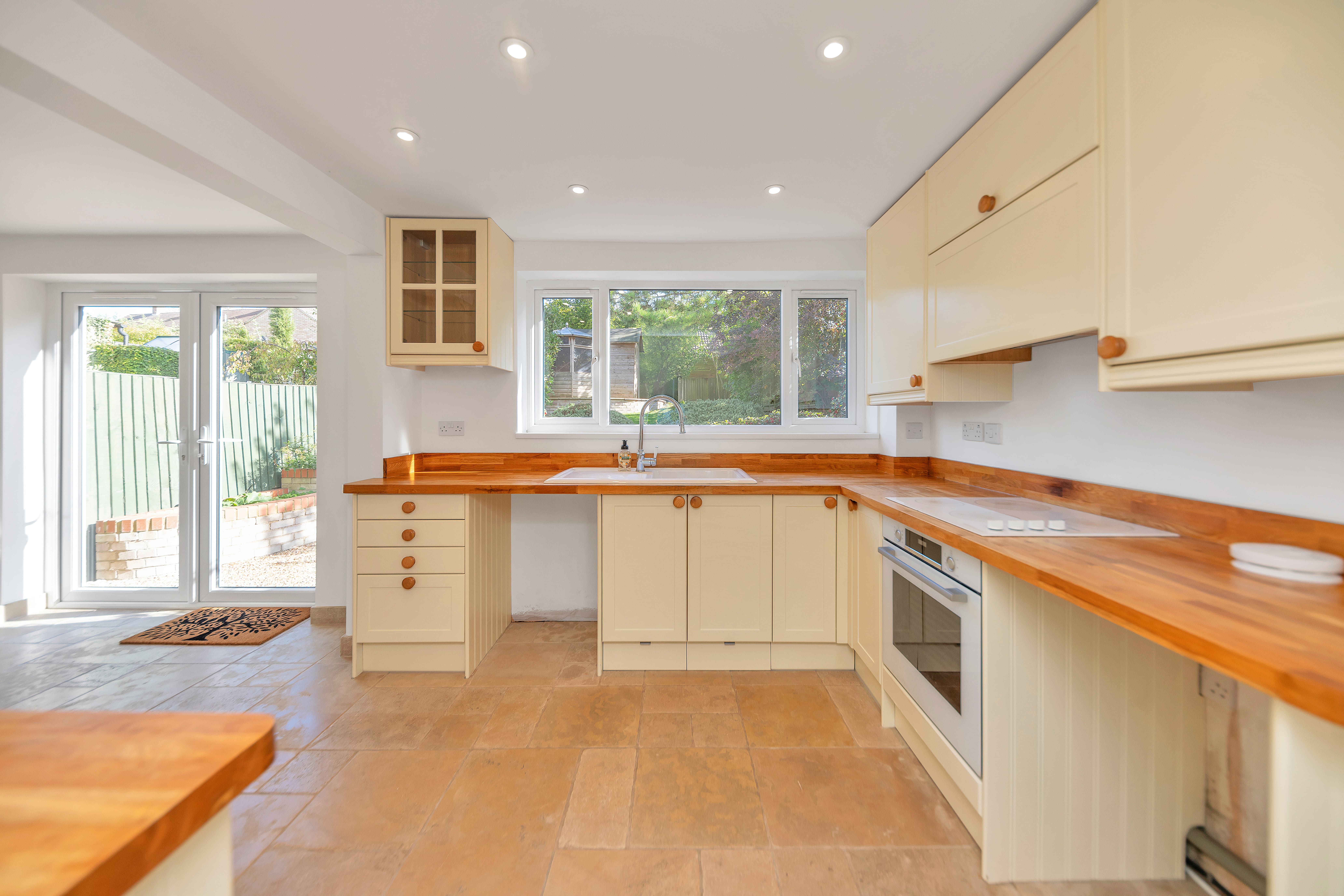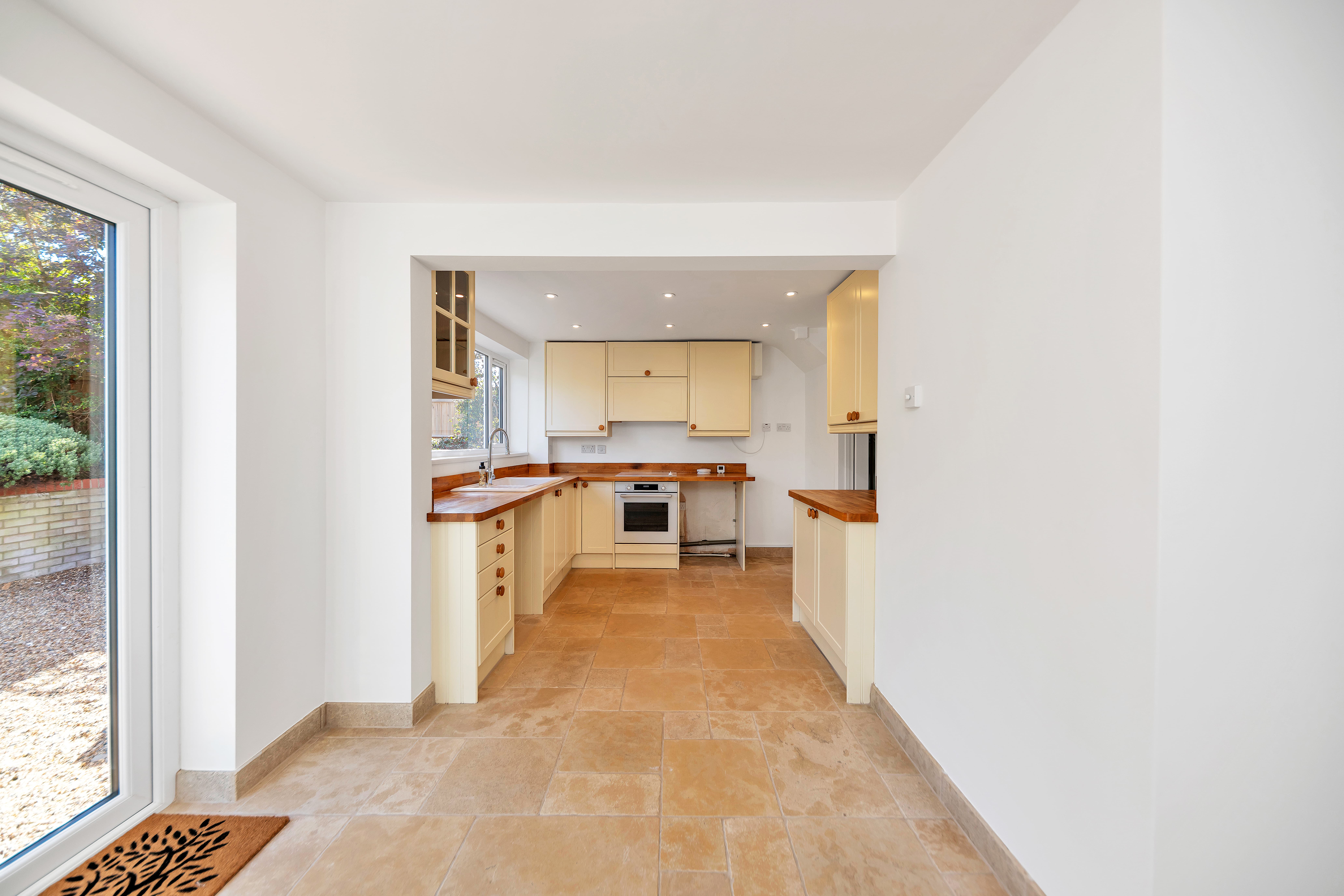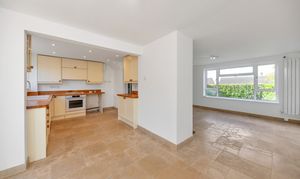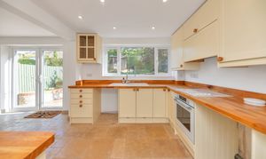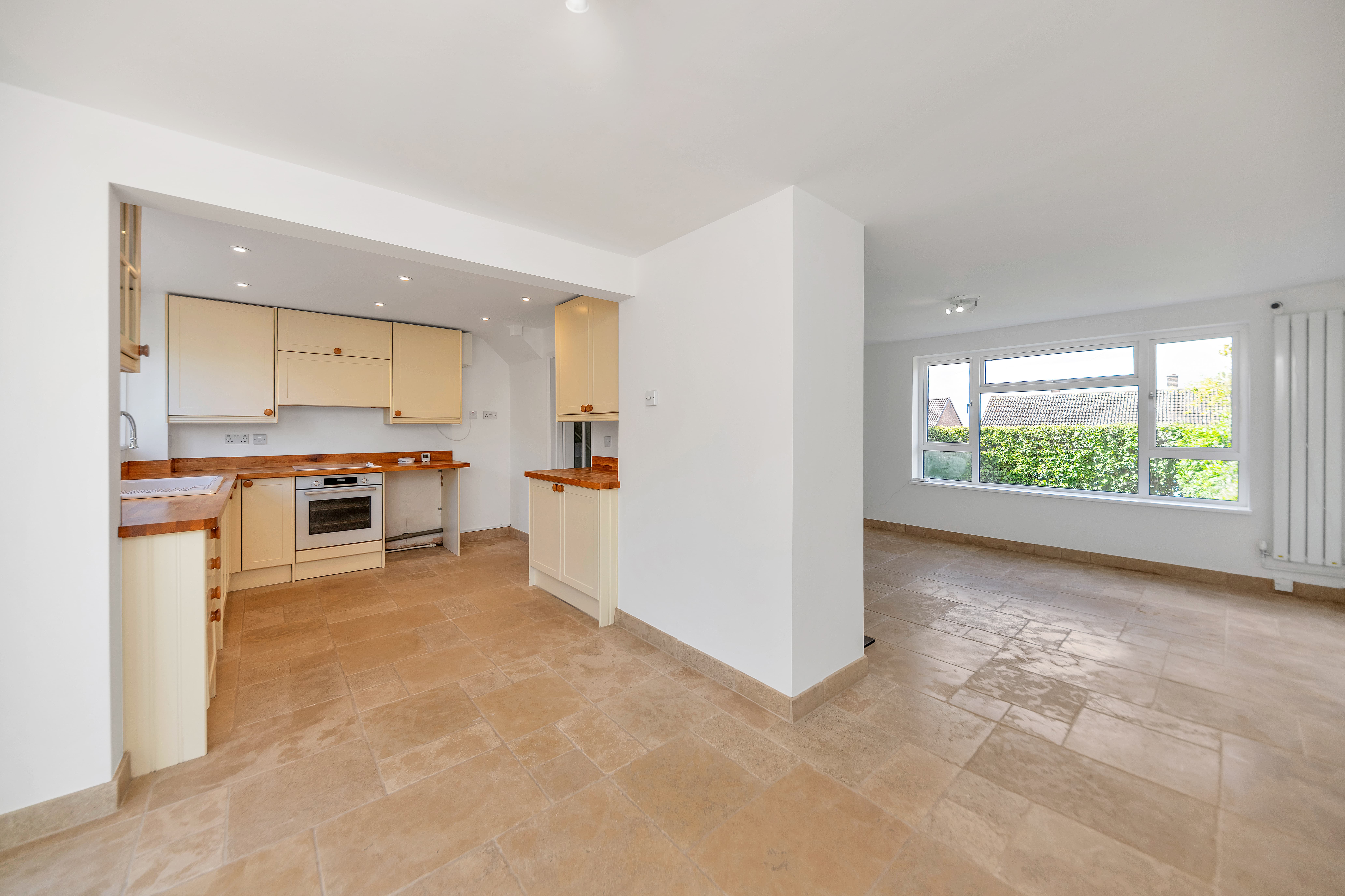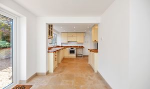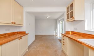 The kitchen/dining room is nicely open-plan, benefiting from a large window and double French doors to a garden aspect, a range of base and wall units, solid oak worktops, natural limestone flooring, an integrated oven and hob, and space for a fridge/freezer, dishwasher, washing machine and other small kitchen appliances.