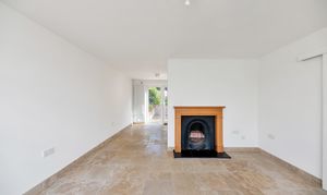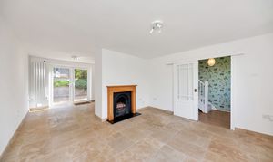 The lounge enjoys a lovely open-plan atmosphere with the kitchen too, featuring a large window to a front aspect, natural limestone flooring, central spotlights, a feature cast iron fireplace, and ample space for a variety of lounge and storage furniture.