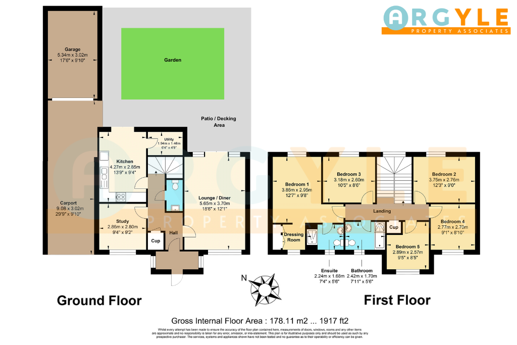 Upstairs, the master bedroom is a large room with carpet flooring, UPVC double-glazed windows overlooking the rear garden, and access to both a dressing room, which features built-in wardrobes and a UPVC window to the front. The master ensuite includes a walk-in shower, toilet and sink, with tiled walls, mixer tap to basin, and heated towel rail. Bedrooms two, three and four are all good-sized doubles, with bedrooms two and three overlooking the rear garden and bedroom four at the front of the property. Bedroom five is another double or generous single at the top of the stairs, adjacent to the family bathroom. The family bathroom features a three-piece white suite with shower over bath, practical and easy to clean whilst maintaining a bright and airy feel. All bedrooms are carpeted with neutral decoration and gas central heating throughout.