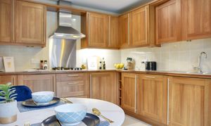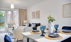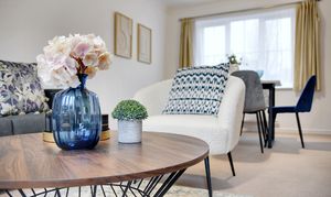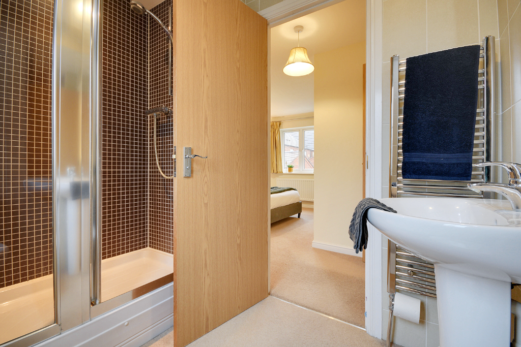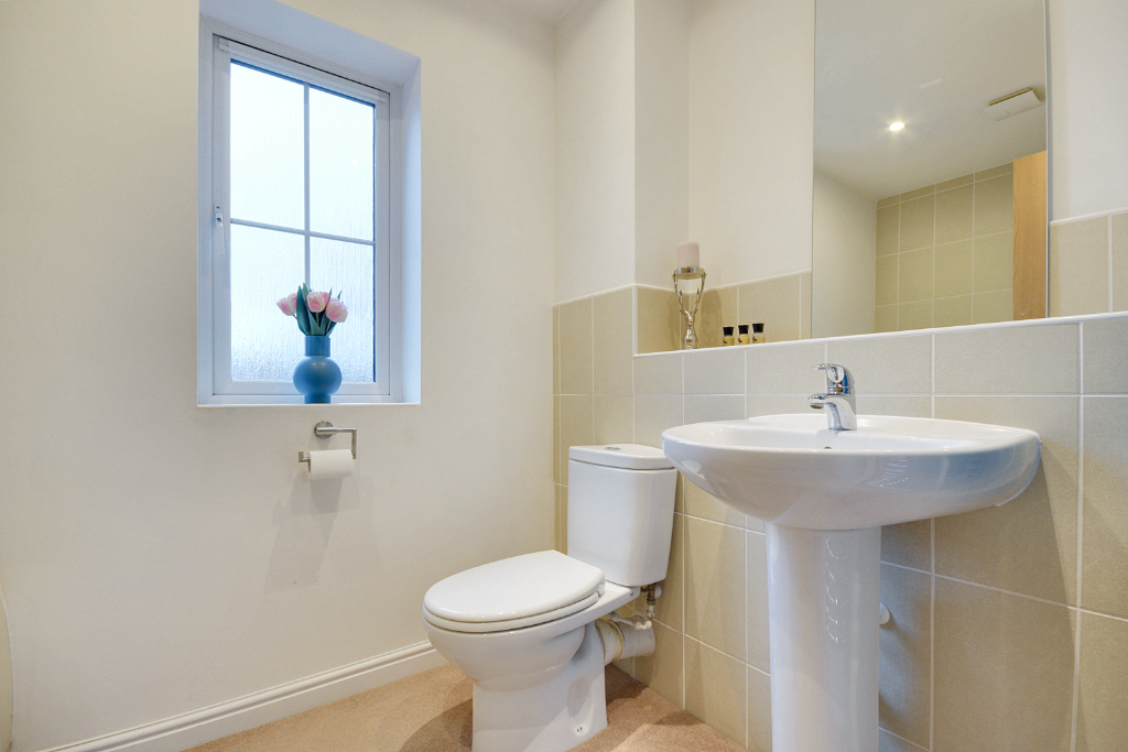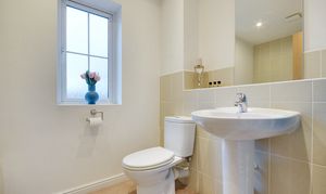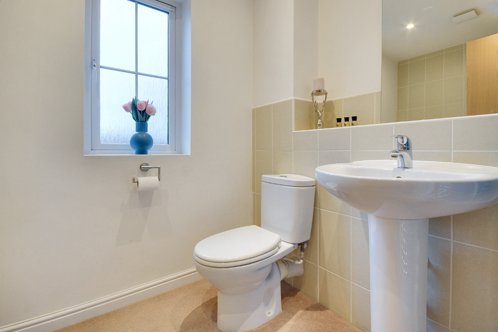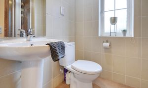 Featuring a three-piece white suite and shower over bath, this family bathroom is practical and easy to clean whilst maintaining a bright and airy feel.