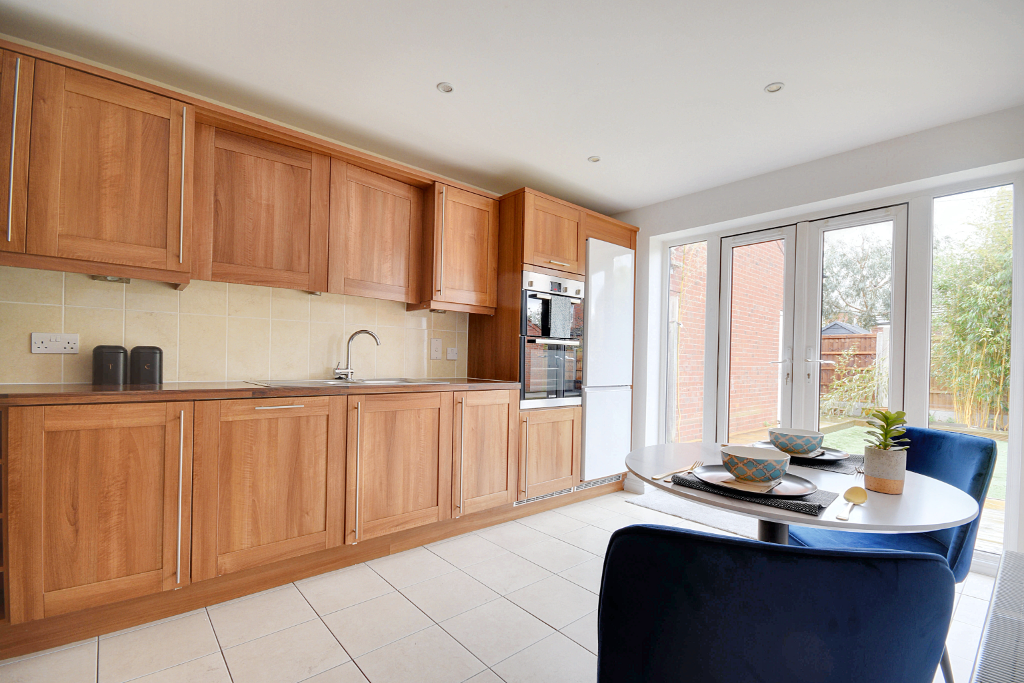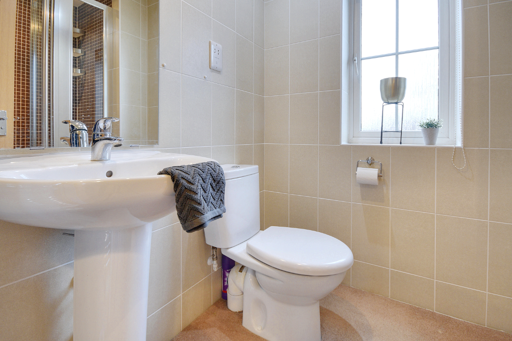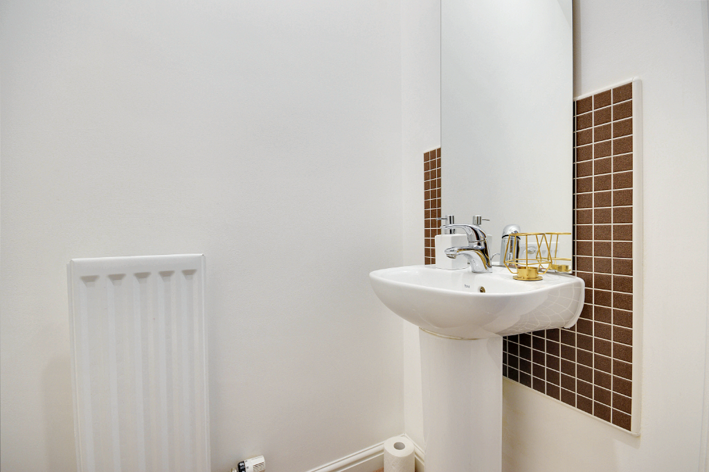 The ground floor is designed for practical family living. The modern kitchen features shaker-style units, a gas hob, an integrated dishwasher, an extractor fan, and tiled flooring. UPVC double-glazed patio doors open onto the garden, and there's onward access to the utility room, which houses the gas boiler (fitted in 2022) feeding a megaflow tank. This ensures constant hot water and the ability to capitalise on economical energy tariffs. The utility room also provides additional worktop space, storage, space for a washing machine, and a second sink.