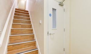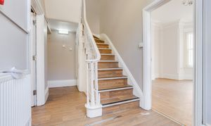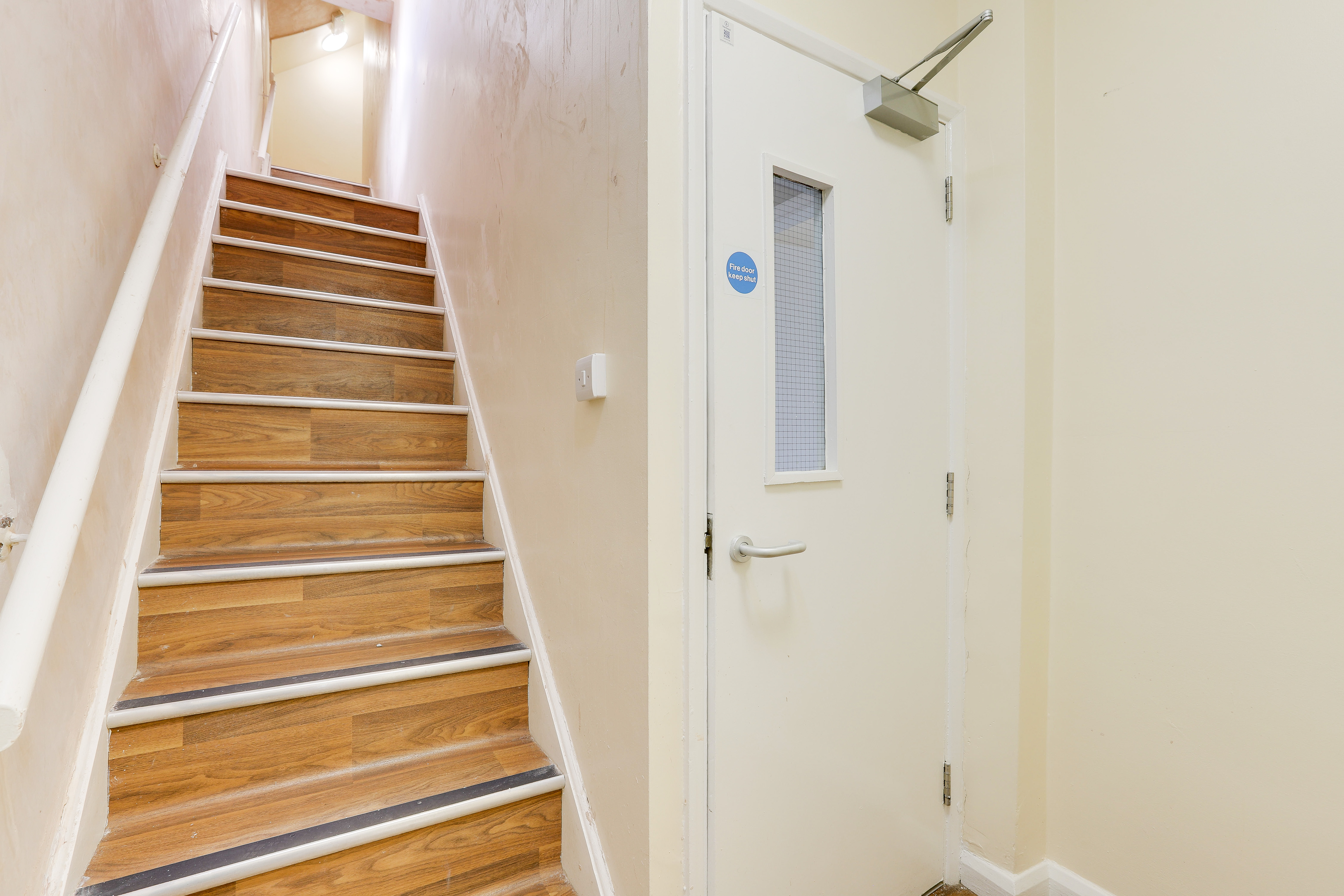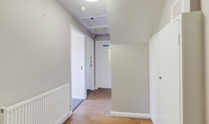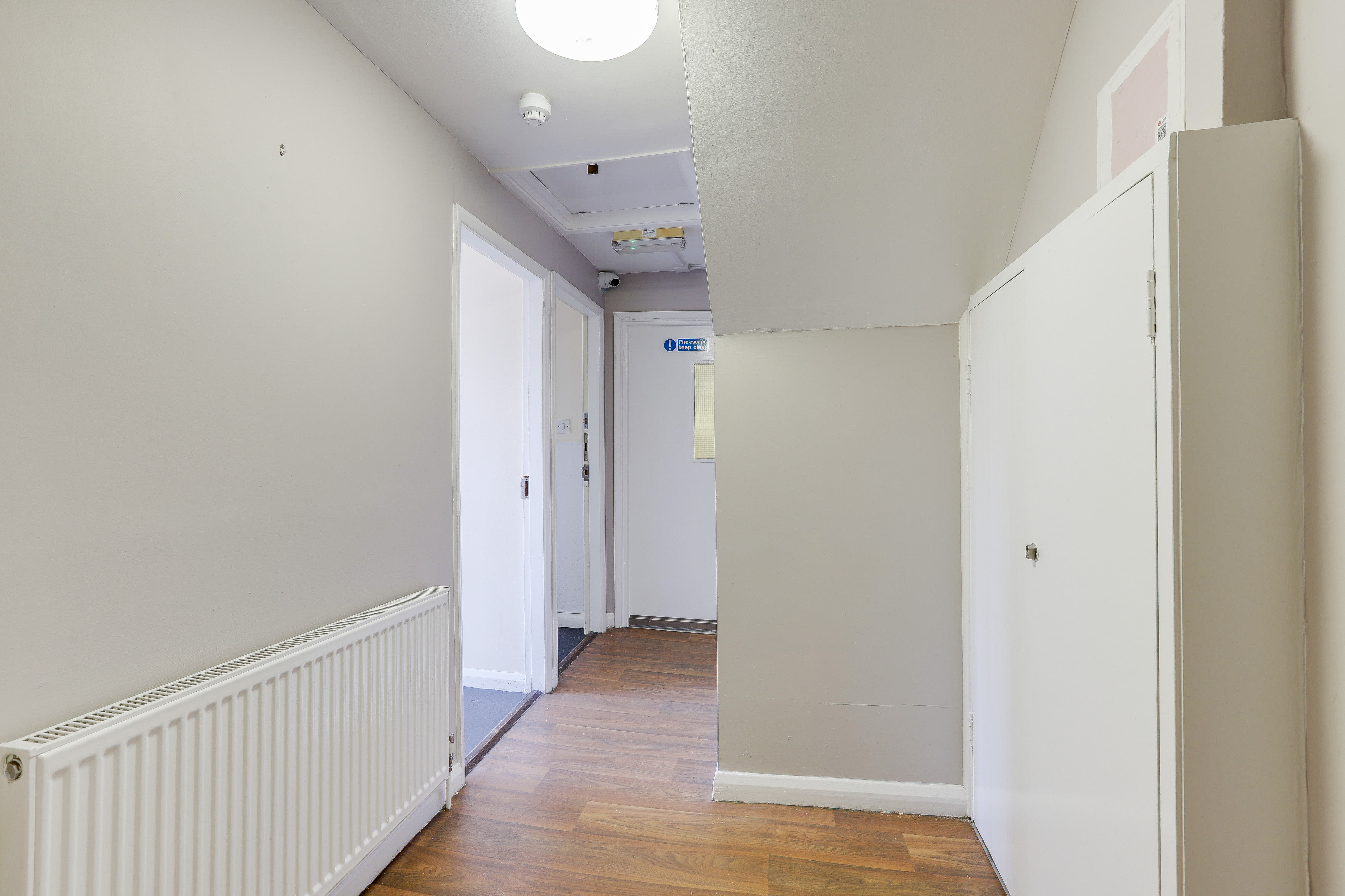 The corridor has wood-effect flooring, a radiator, and access to the stairwell.